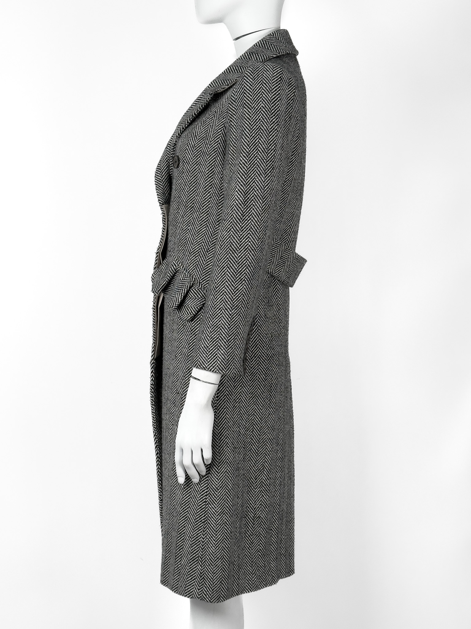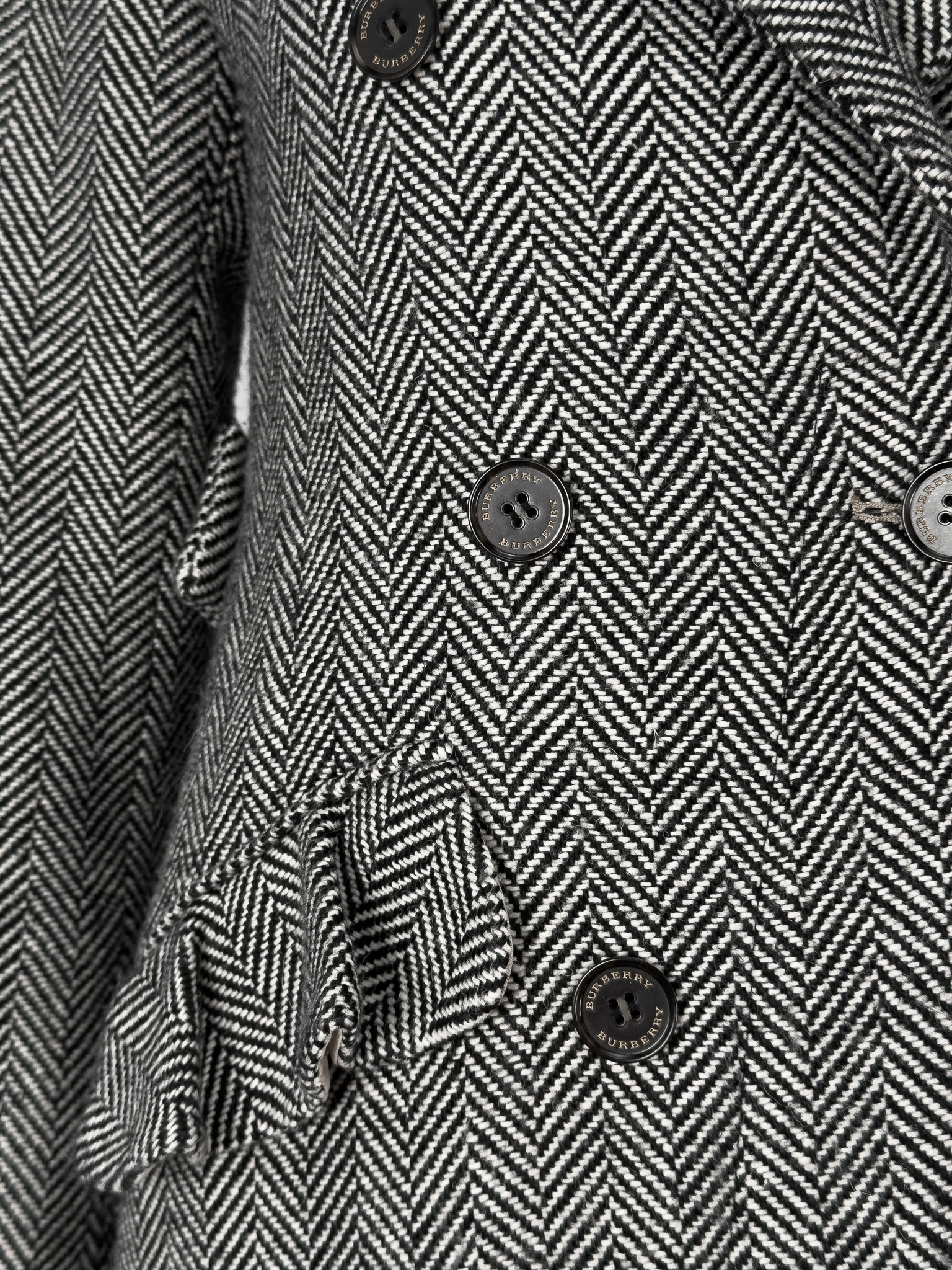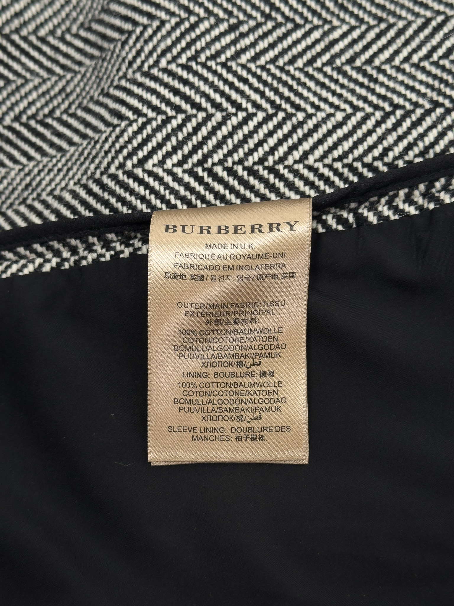"Czarno-biały wełniany płaszcz w jodełkę, długość midi, dwurzędowy, zapinany na czarne guziki ozdobione złotym logo, dekolt w szpic, taliowany, dwie kryte kieszenie po bokach wykończone klapami w kształcie falban, rozporek, częściowy pasek w tylnej części, częściowa podszewka. Stan bardzo dobry. Rozmiar z metki IT 38. Skład: 100% bawełna. Wymiary: szerokość mierzona od pachy do pachy 49cm, długość całkowita 103cm."