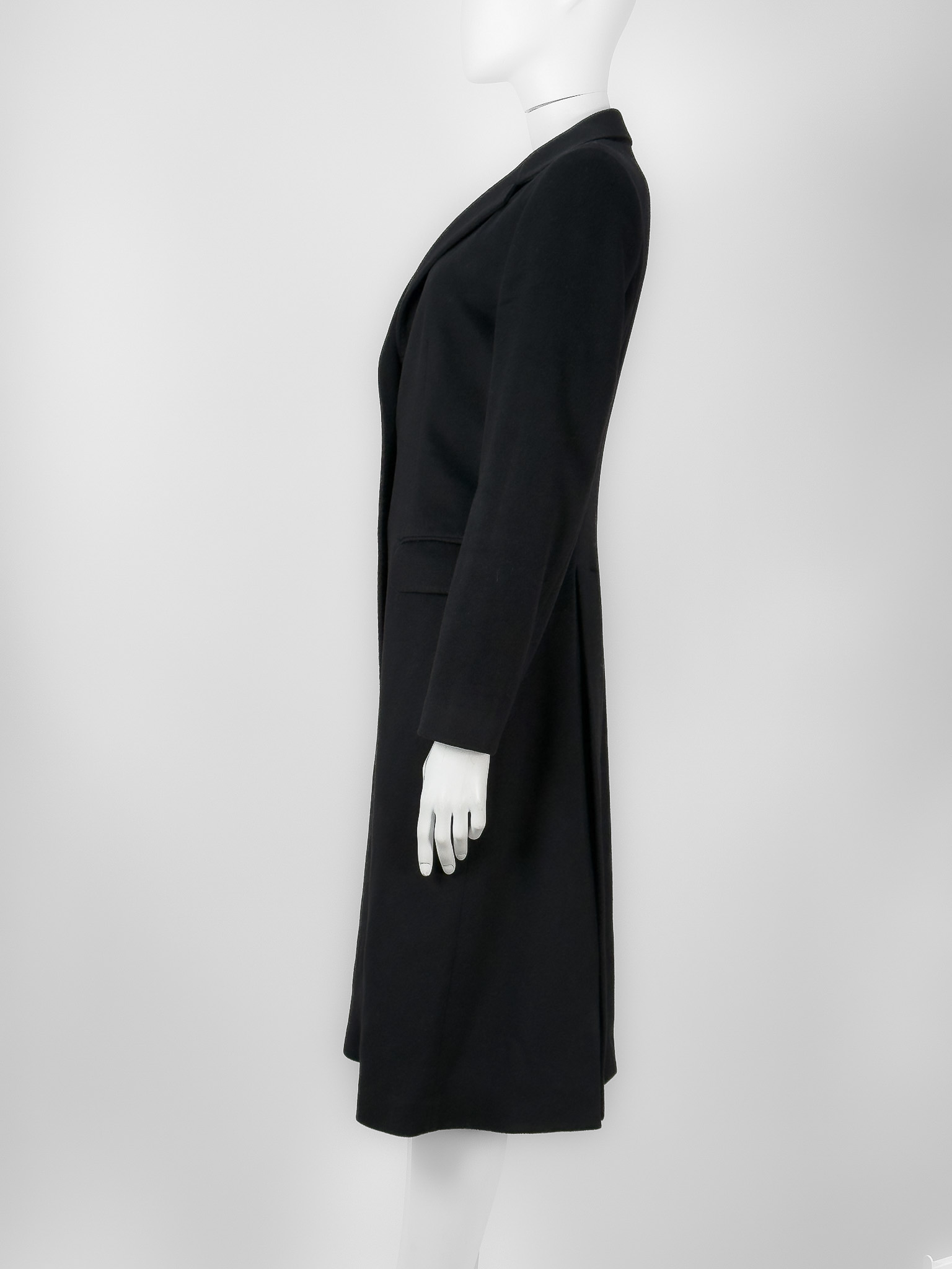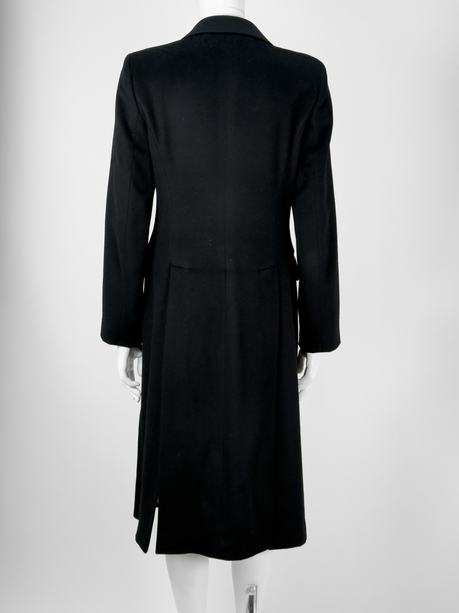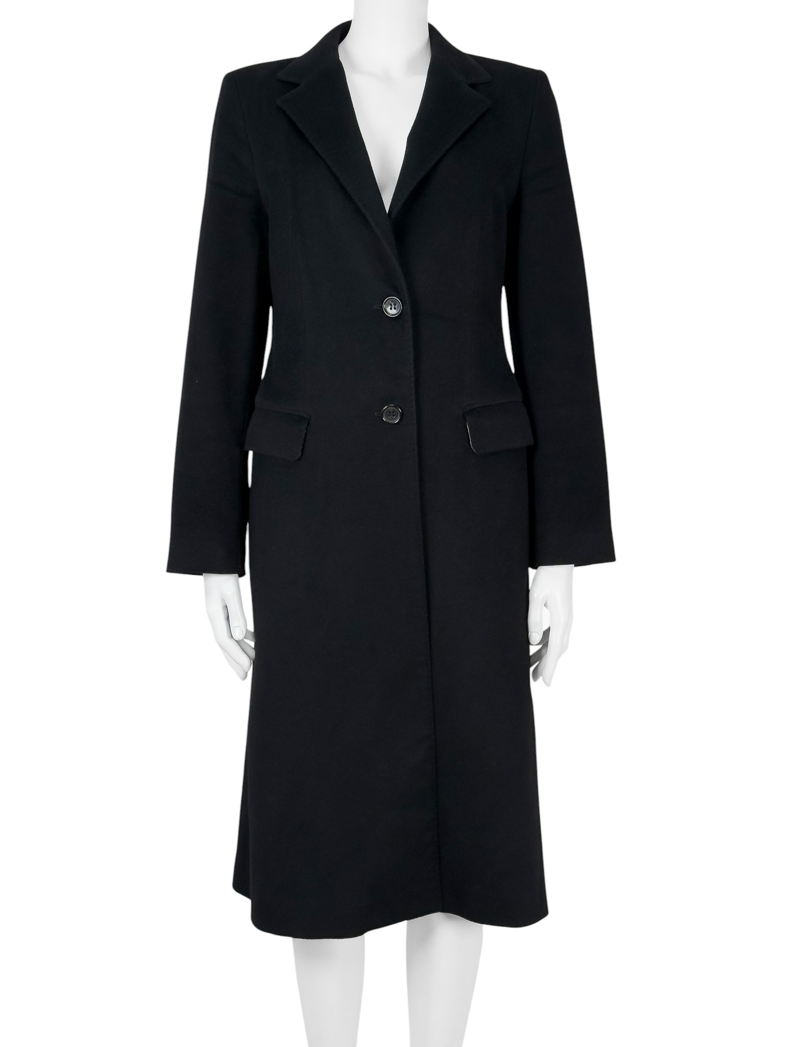 "Długi czarny płaszcz o prostym kroju, dwa rozporki z tyłu, zapinany na dwa guziki, dwie kieszenie po bokach, delikatne poduszki na rękawach. Płaszcz wykończony jest podszewką w beżowym kolorze. Wykonany z tkanin Loro Piana. Brak metki z rozmiarem. Rozmiarowo wypada jak S/M. Skład - 100 % wełna dziewicza; podszewka: 100% wiskoza; 100% cupro. Wymiary: szerokość mierzona od pachy do pachy 48cm, długość całkowita 111cm."