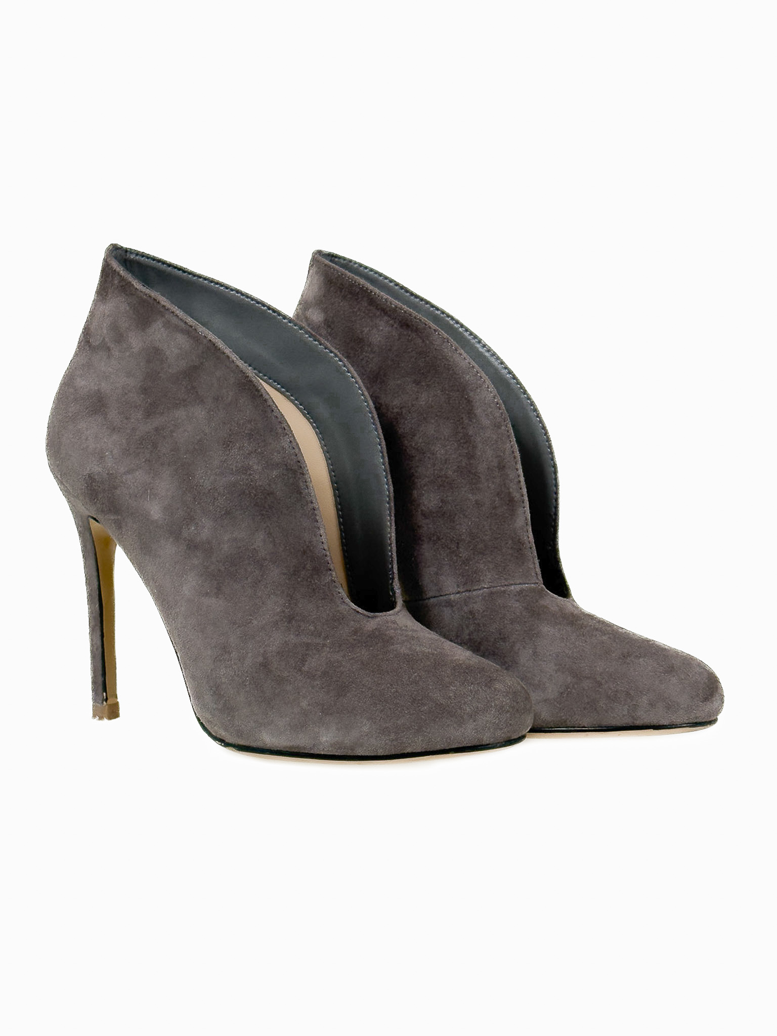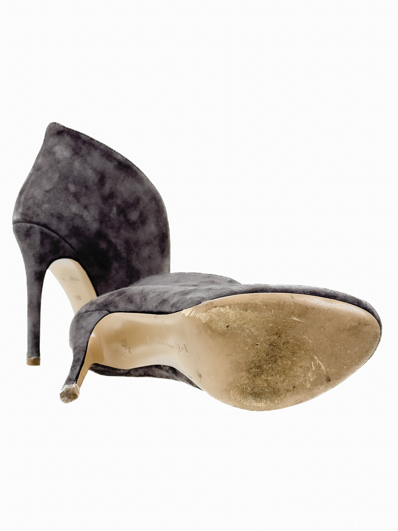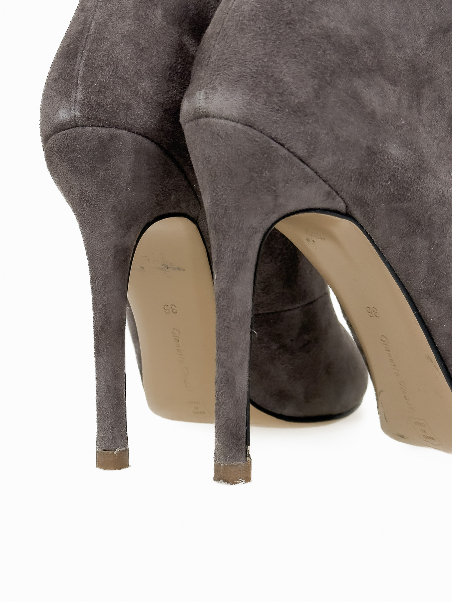 "Szare zamszowe botki na obcasie, z charakterystycznym dla marki wycięciem w centralnej części, zaokrąglone noski, cielista skórzana wkładka. Stan: bardzo dobry, posiadają przetarcia na flekach oraz podeszwie. Rozmiar 36."