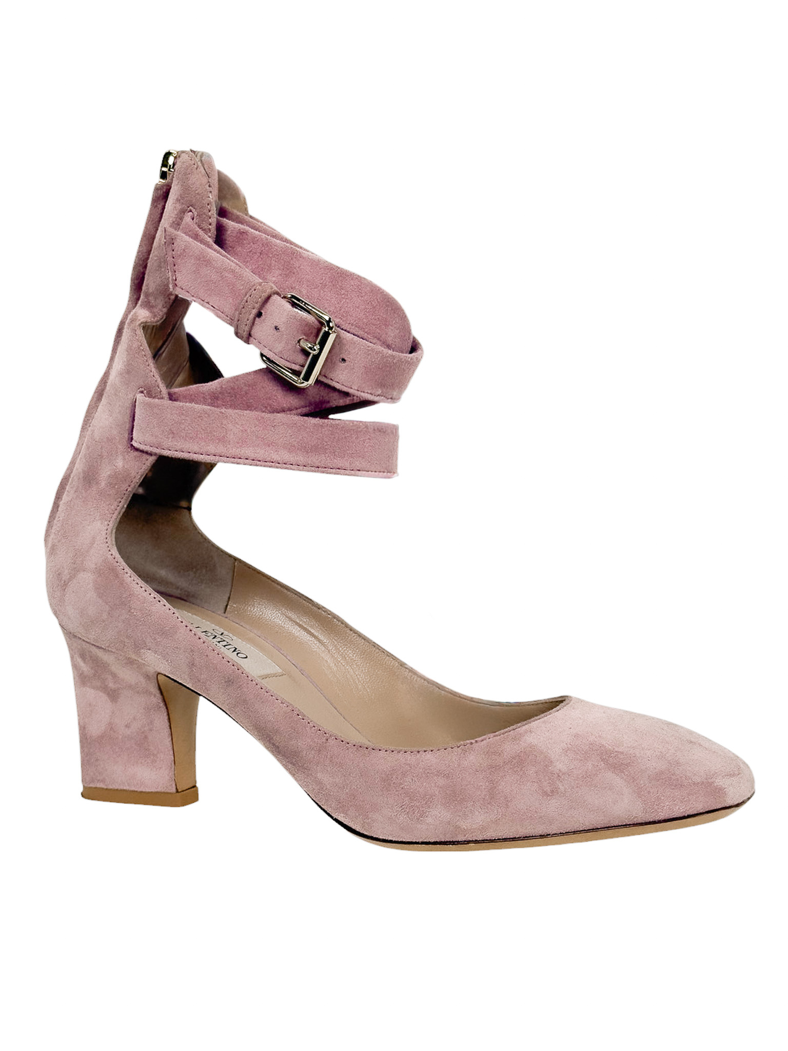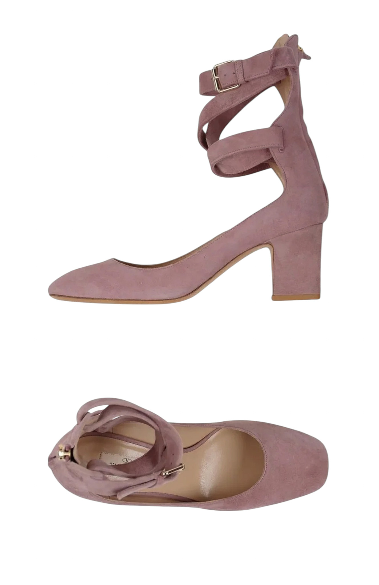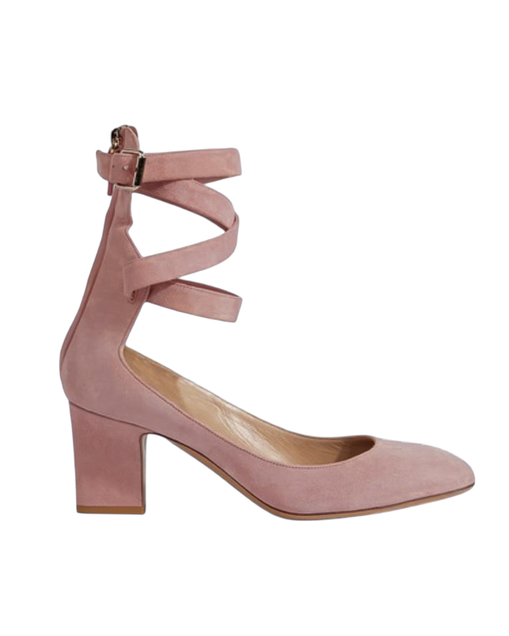 "Zamszowe, różowe czółenka, przeplatane w kostce, zapinane z tyłu na zamek, ścięte noski, cielista skórzana wkładka. Stan: bardzo dobry, zamsz posiada delikatne przybrudzenia. Rozmiar 36,5, wysokość obcasa 6cm."