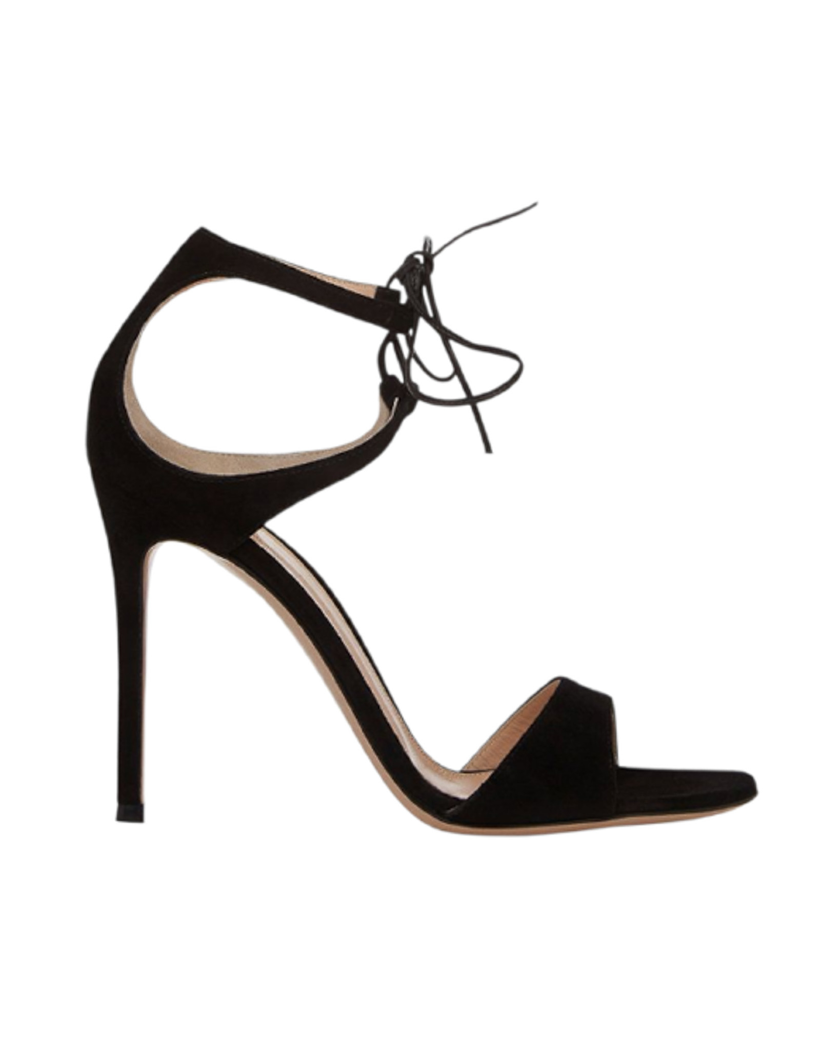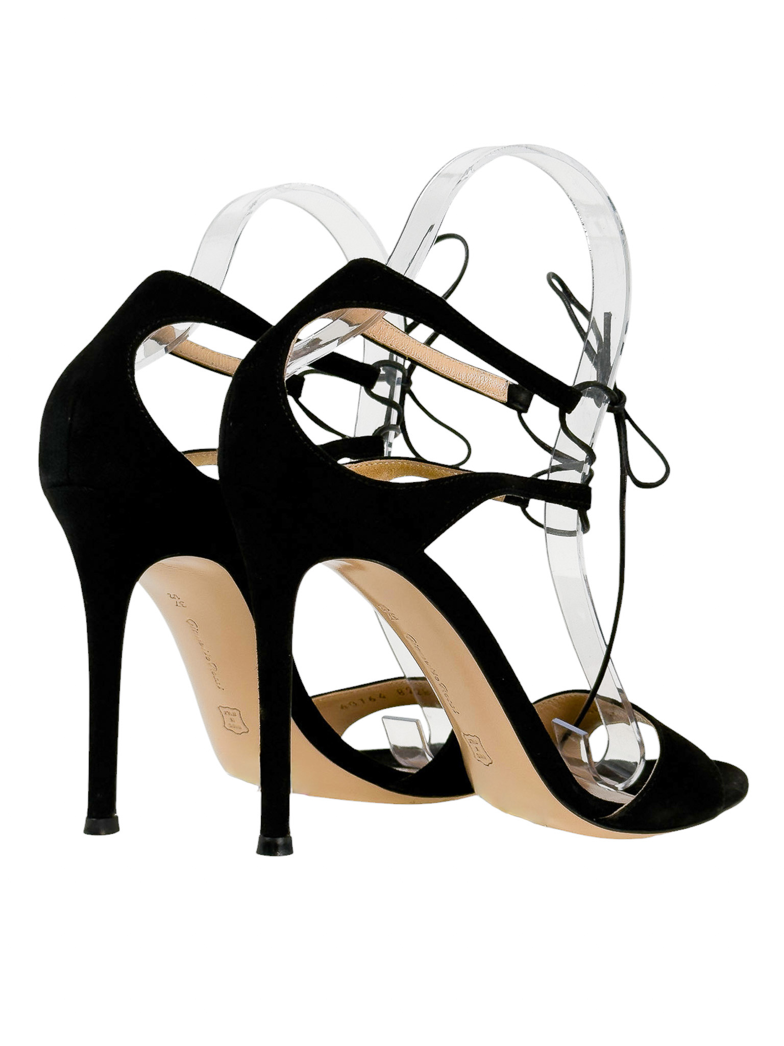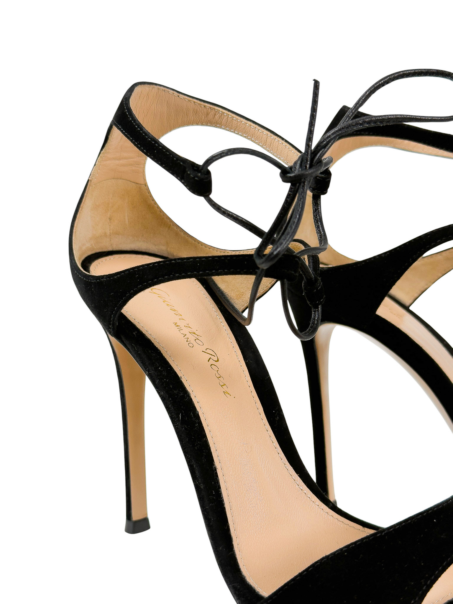 "Czarne zamszowe sandałki z wiązaniem w kostce, zaokrąglone noski, wycięcia bo bokach, częściowa skórzana cielista wkładka. Stan bardzo dobry. Rozmiar 37,5; wysokość obcasa 10,5cm."