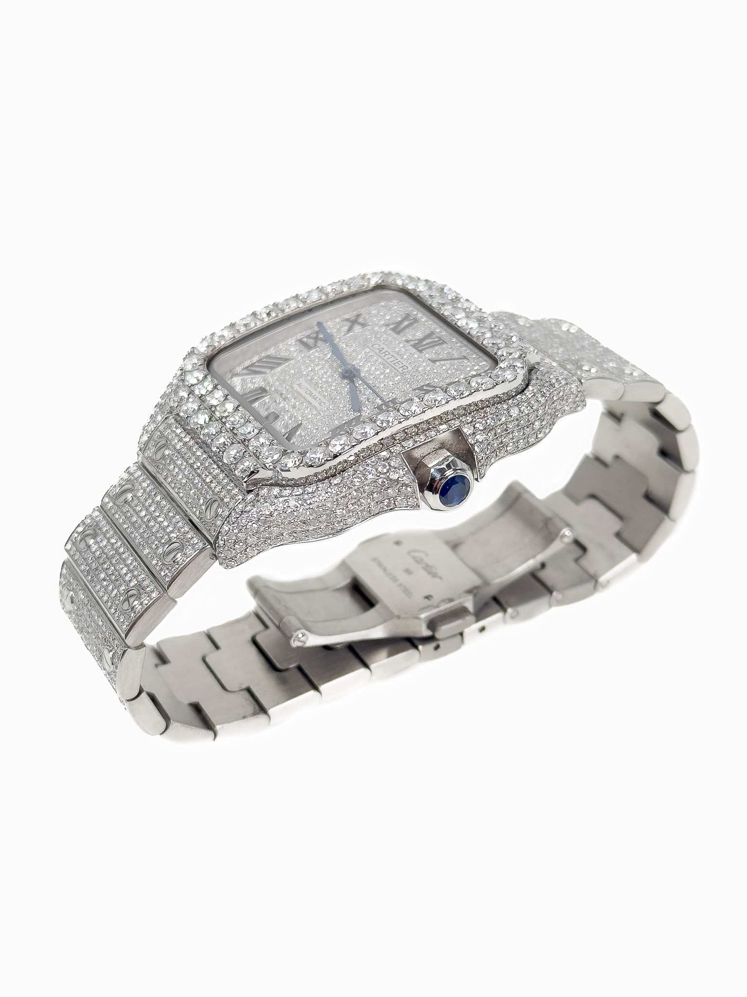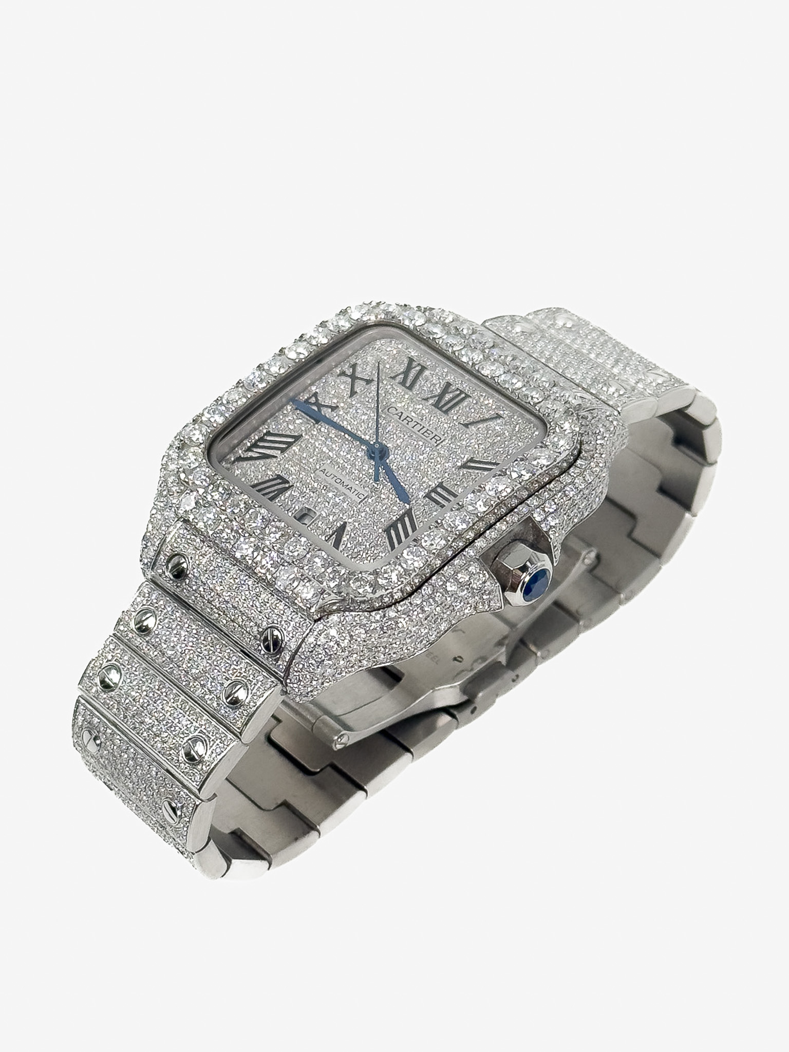 "Cartier Santos ref. WSSA0018, model L. Srebrny zegarek wysadzany diamentami jakości SI/VS u jubilera, wykonany ze stali nierdzewnej, kwadratowa tarcza z cyframi rzymskimi oraz logo marki, niebieskie wskazówki, w zestawie z certyfikatami: na diamenty, oryginalności DREAM WATCH oraz pudełkiem. Stan stan jak nowy, rok 2025."