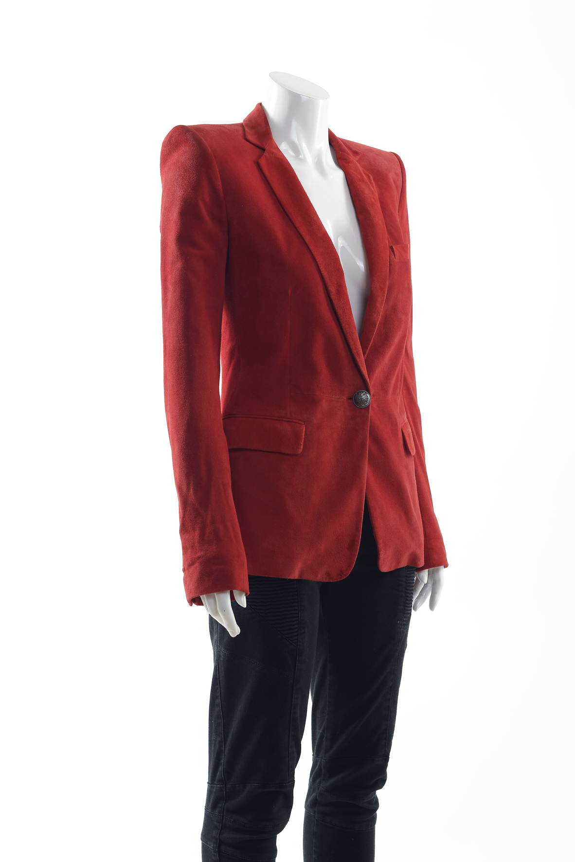 "Marynarka wykonana z zamszu, model BALMAIN Fiery One-Button Suede Jacket. Rozmiar 36. Wymiary: długość 67 cm., szerokość ramion 39 cm. szerokość biust 42 cm. talia 39 cm. dł. rękawów 67 cm. Cena oryginalna 2650 euro.Posiada dwie plamki na wysokości talii."