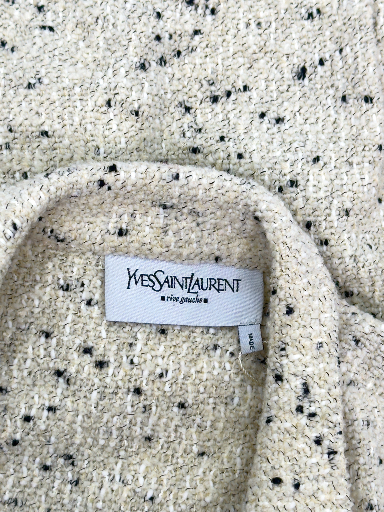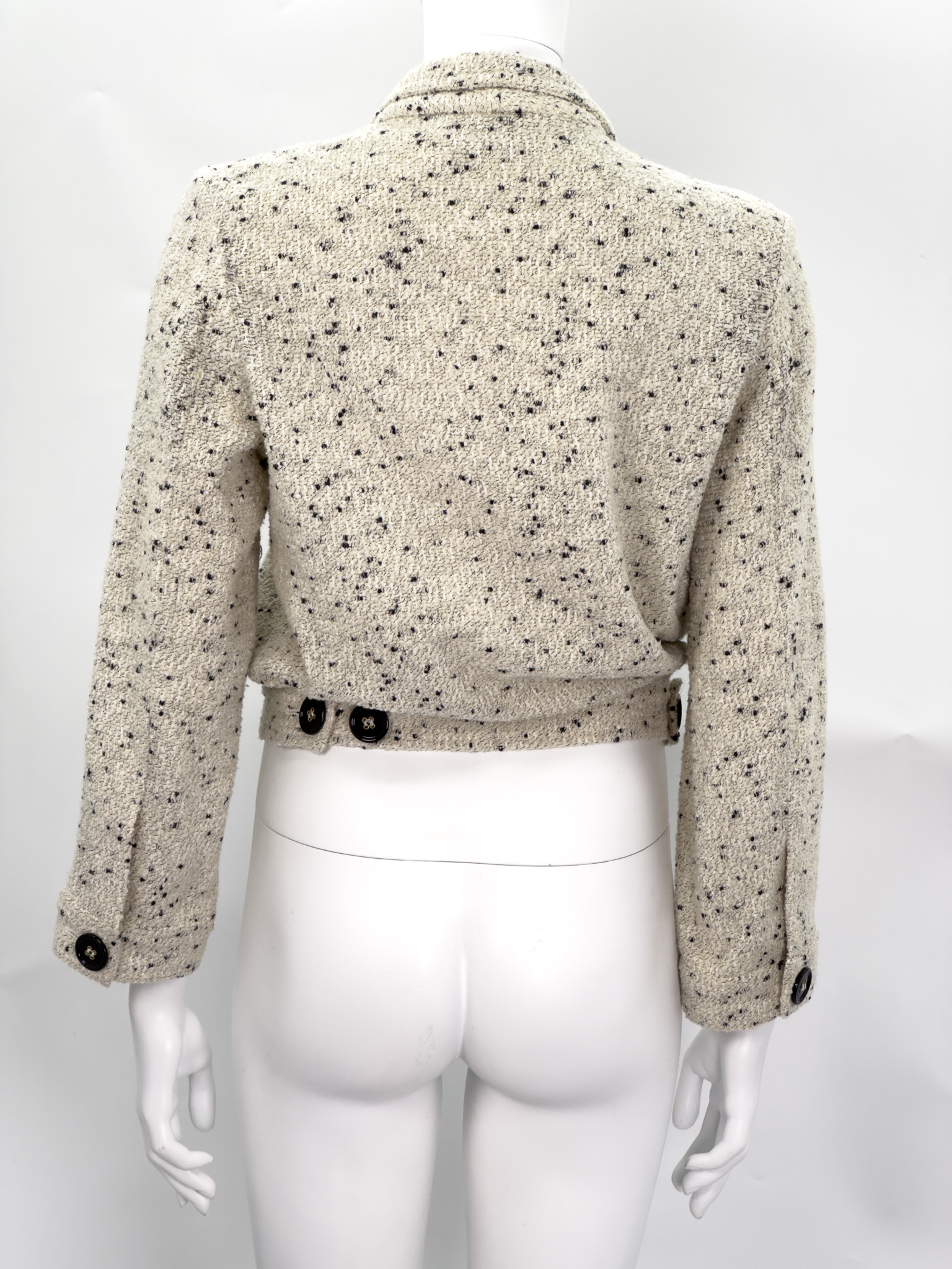 "Kremowy żakiet wykonany z tkaniny boucle, wykończony czarną oraz białą nitką, prosty krój, szpiczasty kołnierz, zapinany na trzy czarne duże guziki, regulowany dół, rozpinane mankiety. Rozmiar z metki F36. Skład: 50% wełna, 21% poliamid, 11% poliester, 8% wiskoza. Wymiary: szerokość mierzona od pachy do pachy 52cm, długość całkowita 52cm."