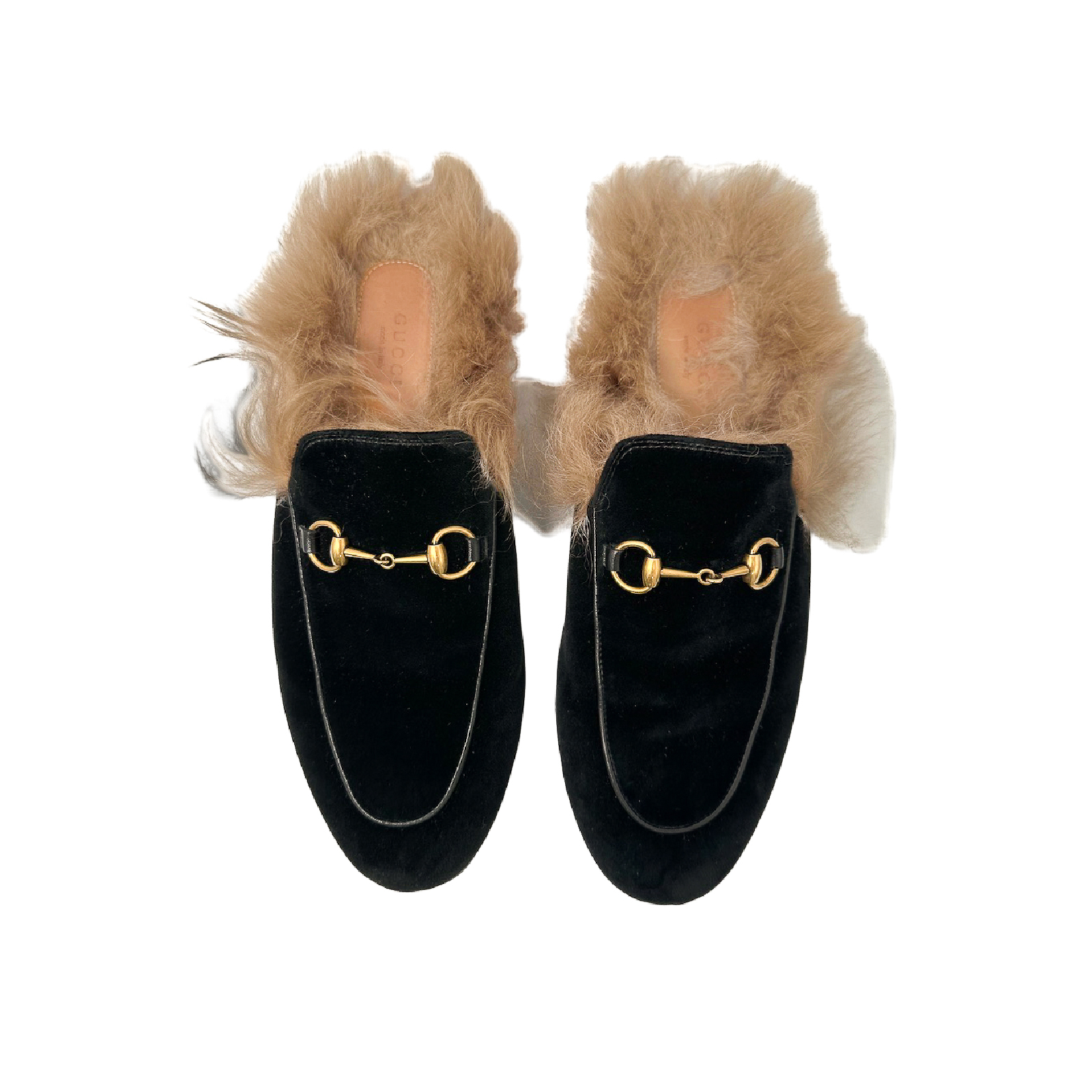 "Czarne aksamitne mule, wsuwane, złota ozdoba z przodu w kształcie charakterystycznym dla marki, wnętrze oraz tylna część ozdobiona brązowym futrem, zaokrąglone noski, skórzane wstawki ze skóry. Rozmiar 39. Model: Princetown."