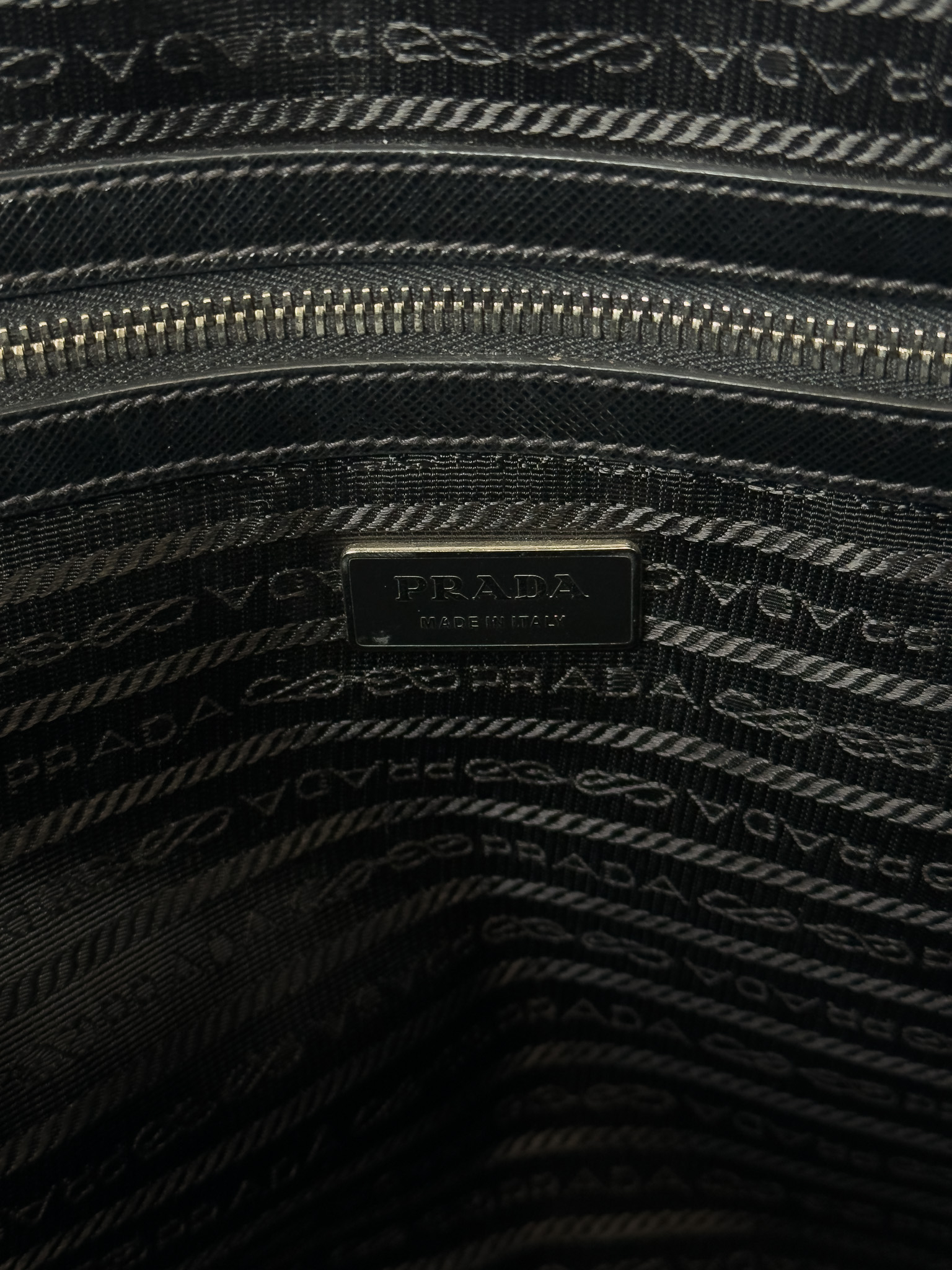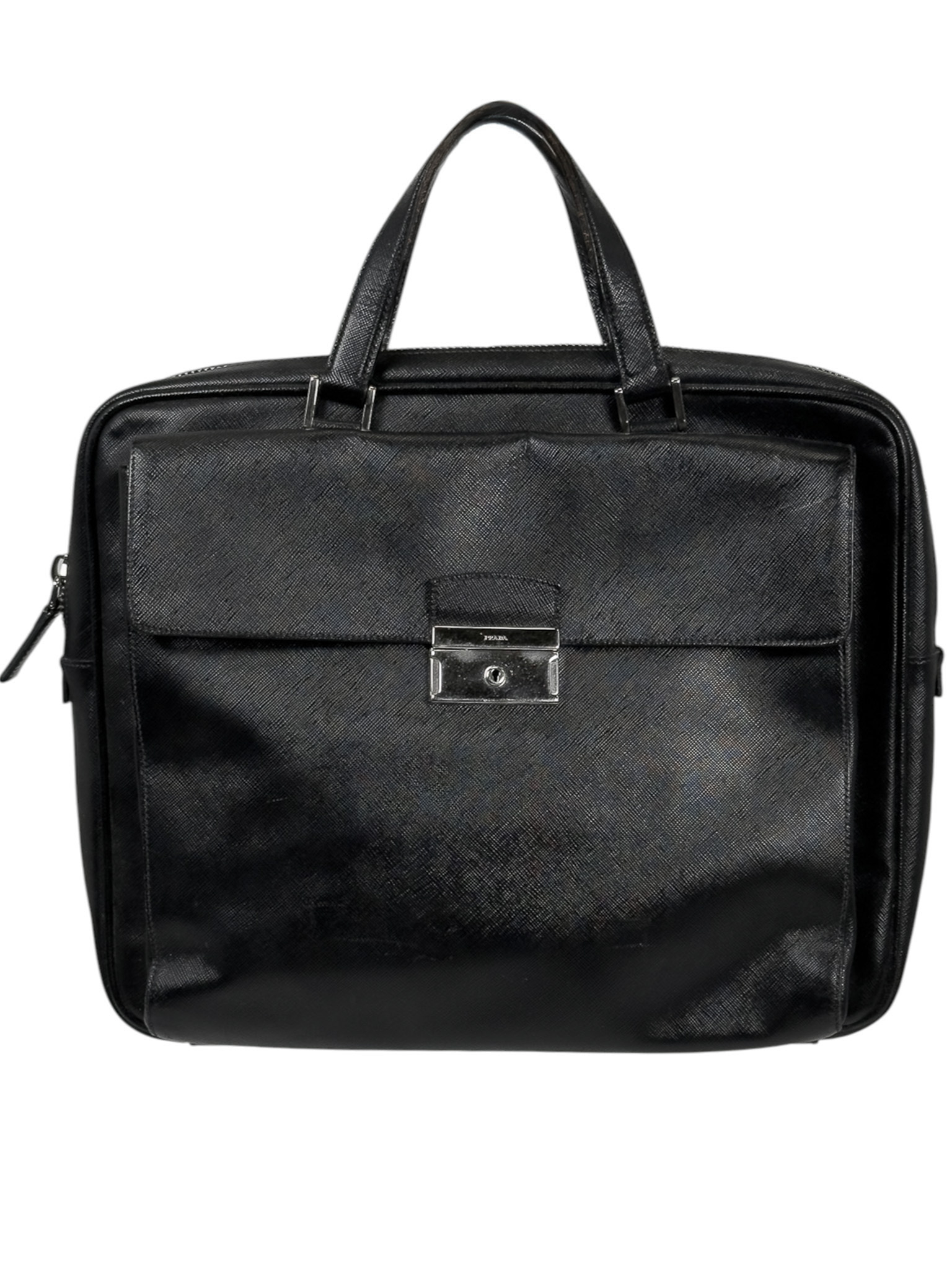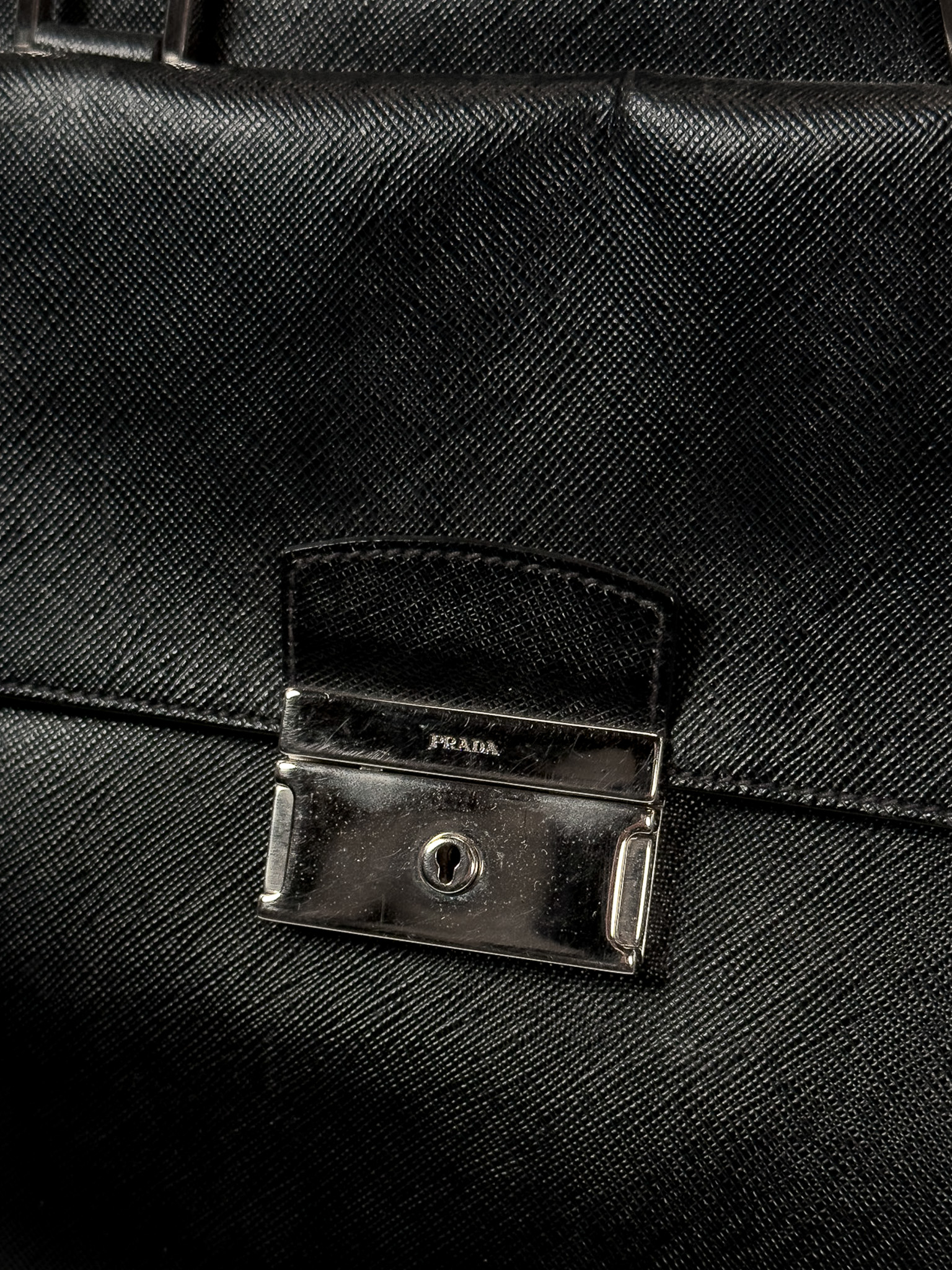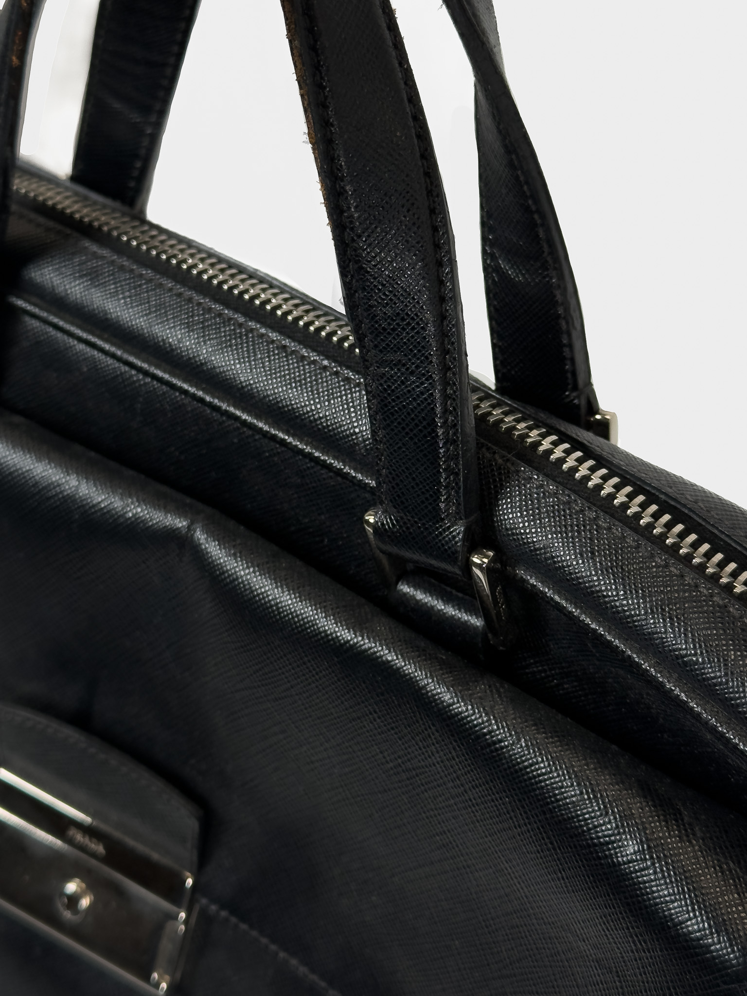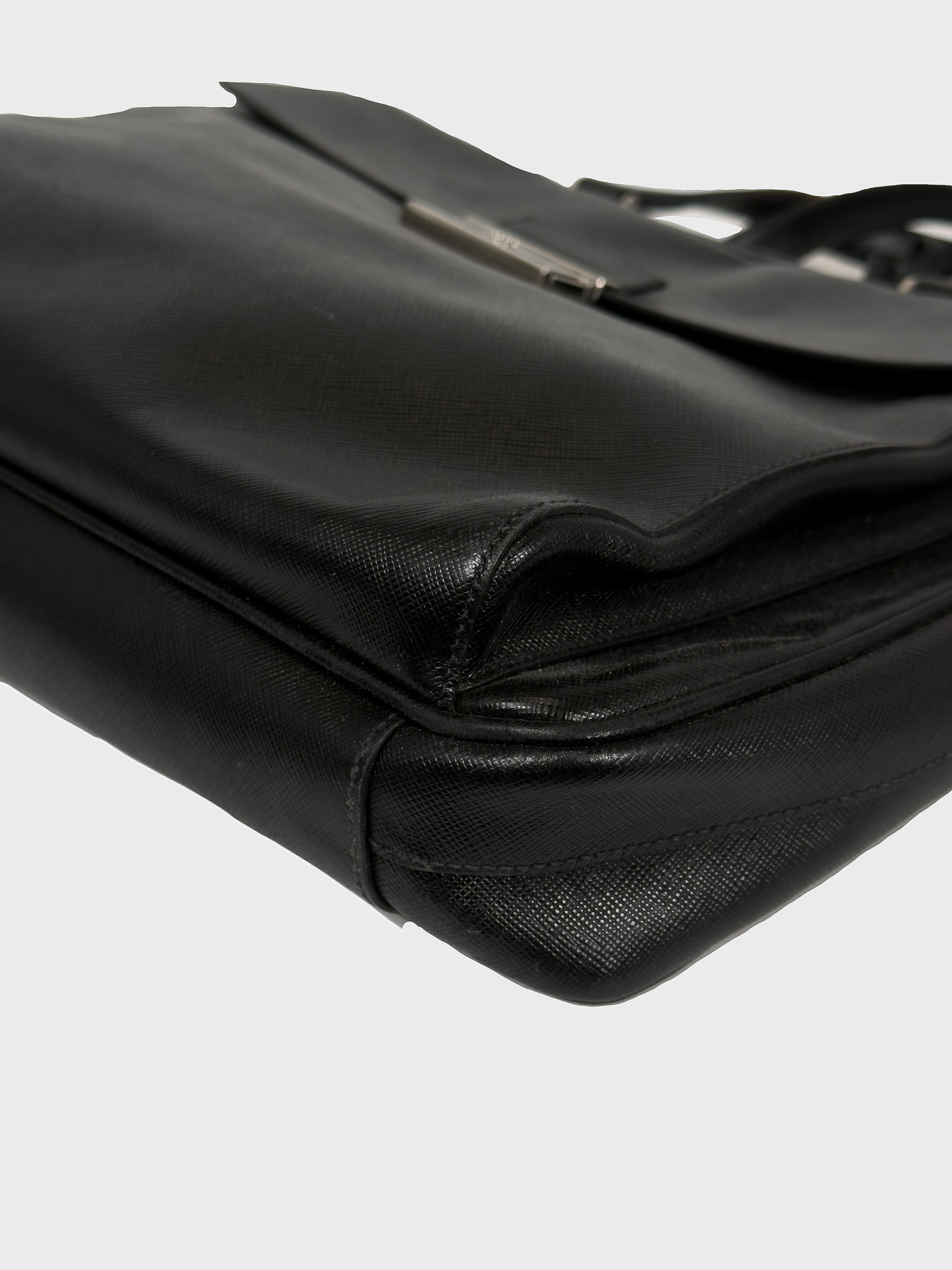 "Czarna skórzana aktówka, srebrne zapięcie z logo marki w centralnej części, prostokątny kształt, kieszeń na przodzie, dwa uchwyty do ręki, srebrne okucia, zapinana na suwak, jedna duża komora z kieszenią wewnątrz, logowane wnętrze. Stan dobry, posiada przetarcia na rączkach, ślady użytkowania na skórze, rysy na metalowych elementach. Wymiary: szerokość 38cm, wysokość 29cm, głębokość 5cm."