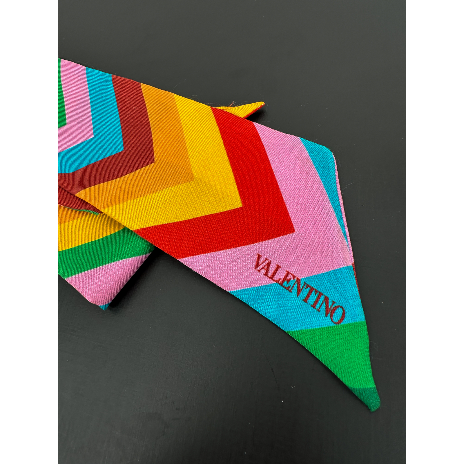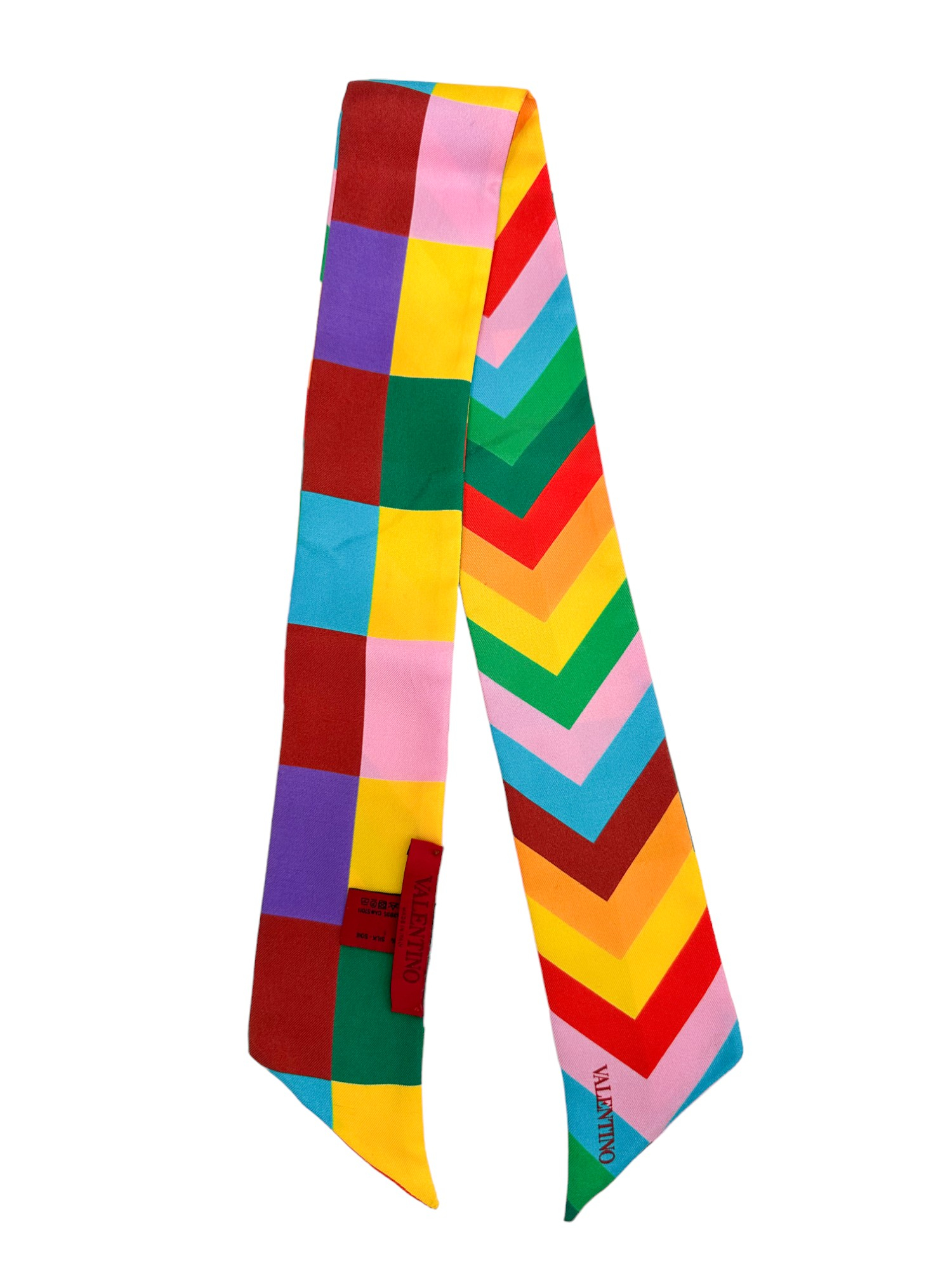 "Wielokolorowa mała apaszka w motyw jodełki, czerwone logo marki na wykończeniu, w zestawie z workiem przeciwkurzowym. Wymiary: długość całkowita 84cm, szerokość 6cm."