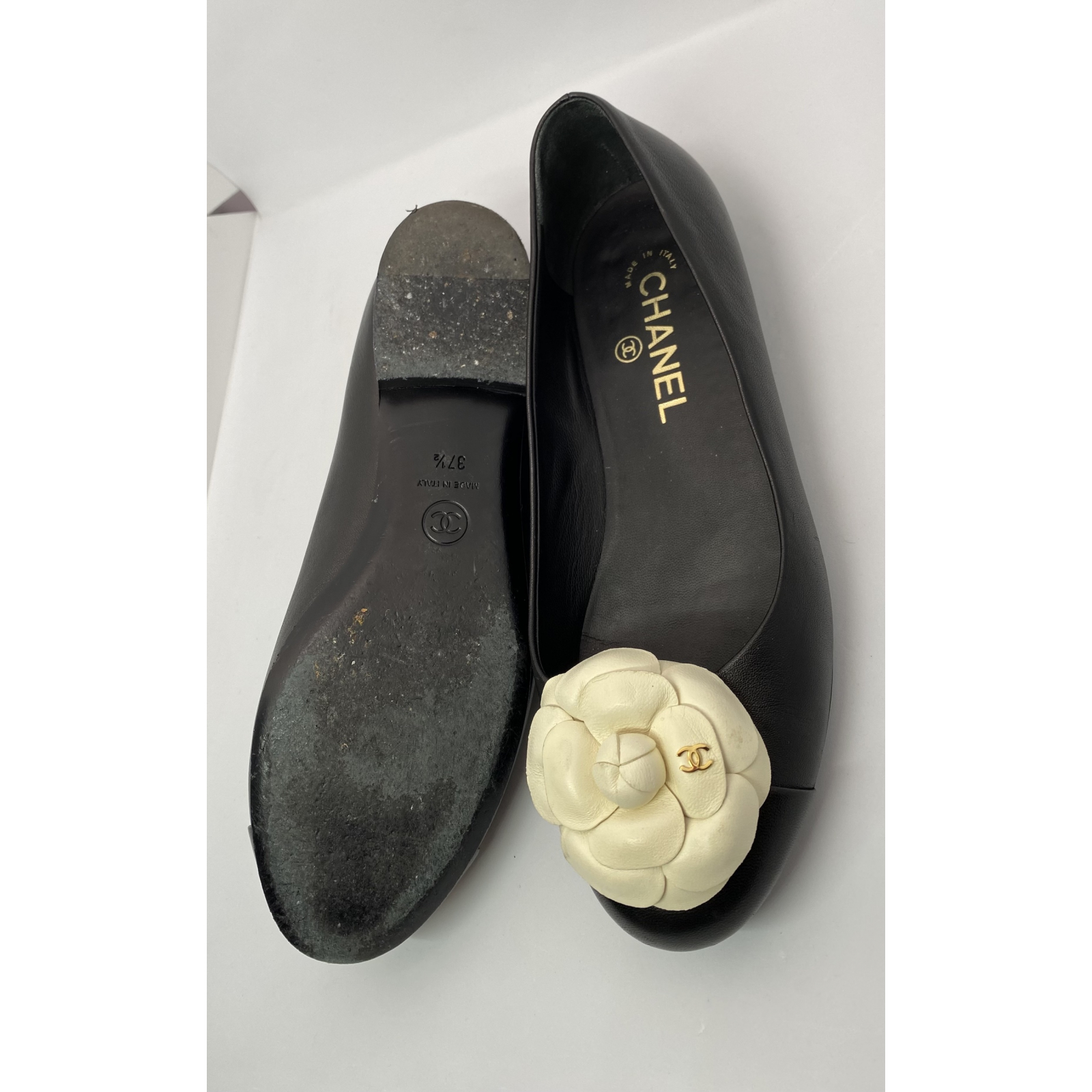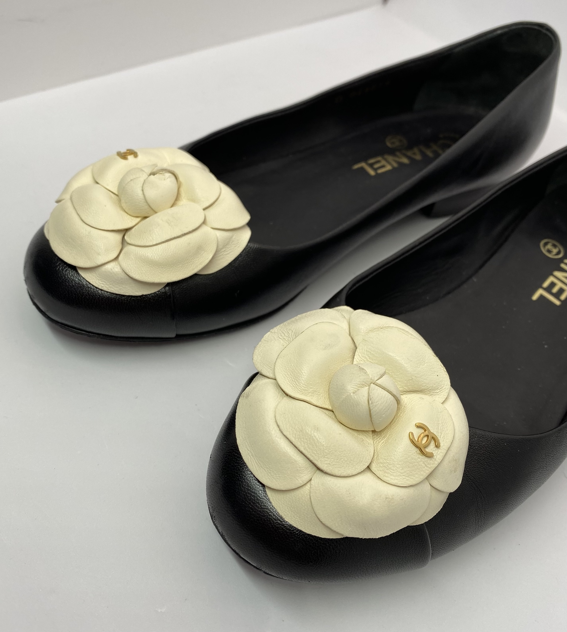 "czarne skórzane baleriny, przód ozdobiony białą kamelią, małe złote logo, używane, lekko zdarta podeszwa. Rozmiar 37,5."