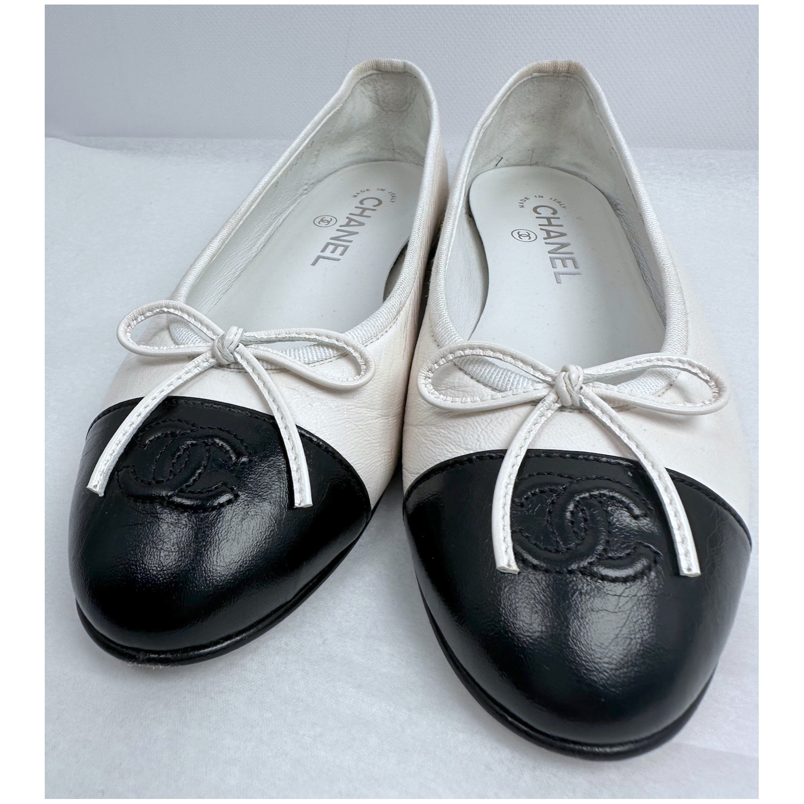 "Biało-czarne baleriny ze skóry naturalnej z logo. Na nosku mają ozdobne pikowanie z zachodzących na siebie dwóch liter: "C". Jego czarna kolorystyka kontrastuje z bielą cholewki. Czerń powtarza się przy niewysokim obcasie i wokół obramowania podeszwy. Wykończone są cienkim paskiem skóry, zawiniętym w kokardkę. Stan: bardzo dobry, widoczne lekkie przytarcie materiału przy jednym nosku. Rozmiar: 37,5 C. Dł. wkładki: 23,5 cm. Skład: 100% skóra naturalna, wkładka: 100% skóra naturalna, podeszwa: skóra naturalna i tworzywo sztuczne. Wys. obcasa: 1,5 cm."
