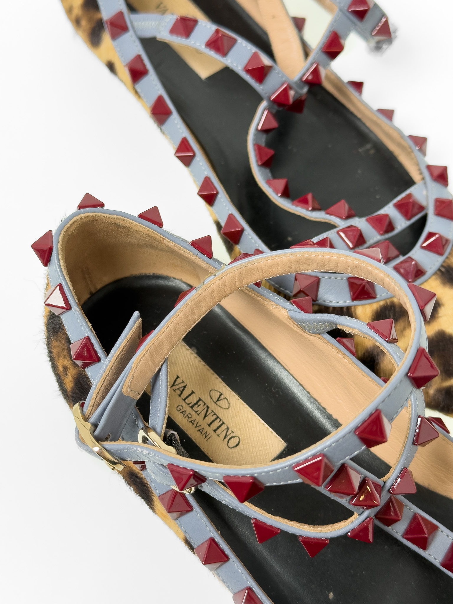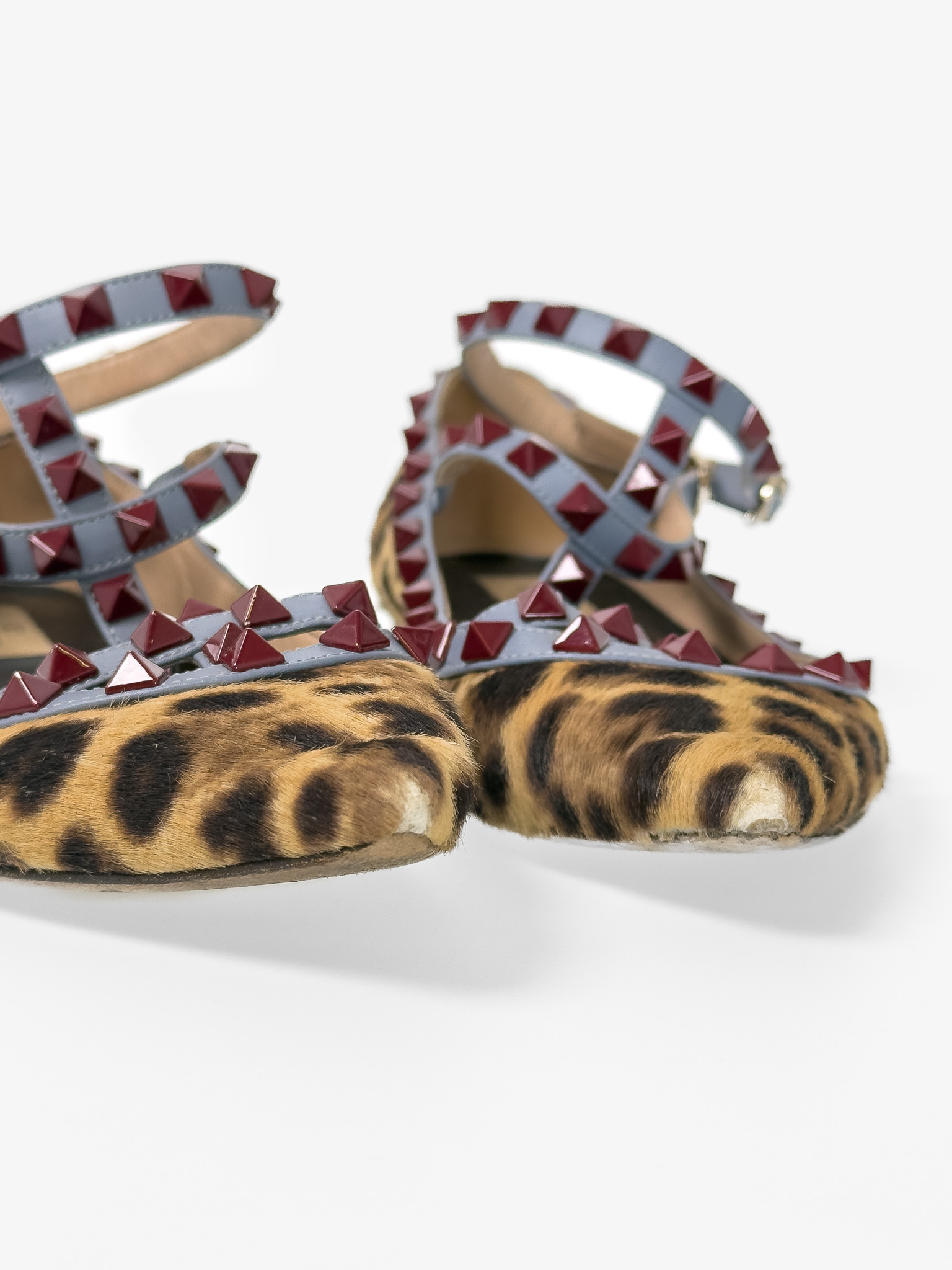 "Baletki w motyw zwierzęcy- leopard, krótki włos, nosek w szpic, ozdobione bordowymi ćwiekami, wykończone fioletową skórą, niski obcas, zapinane wokół kostki oraz w przedniej części na regulowane paski, złote sprzączki, w zestawie z pudełkiem, używane. Stan dobry, przetarcia na noskach oraz podeszwie."
