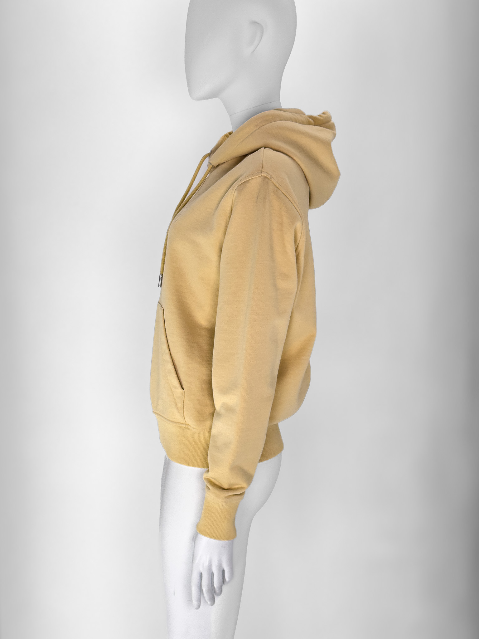 "Beżowa bawełniana bluza z kapturem, wyszywane logo marki na przodzie, duża kieszeń, regulowany sznurkiem kaptur, rękawy oraz dół wykończone ściągaczem. Rozmiar z metki XS. Skład: 99% bawełna, 1 % elastan. Wymiary: szerokość mierzona od pachy do pachy 55cm, długość całkowita 58cm."