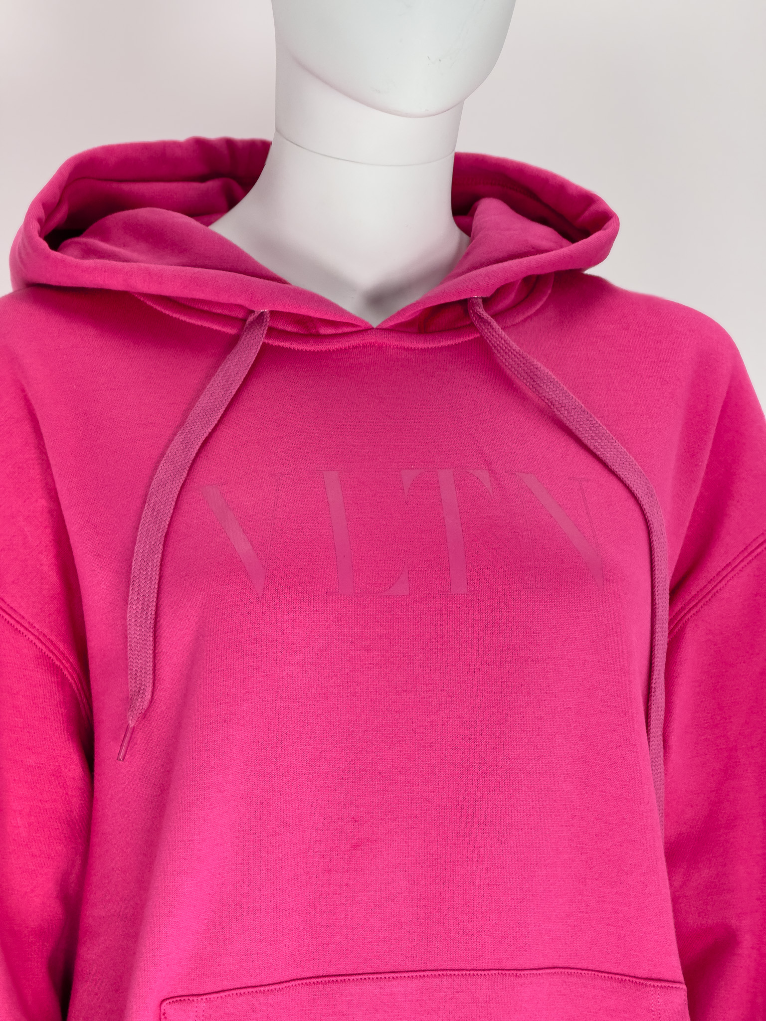 "Bawełniana bluza z kapturem w kolorze magenta, regulowany sznurkami kaptur, delikatne logo marki w centralnej części, duża kieszeń, prosty krój, mankiety oraz dół wykończone prążkowanym ściągaczem, w zestawie z metką. Rozmiar z metki M. Skład: 94% bawełna, 6% poliamid. Wymiary: szerokość mierzona od pachy do pachy 59cm, długość całkowita 65cm."