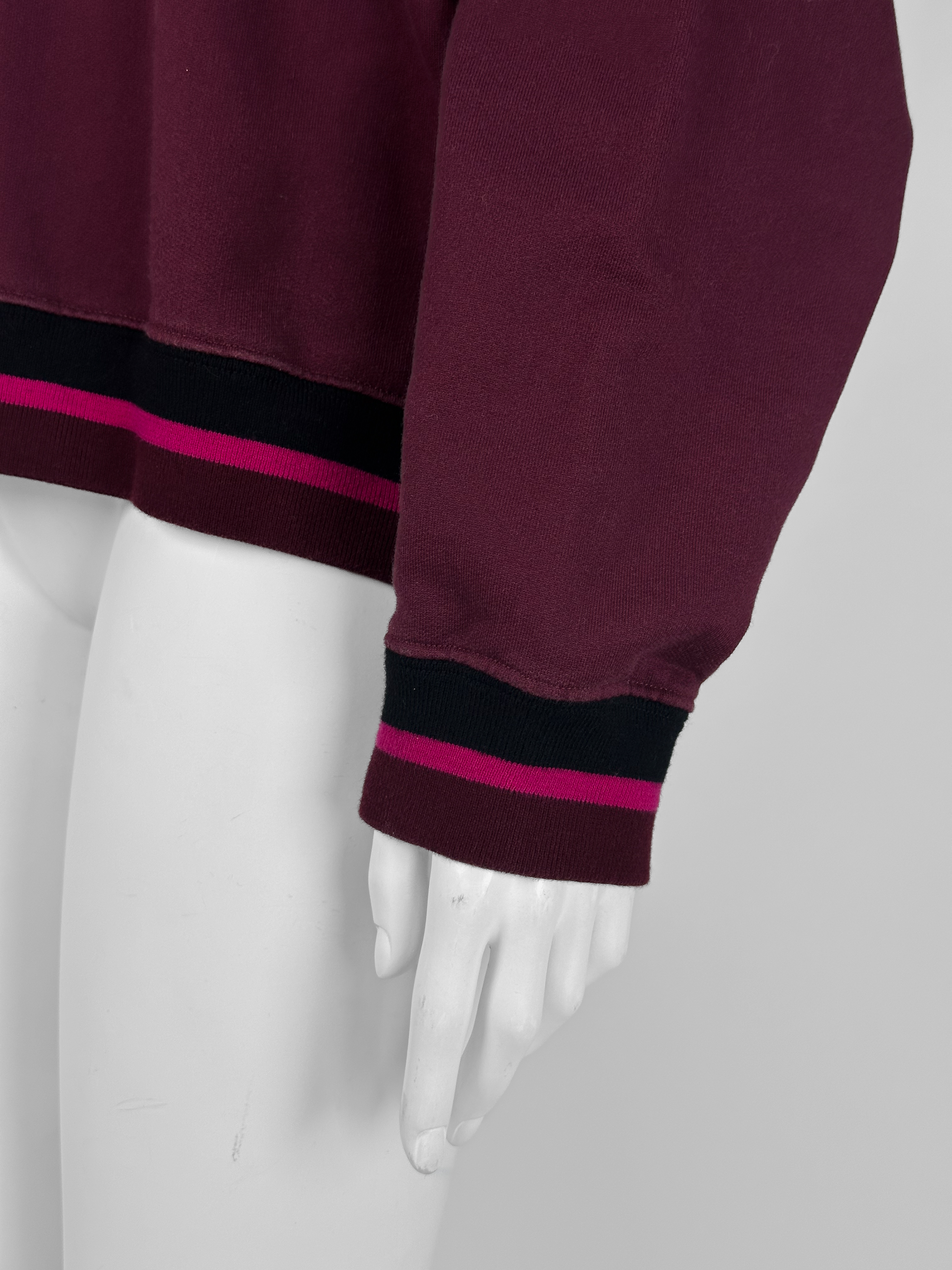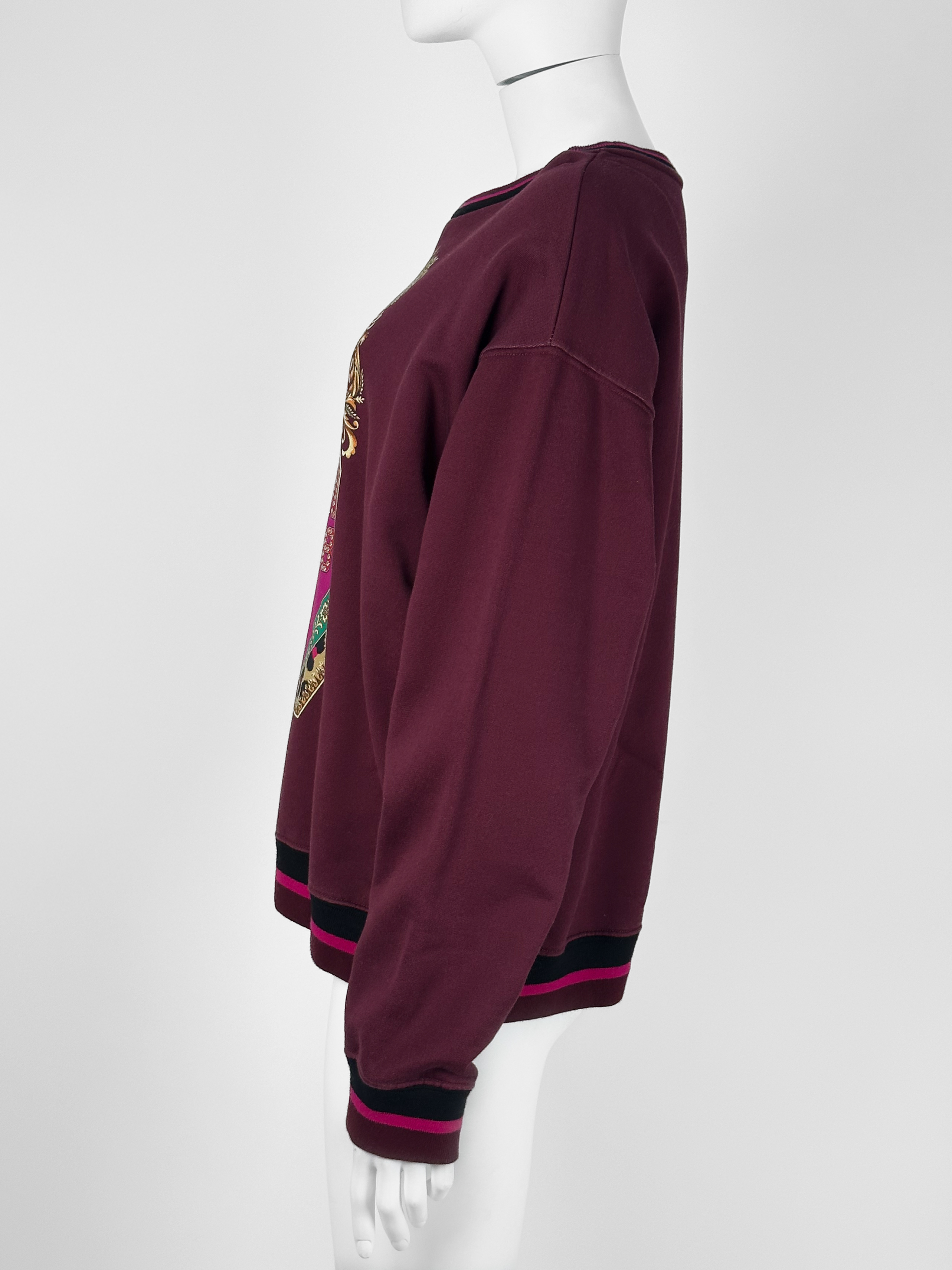 "Burgundowa bluza z aplikacją i wzorami na przodzie (panterka, ornamenty), różowo-czarno-burgundowe ściągacze, używana. Rozmiar z metki IT 48. Skład: 100% bawełna. Wymiary: szerokość mierzona od pachy do pachy 62cm, długość całkowita 64cm."