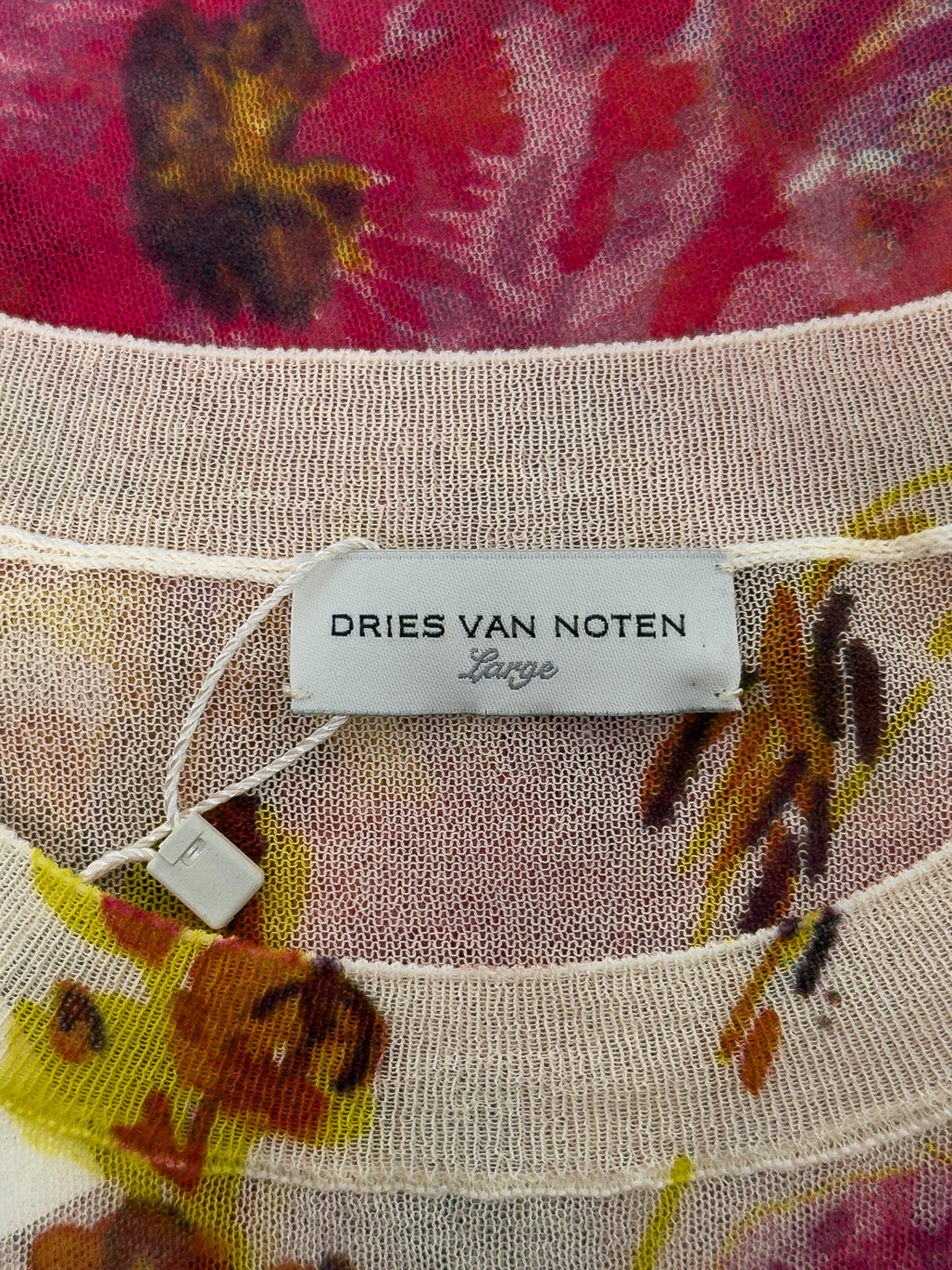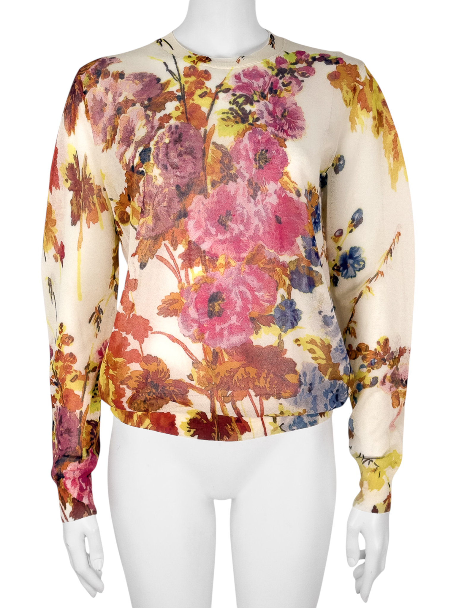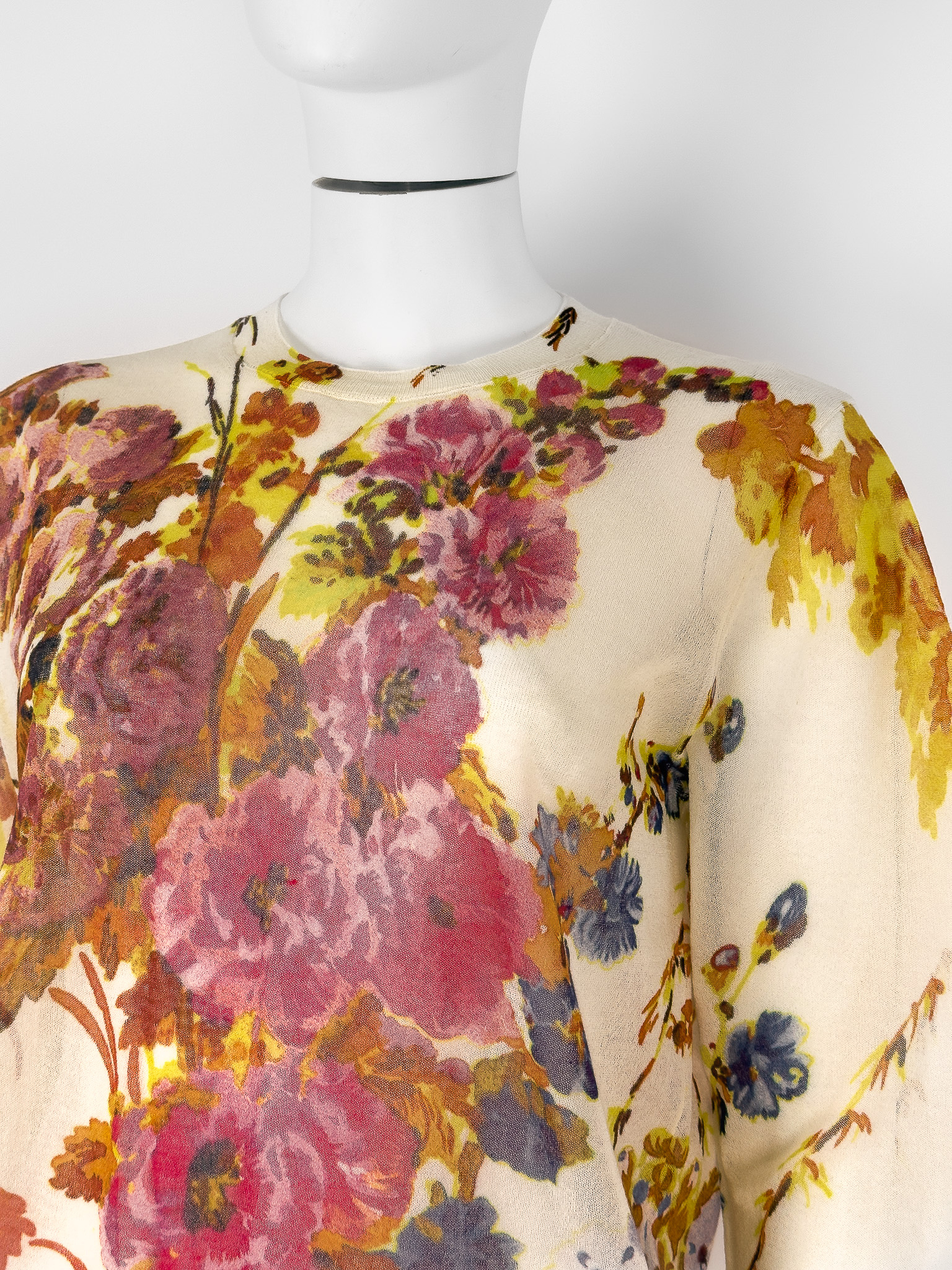 "Kremowa bawełniana bluzka z długim rękawem ozdobiona wzorem kwiatów w ciepłych barwach, zaokrąglony dekolt, cienka, delikatnie transparentna, o prostym kroju. wykończona delikatym ściągaczem. Stan bardzo dobry. Rozmiar z metki L. Skład: 85% bawełna, 15% poliamid. Wymiary: szerokość mierzona od pachy do pachy 57cm, długość całkowita 62cm."