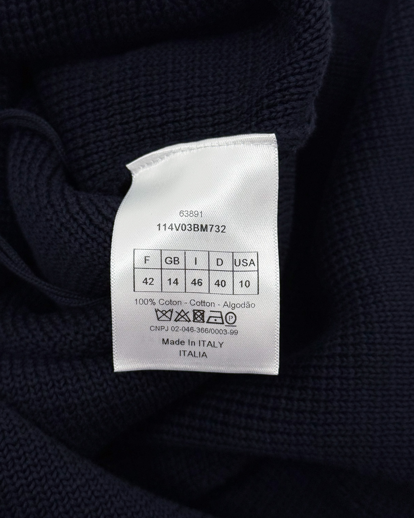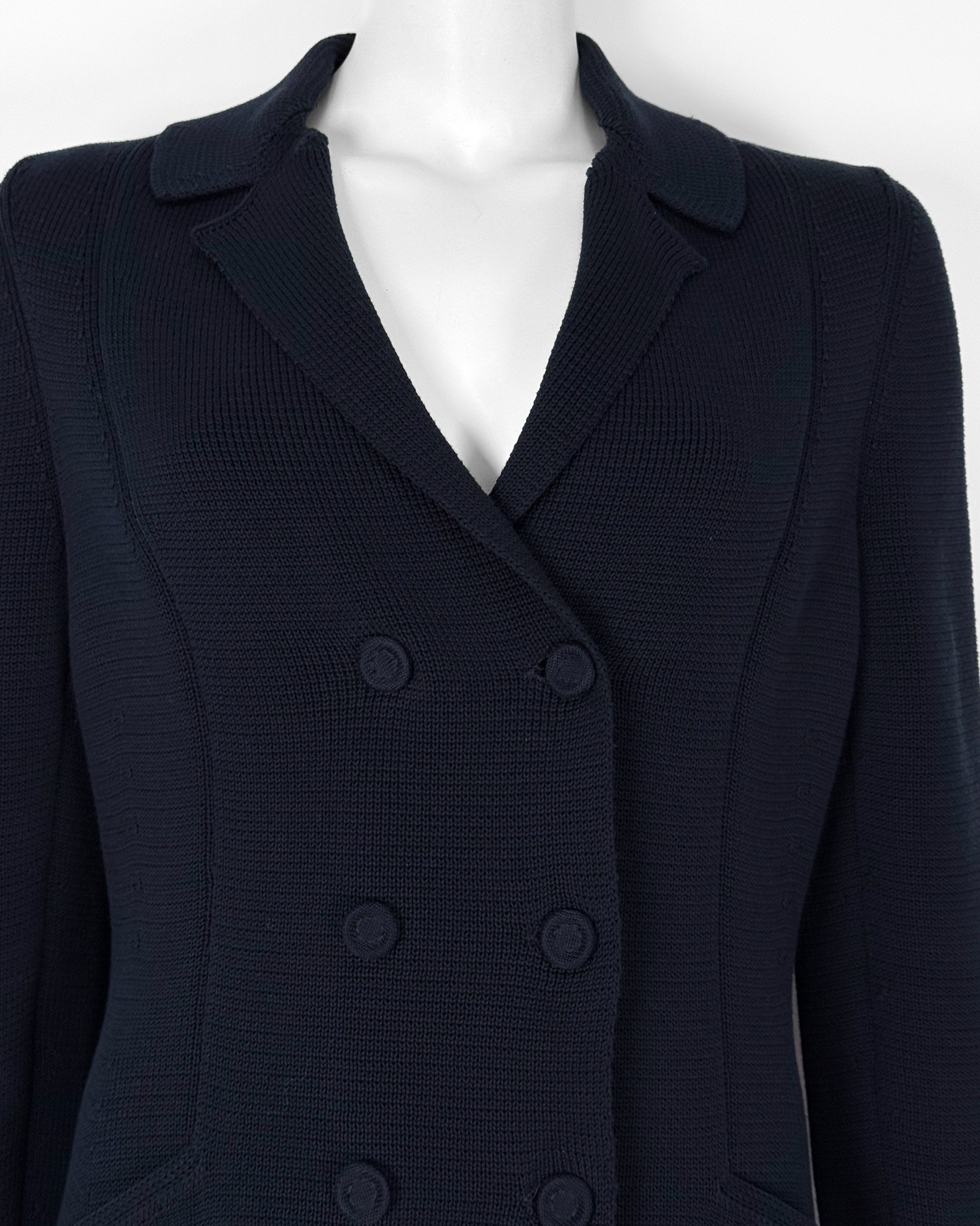 "Granatowa dwurzędowa bawełniana marynarka, dekolt w serek, dwie kieszenie w bocznej części, mankiety ozdobione guzikami. Stan nowa z metką. Skład: 100% bawełna. Rozmiar z metki IT 46. Wymiary: szerokość mierzona od pachy do pachy 47cm, długość całkowita 65cn."