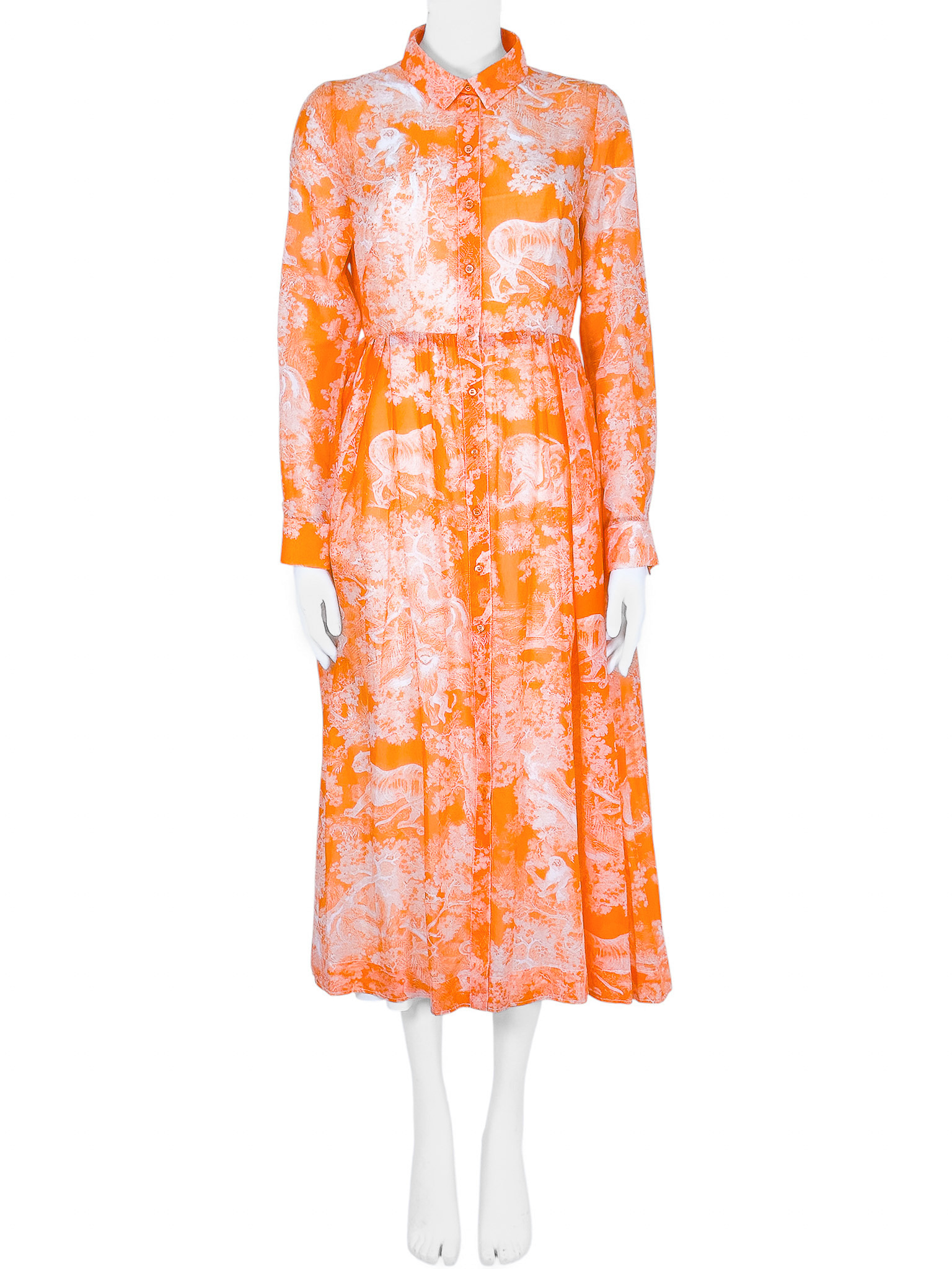 "Kolekcja: Dioriviera capsule 2022. Pomarańczowa bawełniana sukienka w charakterystyczny wzór dla marki, zapinana na guziki, długi rękaw, w zestawie z białą halką na ramiączkach. Stan bardzo dobry. Rozmiar z metki IT44. Skład: 100% bawełna. Wymiary: szerokość mierzona od pachy do pachy 49cm, długość całkowita 126cm."