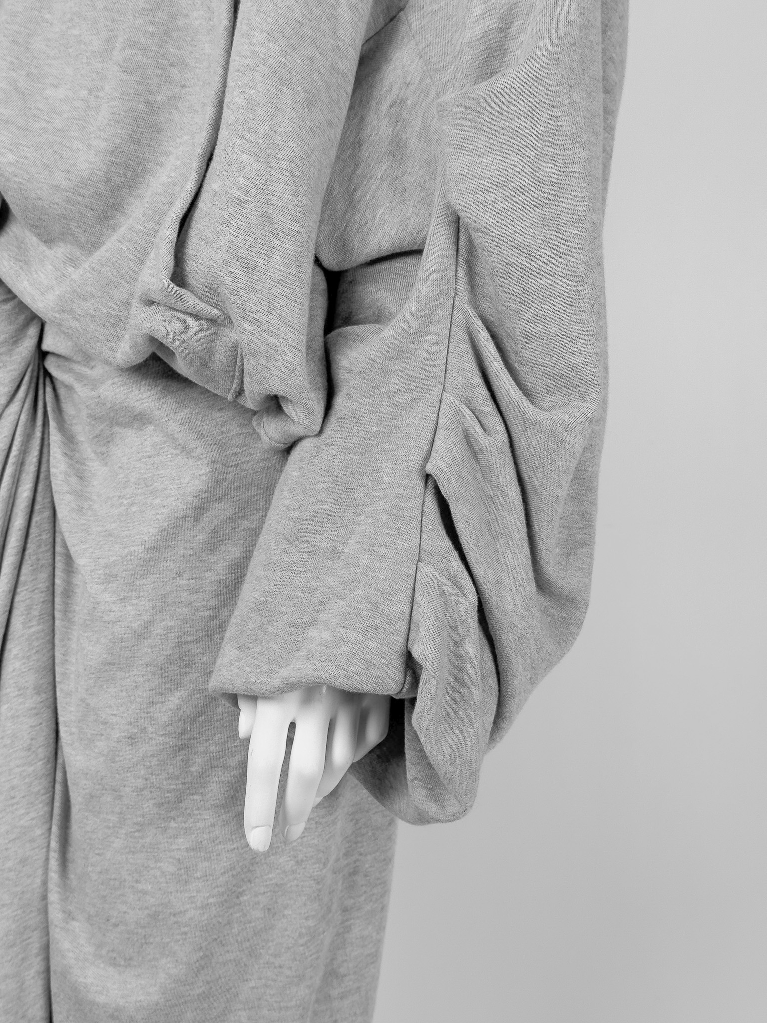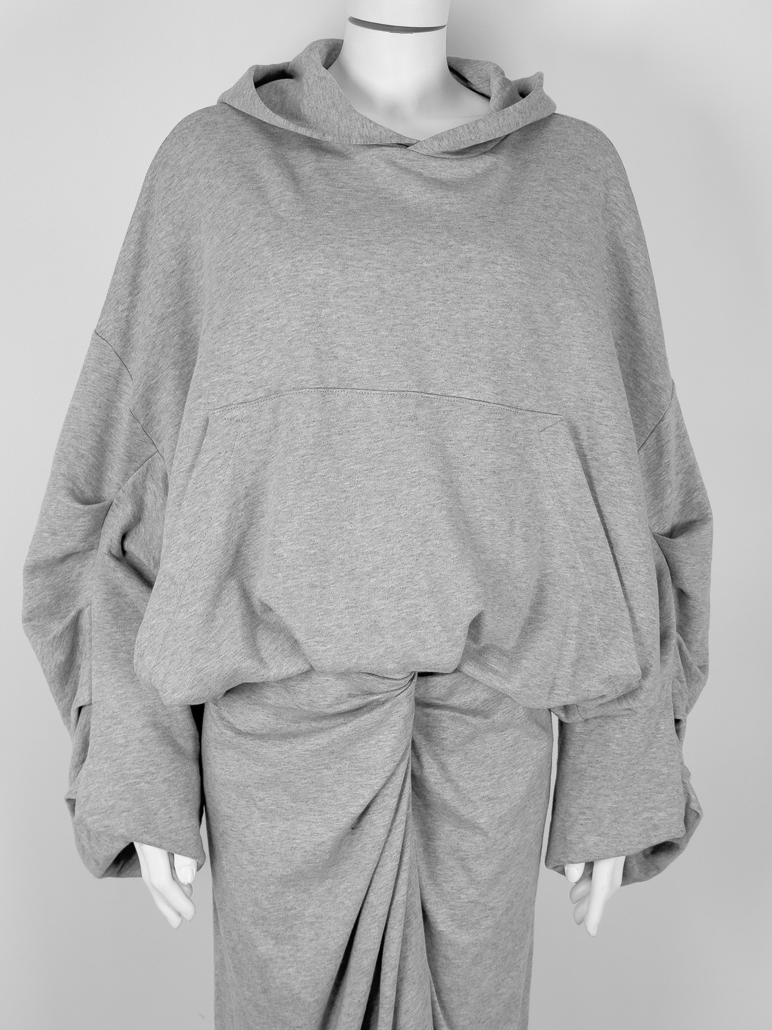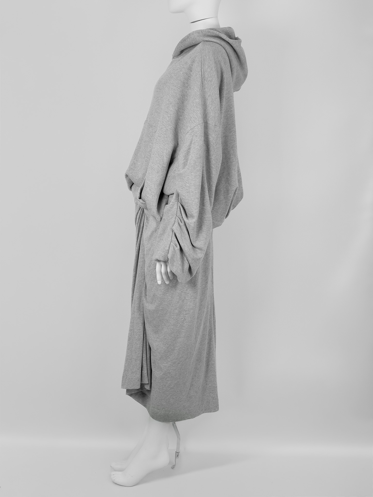 "Szary bawełniany komplet dresowy: bluza z kapturem + spódnica, ozdobiony marszczeniem, duża kieszeń na przodzie, guma w pasie w spódnicy, obniżona linia ramion. Stan bardzo dobry. Rozmiar z metki M. Skład: 100% bawełna. Wymiary: szerokość mierzona od pachy do pachy 89cm, długość całkowita bluzy 59cm; szerokość w pasie 39cm, długość całkowita spódnicy 96cm."
