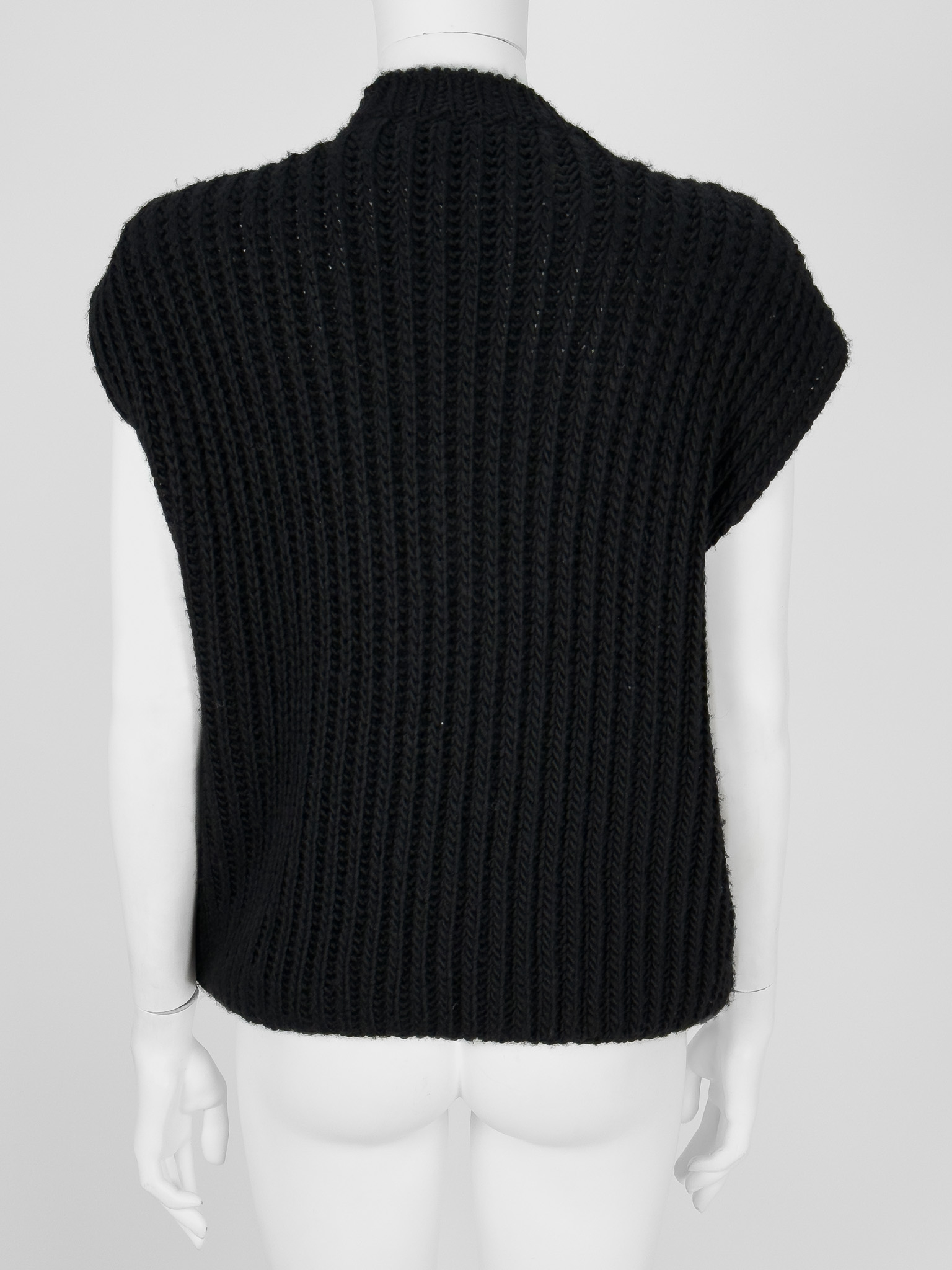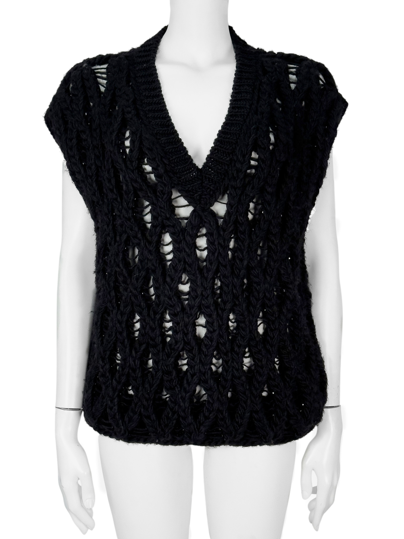 "Czarny bezrękawnik z dzianiny, ażurowy, ozdobiony połyskującymi koralikami, dekolt w serek, wykończony prążkowanym ściągaczem w dolnej części. Wycięta metka z rozmiarem oraz składem. Rozmiarowo wypada jak M. Wymiary: szerokość mierzona od pachy do pachy 56cm, długość całkowita 65cm."