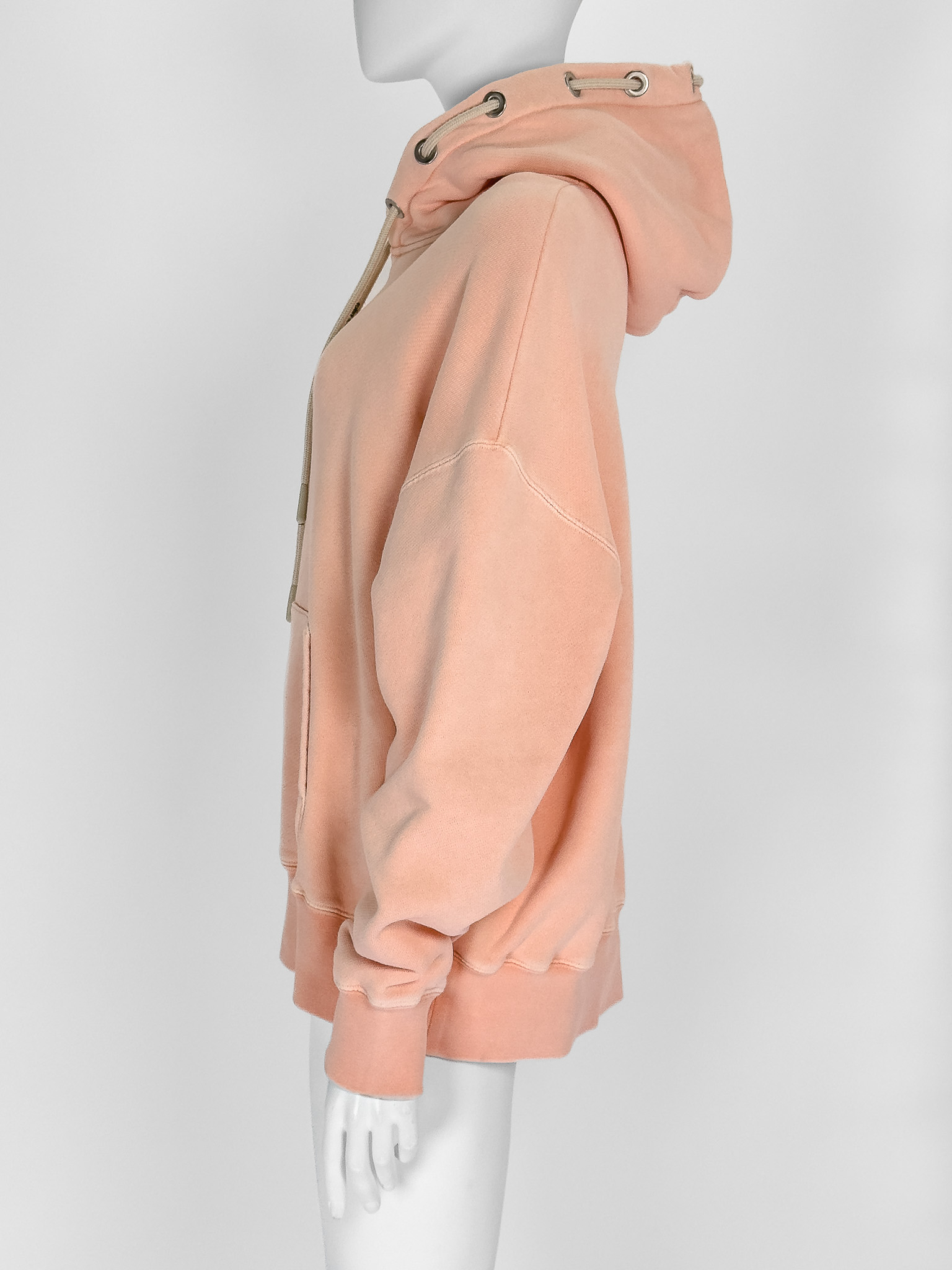 "Bluza w kolorze brzoskwiniowym, regulowany kaptur kremowym logowanym sznurkiem, dół oraz mankiety wykończone prążkowanym ściągaczem, obniżona linia ramion, kieszeń w centralnej części, srebrne detale. Rozmiar z metki M. Skład: 100% bawełna. Wymiary: szerokość mierzona od pacy do pachy 69cm, długość całkowita 67cm."