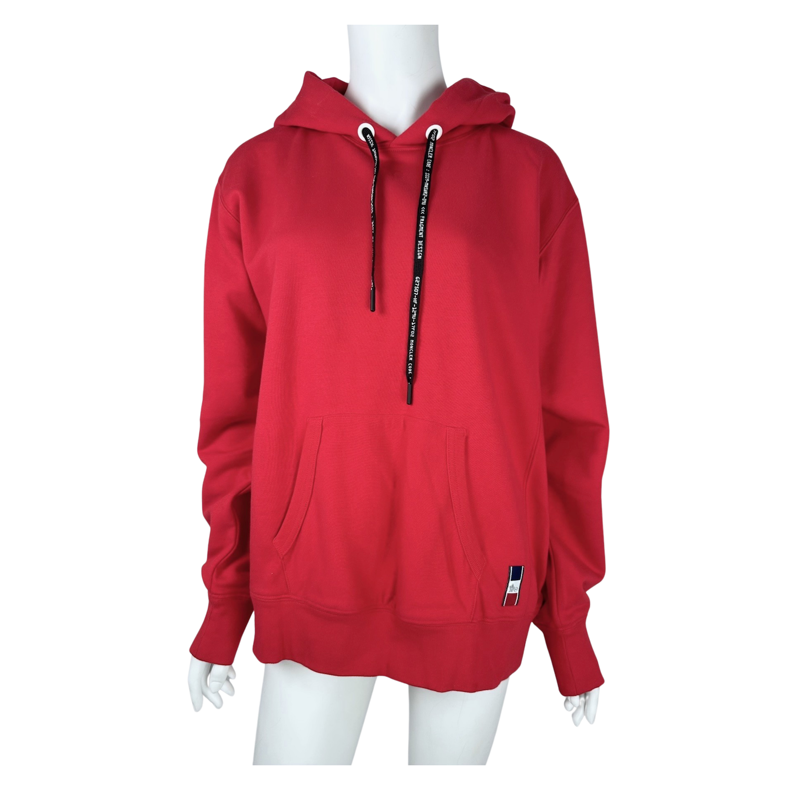"Fragment Design Hiroshi Fujiwara. czerwona bluza z kapturem, jedna kieszeń z przodu, długi rękaw, naszywka z logiem na przodzie, biały napis na plecach, widoczna plama na przodzie. Rozmiar M. Skład: 100% bawełna."