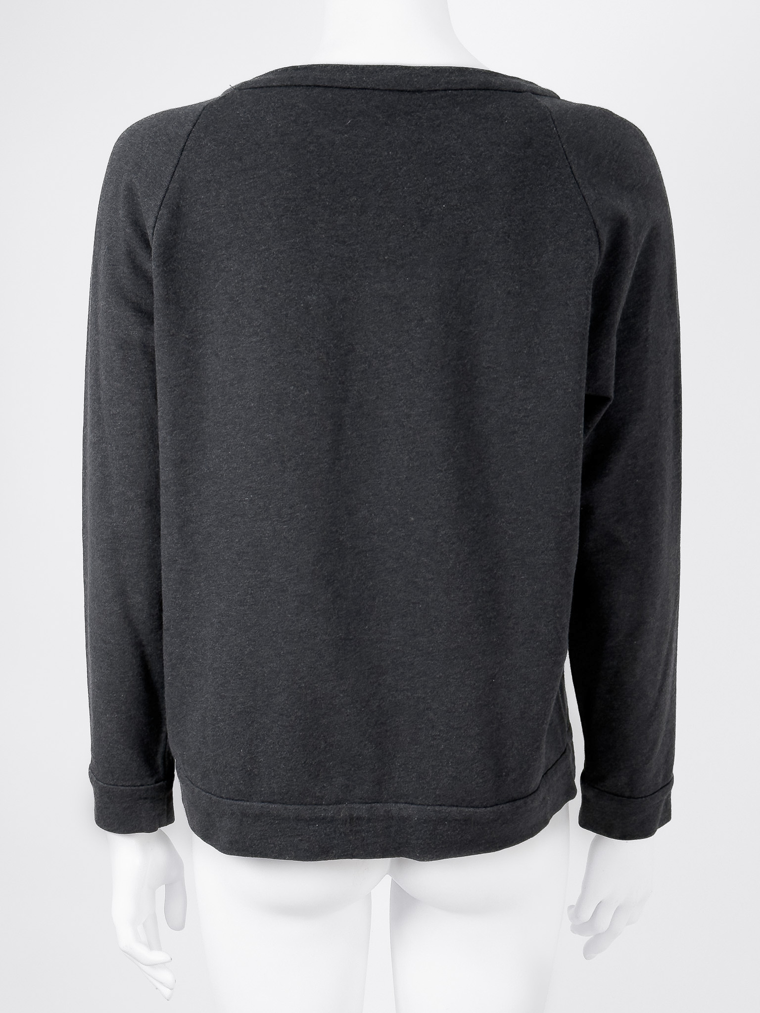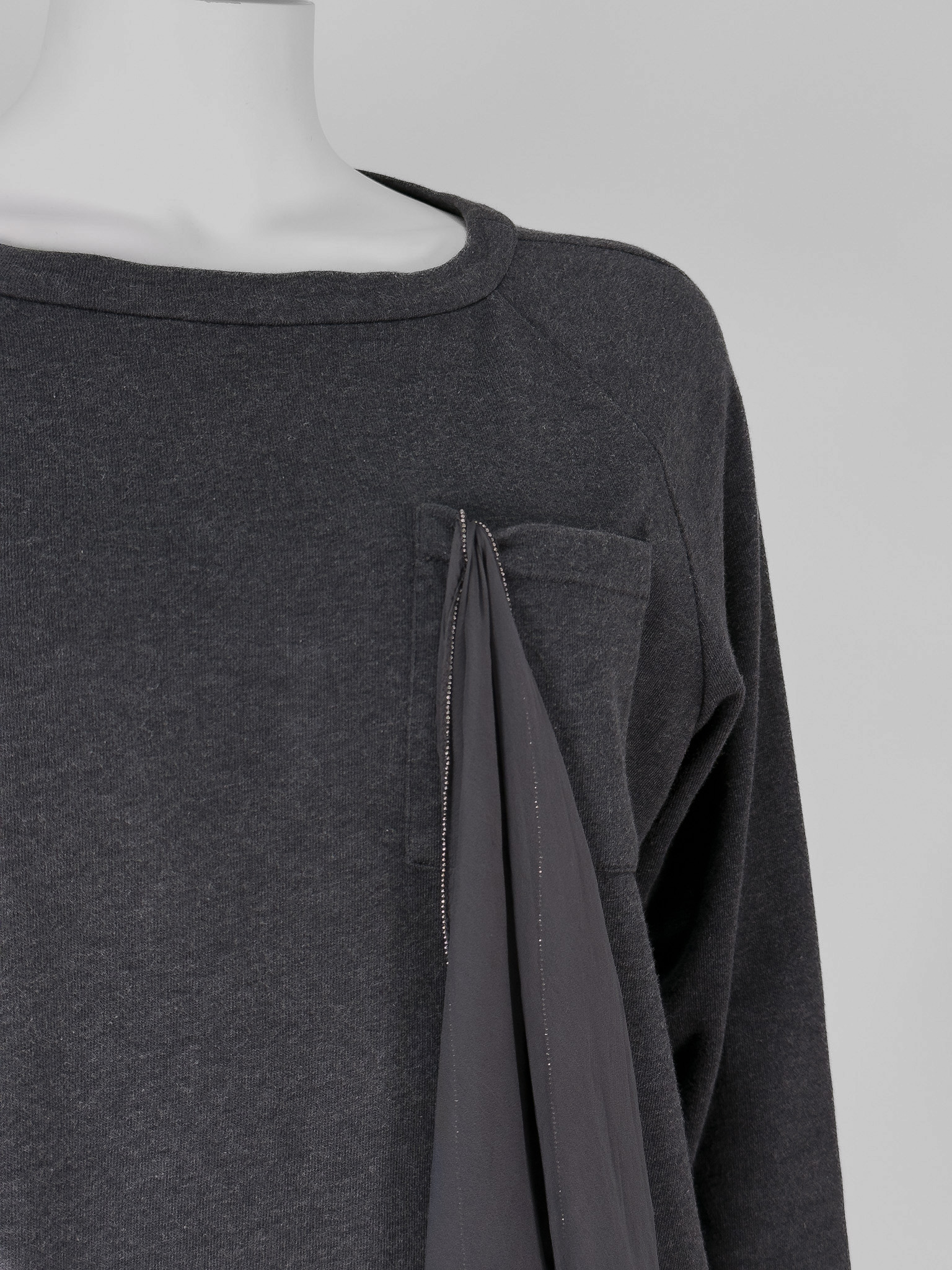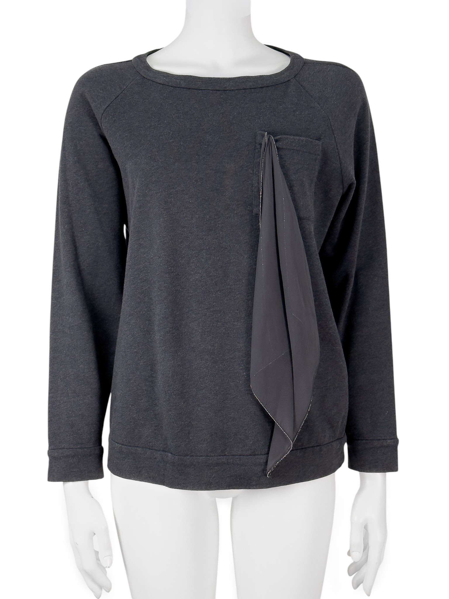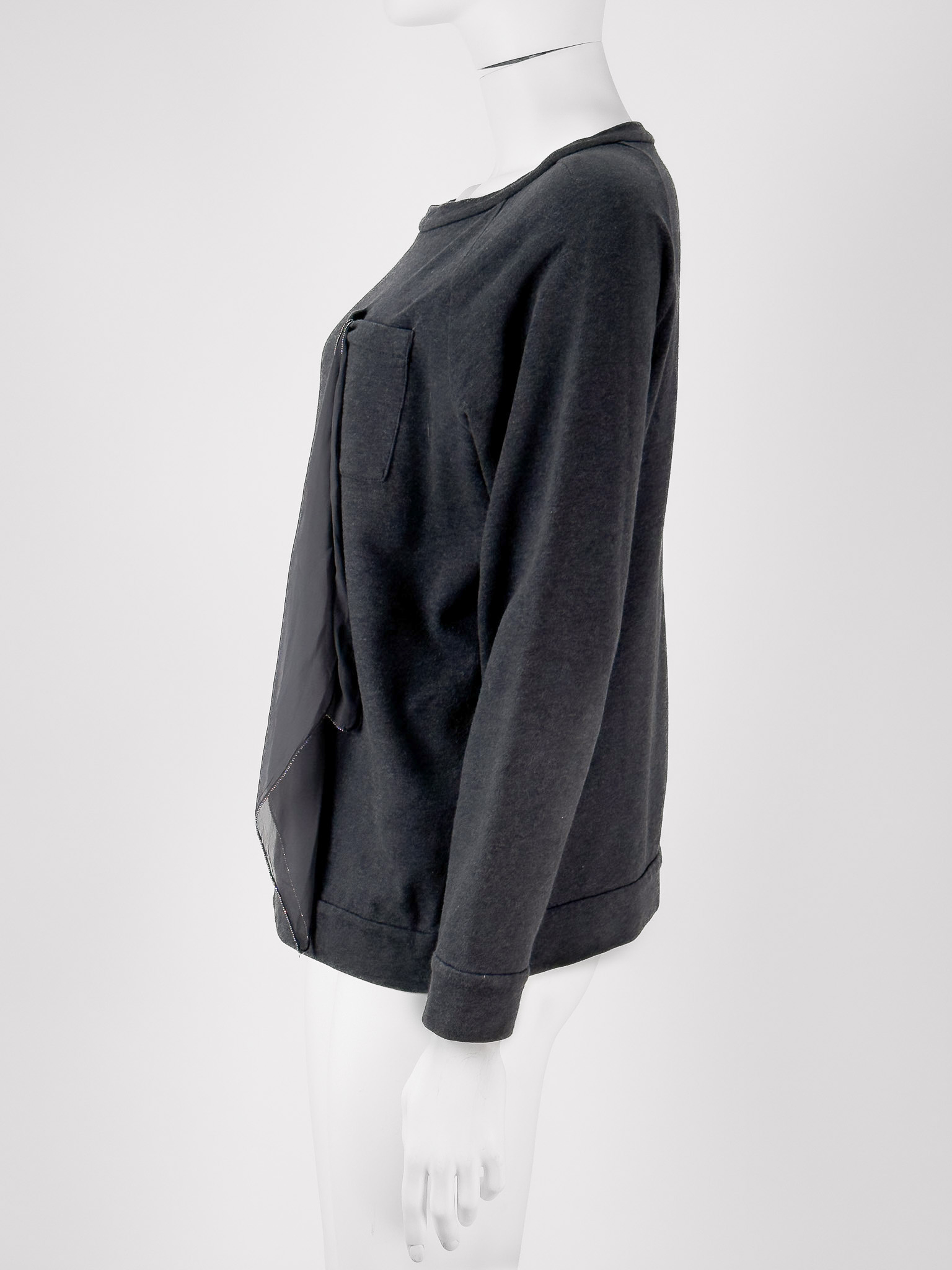 "Grafitowa bluza, prosty krój, kieszeń w okolicy biustu z jedwabną, odpinaną pochette ozdobioną koralikami, charakterystycznymi dla marki, zaokrąglony dekolt, wykończona ściągaczem. Stan bardzo dobry. Rozmiar z metki M. Skład: 100% bawełna; pochette: 100% jedwab. Wymiary: szerokość mierzona od pachy do pachy 55cm, długość całkowita 61cm."