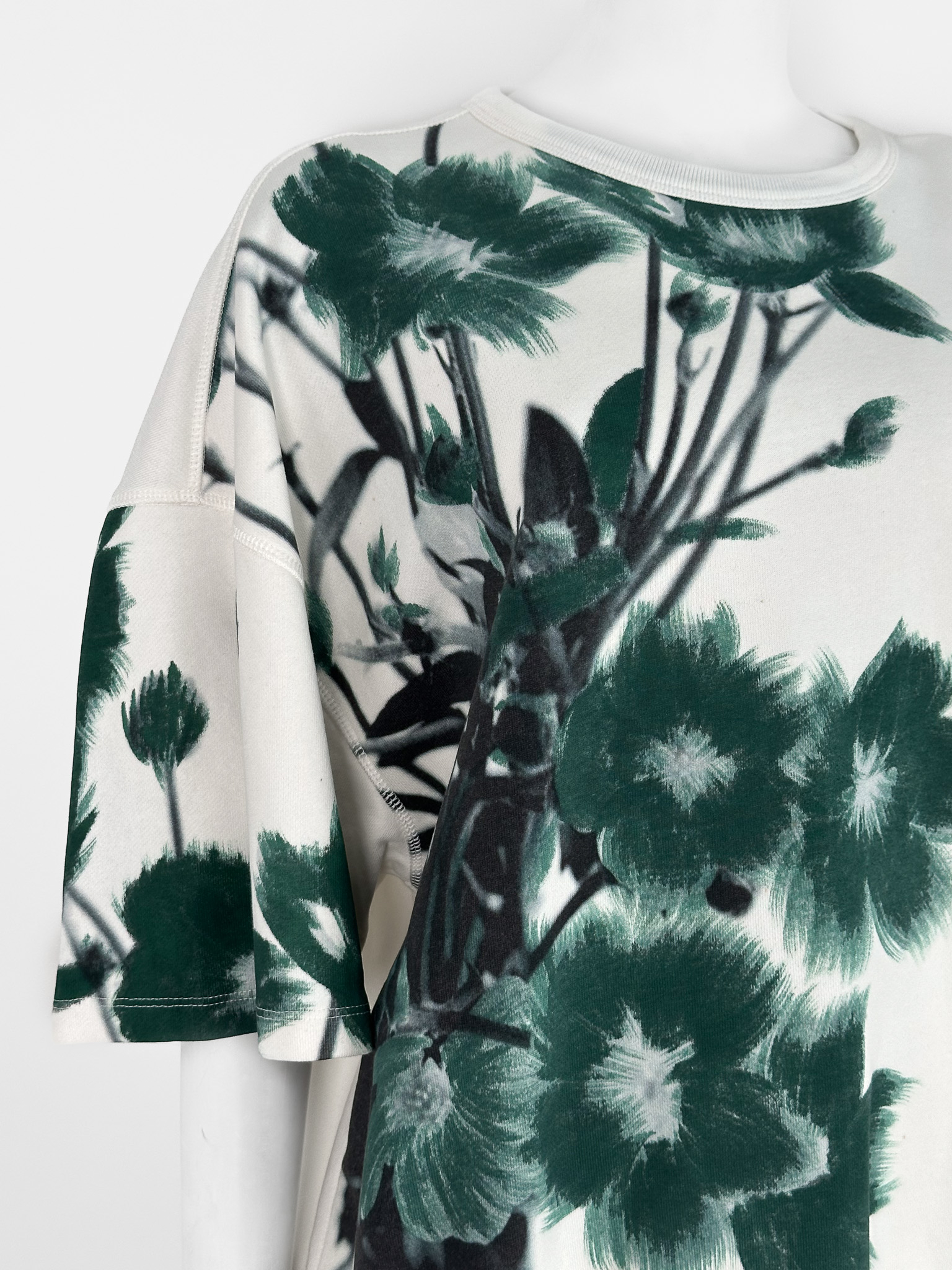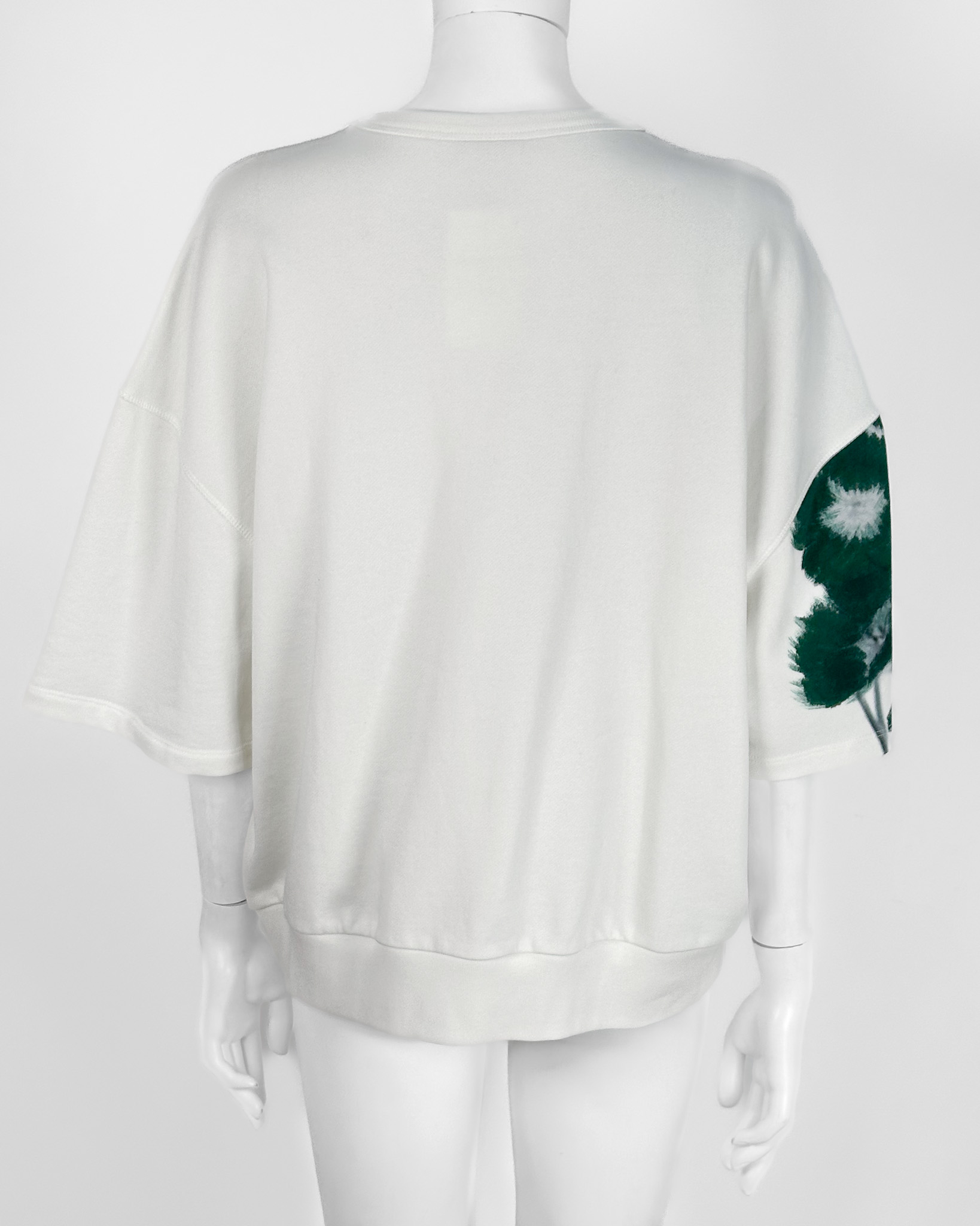 "Biała bluza na krótki rękaw, z motywem zielonych kwiatów po lewej stronie. 100% bawełna. Rozmiar z metki M. Wymiary: długość 66cm, szerokość pod pachami na płasko: 67cm."