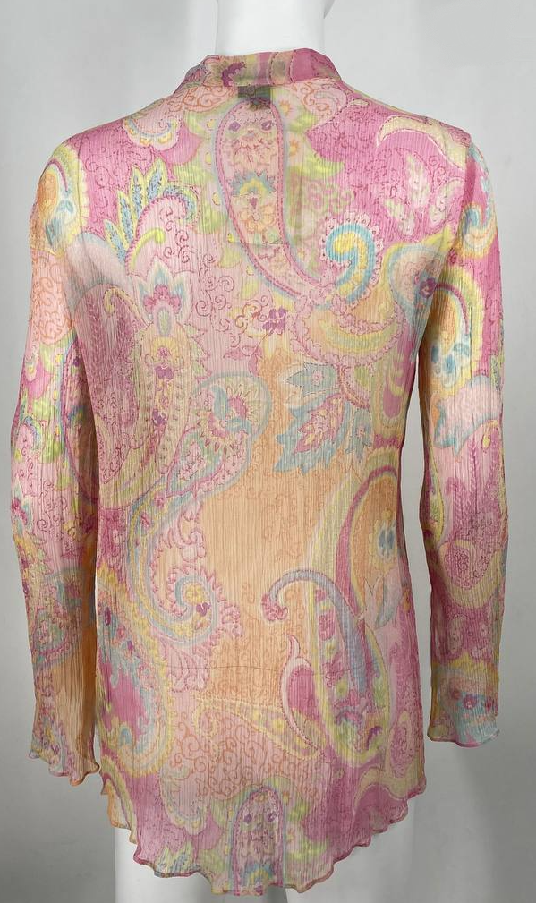 "Bluzka z długim rękawem transparentna kolorowa, dekolt w szpic, przy rękawach rozcięcia. Rozmiar: M. Skład: 100% jedwab.