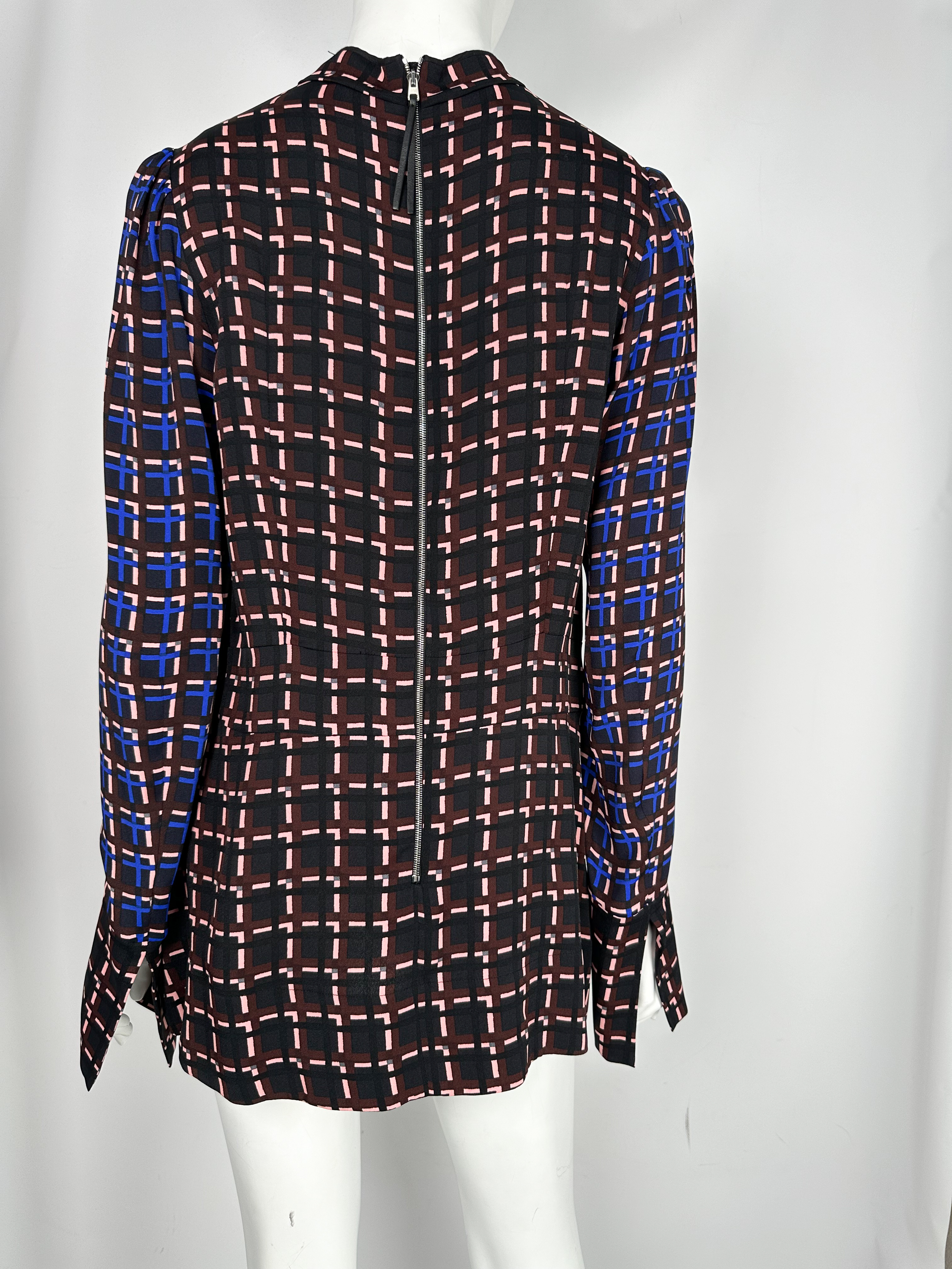 "Bluzka z długim rękawem w wielobarwną kratę, wykonana z wiskozy, stójka, zapinana w tylnej części na srebrny suwak wykończony czarną skórą, rozcięcia na mankietach, delikatnie marszczona na ramionach. Rozmiar z metki IT 44. Skład 100% wiskoza. Wymiary: szerokość mierzona od pachy do pachy 49cm, długość całkowita 72cm, długość rękawa 70cm."