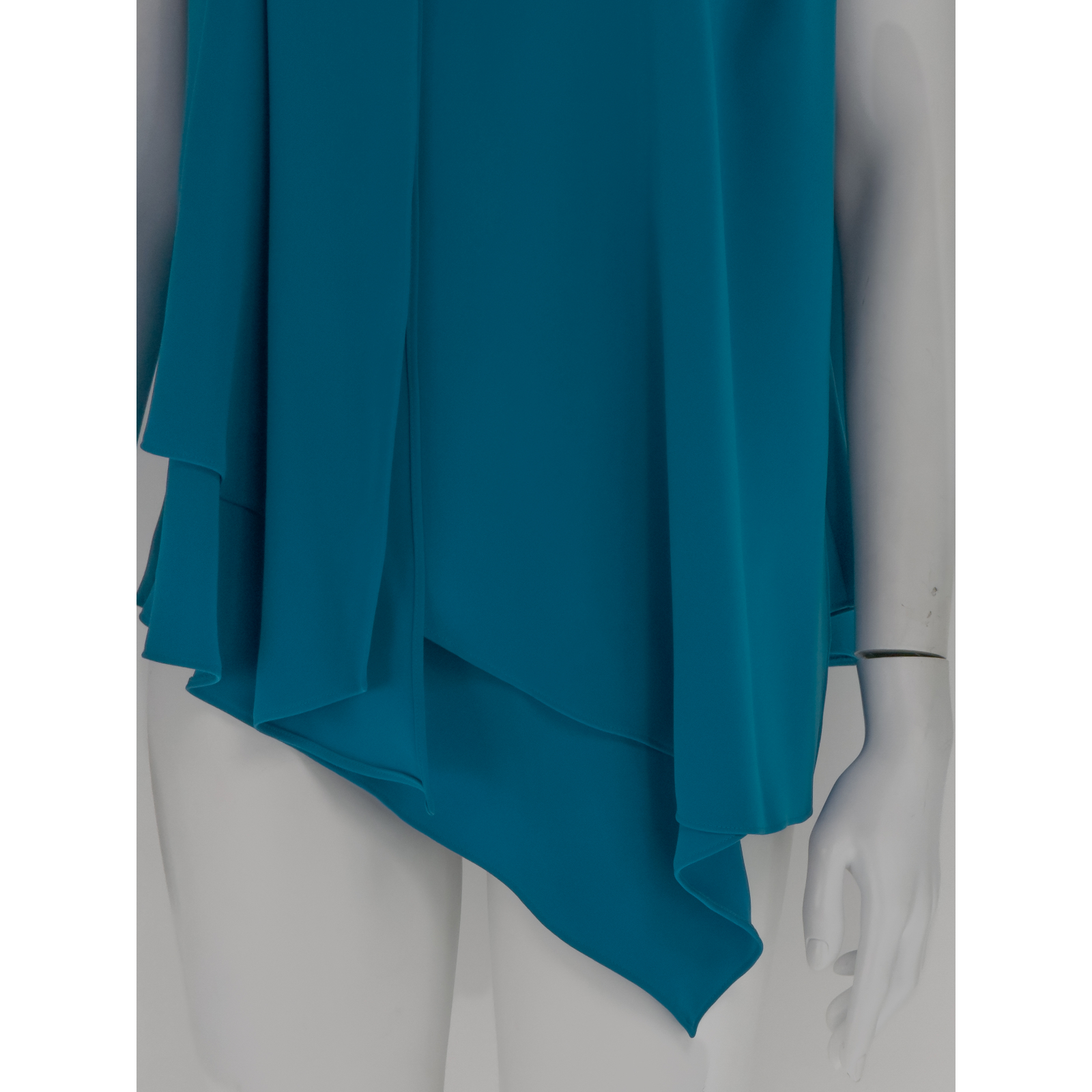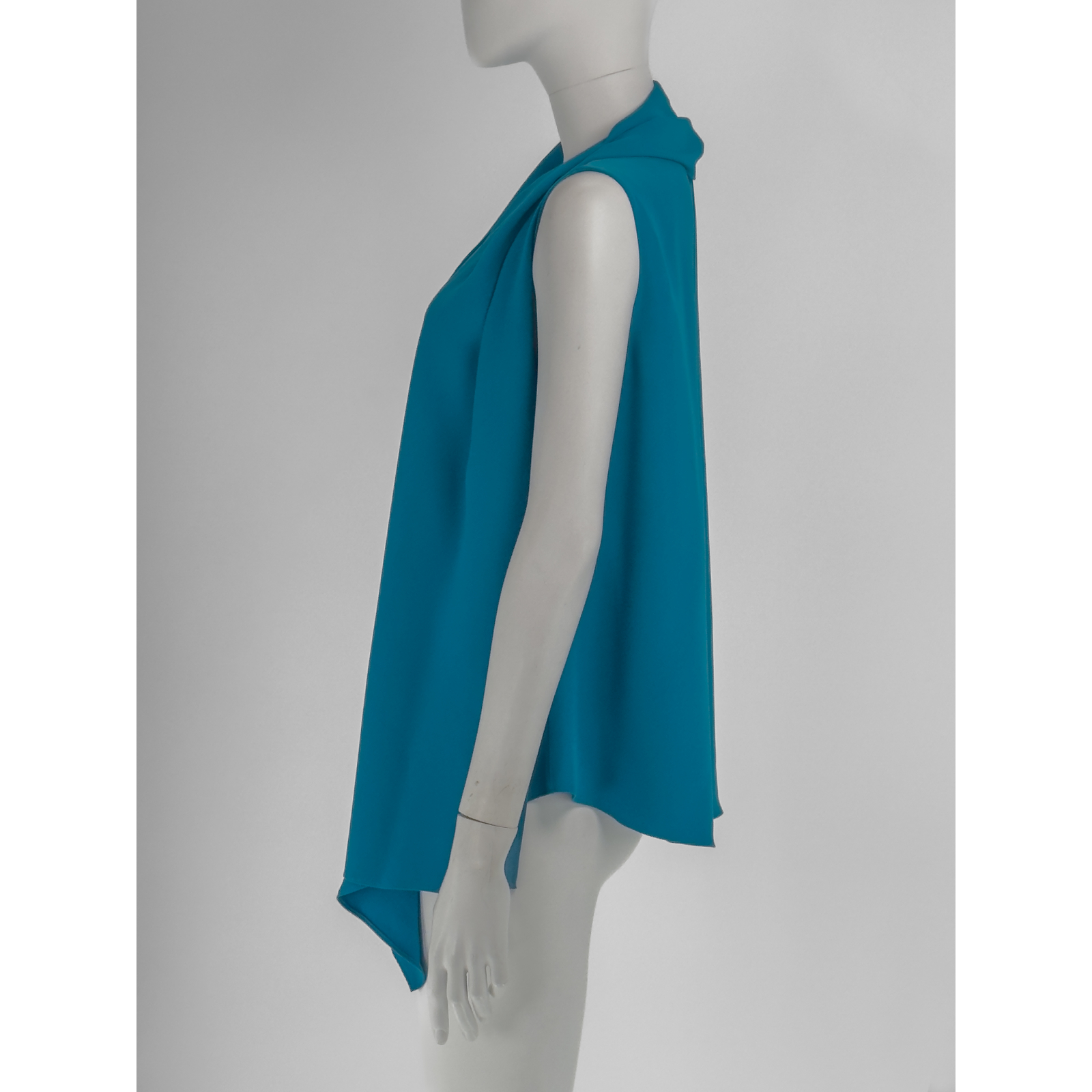 "Niebieska bluzka bez rękawów, asymetryczna, lejący materiał, zaokrąglony dekolt, wycięcie w kształcie łezki oraz zapięcie na guzik w tylnej części. Rozmiar z metki M. Skład: 100% poliester. Wymiary: szerokość mierzona od pachy do pachy 52cm, długość całkowita 57cm."