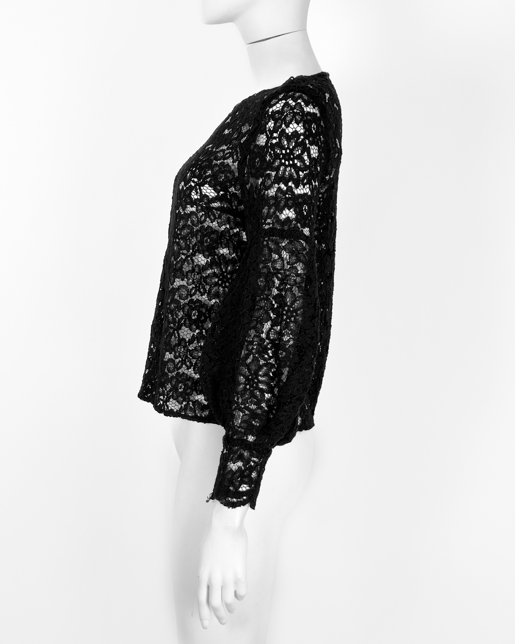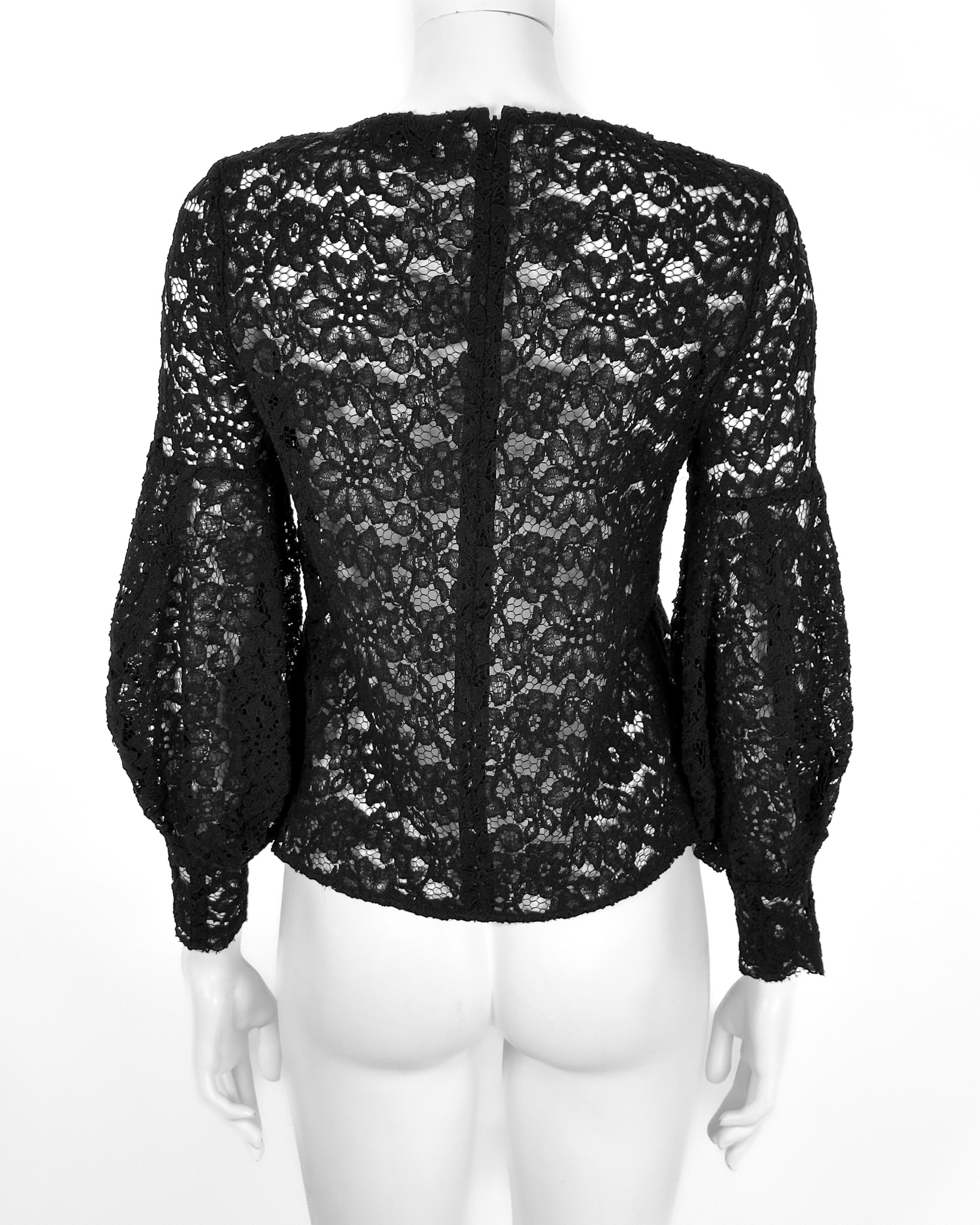 "Czarna ażurowa bluzka koszulowa z ozdobnymi, bufiastymi rękawami. Z motywem kwiatów. Z zamkiem z tyłu. Wymiary: długość: 55cm, szerokość pod pachami: 43 cm. Skład: 75% bawełna, 25% poliamid, lamówka: 100% wiskoza."