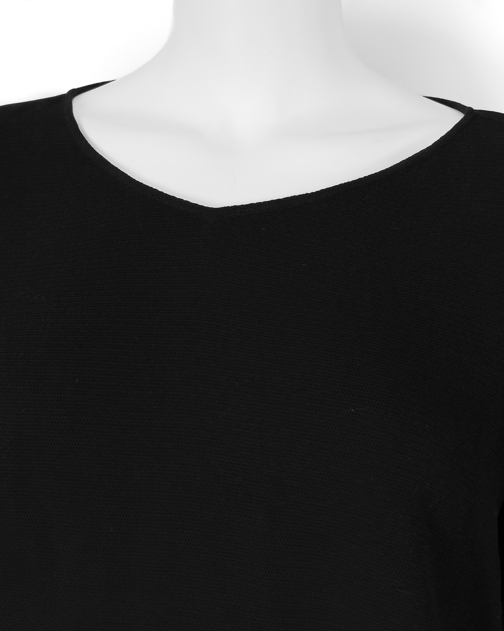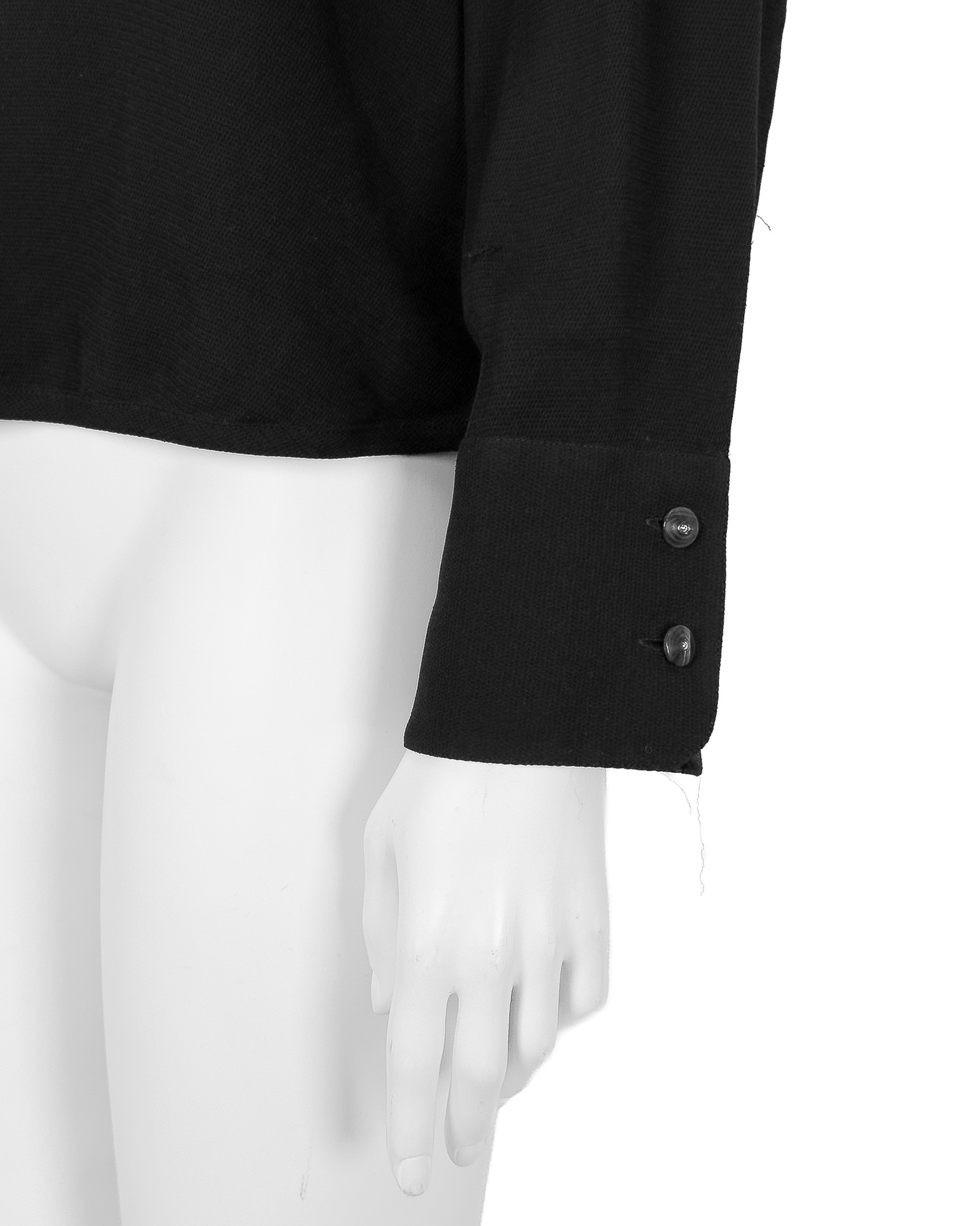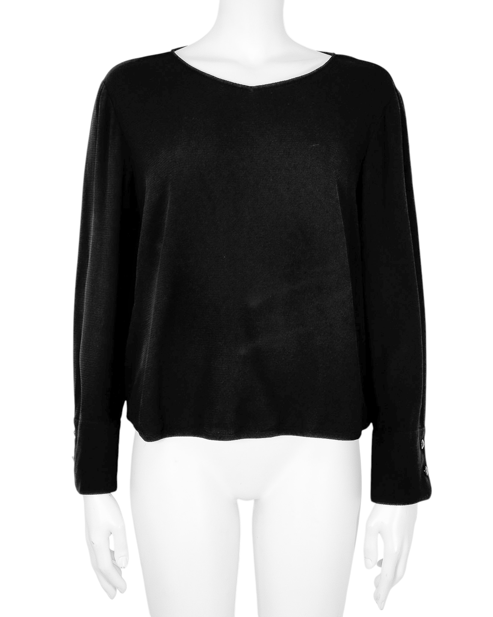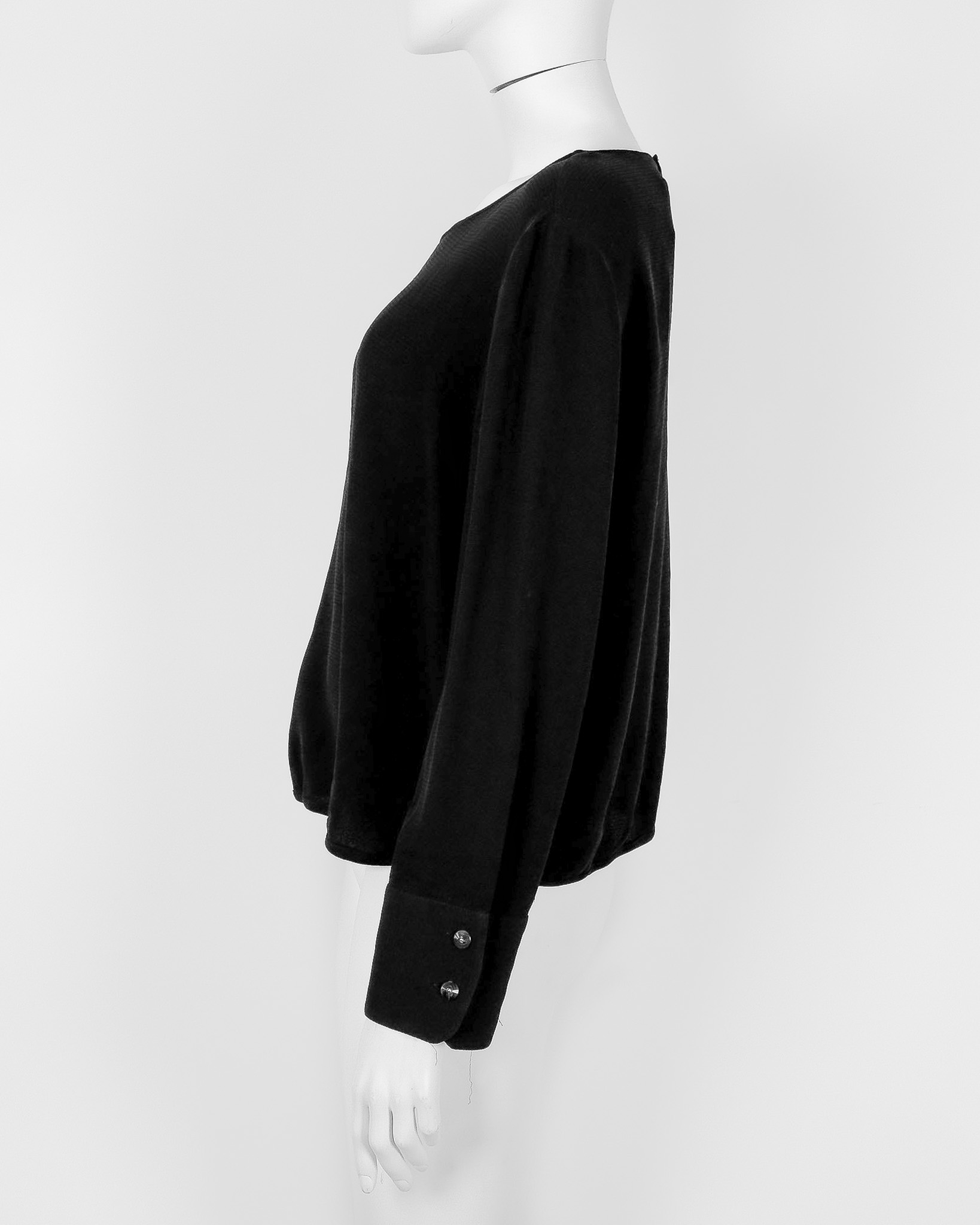 "Czarna bluzka z długim rękawem, prosty krój, rozpinane mankiety ozdobione granatowymi guzikami, zapinana na jeden guzik na plecach, zaokrąglony dekolt, wykończona delikatną gumą w dolnej części. Stan dobry, posiada małe zaciągnięcia na materiale. Rozmiar z metki IT 46. Brak metki ze składem. Wymiary: szerokość mierzona od pachy do pachy 55cm, długość całkowita 56cm."