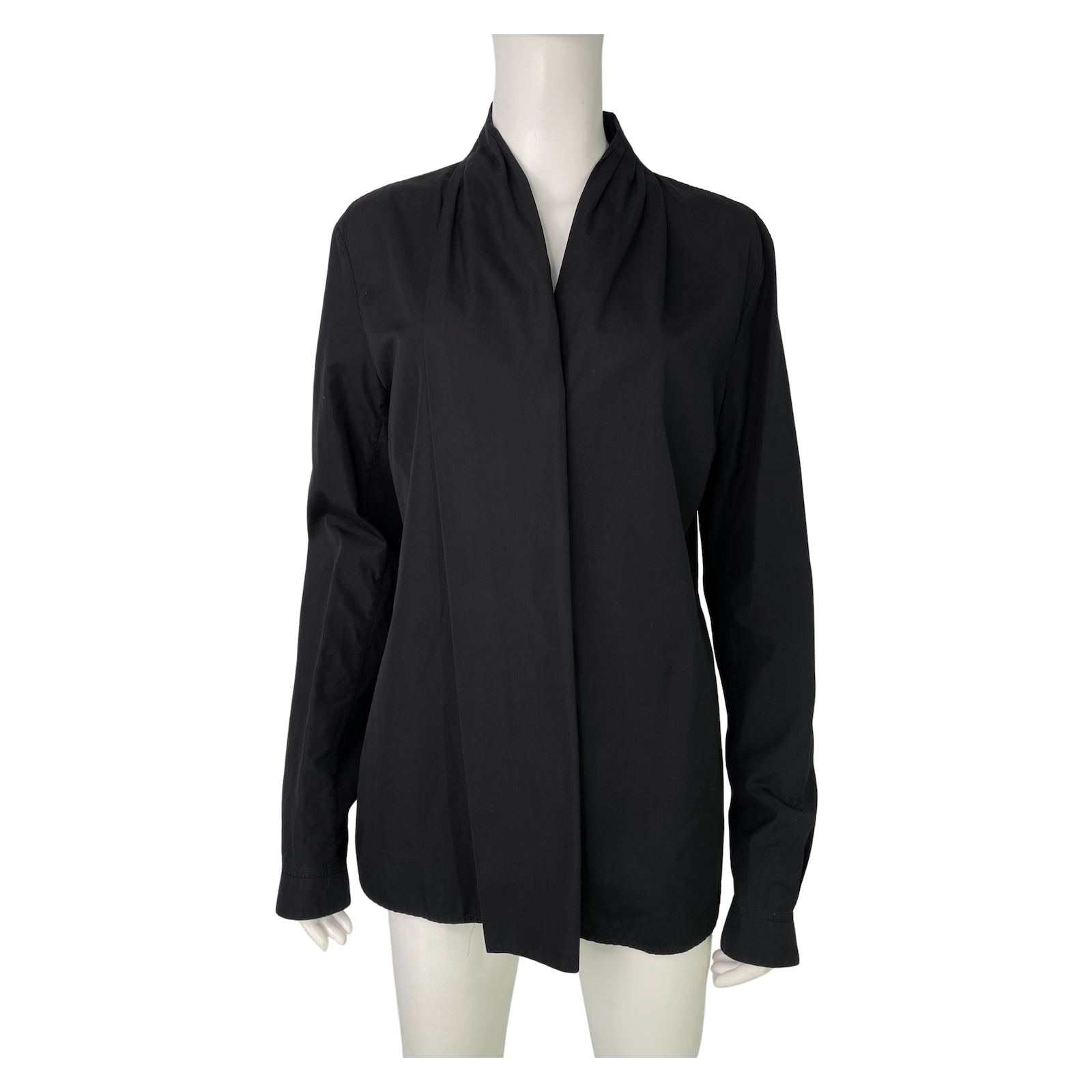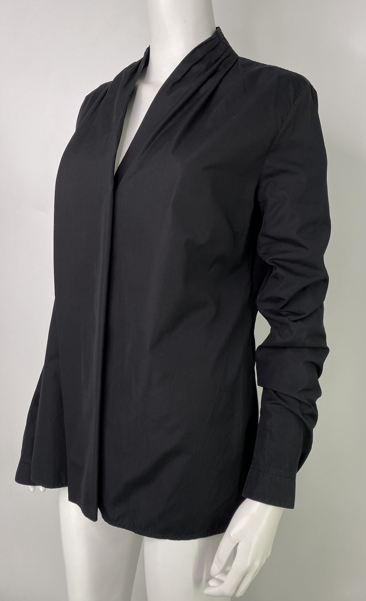 "czarna, koszulowa bluzka, ozdobna fałda materiału przy dekolcie i przez środek, pod nią ukryte guziki, długi rękaw. Skład: 100% bawełna. Rozmiar M. Wymiary: szer. ramion 40 cm, szer. biustu 51 cm, szer. talii 48 cm, dł. całkowita 70 cm, dł. rękawa 67 cm."