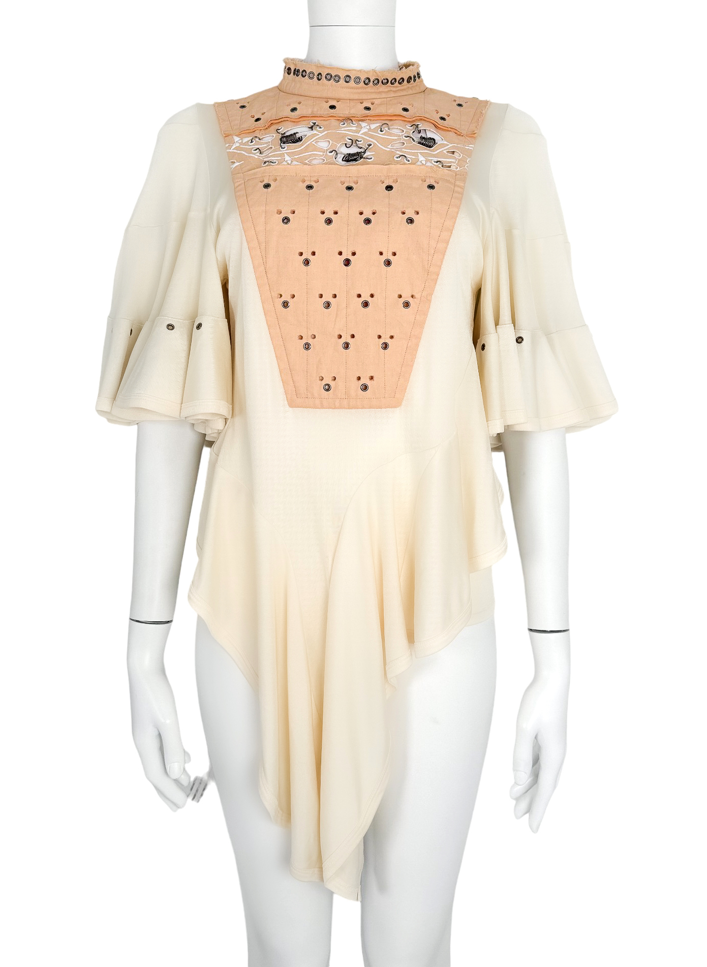 "Kremowa bluzka ozdobiona w przedniej części ażurową brzoskwiniową wstawką wykończoną białą wyszywaną grafiką oraz srebrnymi okrągłymi dżetami, postrzępiona stójka, asymetryczny dół, rękaw o długości 3/4 z falbanami, zapinana w tylnej części na kryty logowany suwak. Rozmiar z metki 34. Skład: 100% wiskoza, drugi materiał: 100% len. Wymiary: szerokość mierzona od pachy do pachy 40cm, długość całkowita 62cm."