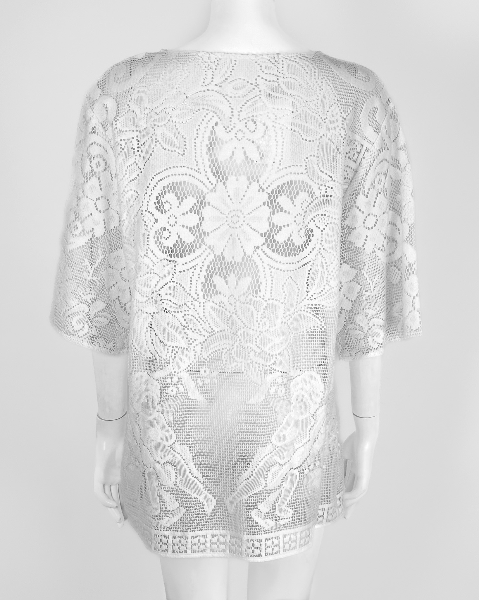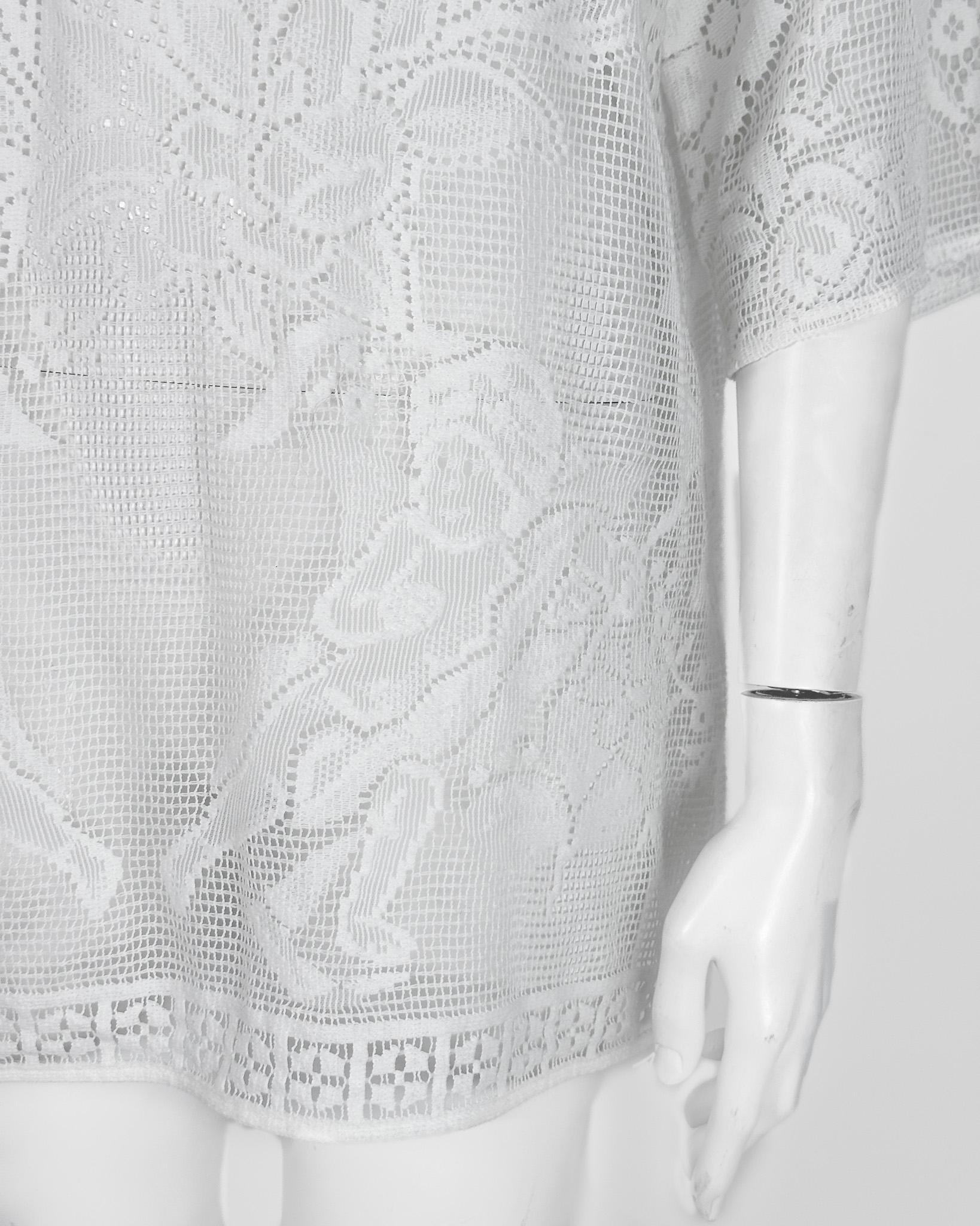 "Biała ażurowa bluzka. W kolorze białym z motywem koronki i aniołków. Sprawdzi się jako narzutka na top, strój kąpielowy. Bez żadnych metek.