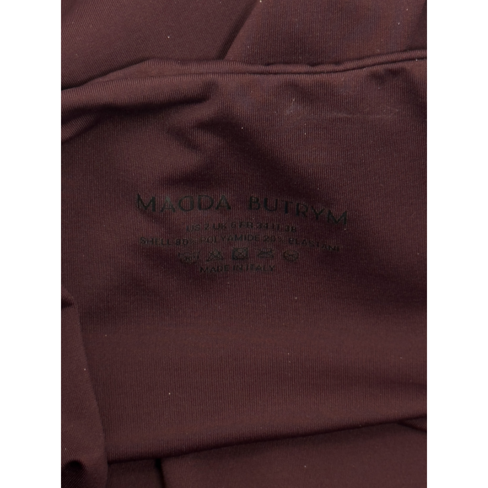 "Burgundowy body/ strój kąpielowy na regulowanych cienkich ramiączkach, ozdobiony różami na miseczkach, wszyte fiszbiny, srebrne okucia, głębokie wycięcia na biodrach. Rozmiar z metki IT 38. Skład: 80% poliamid, 20% elastan. Wymiary: szerokość mierzona od pachy do pachy 32cm, długość całkowita 63cm."