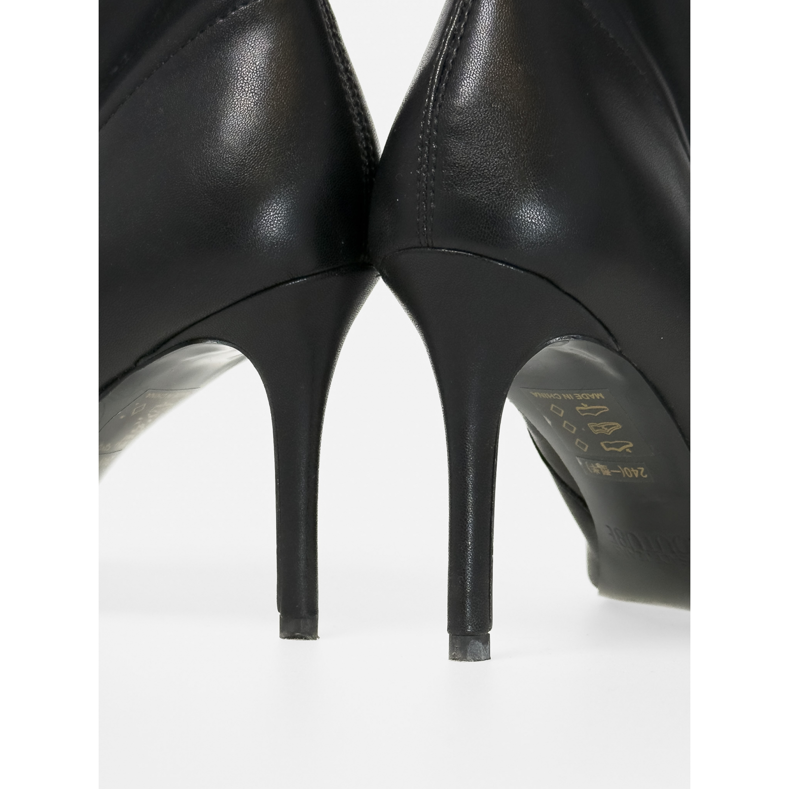 "Czarne skórzane botki na obcasie, nosek w szpic ozdobiony złotą wstawką z logo marki, miękka skóra, dopasowana cholewka, ozdobione przeszyciem, zapinane od wewnętrzne strony na suwak, używane. Stan dobry, posiadają przetarcia na podeszwie i flekach, delikatne zadrapanie na prawym nosku na skórze. Rozmiar 38."