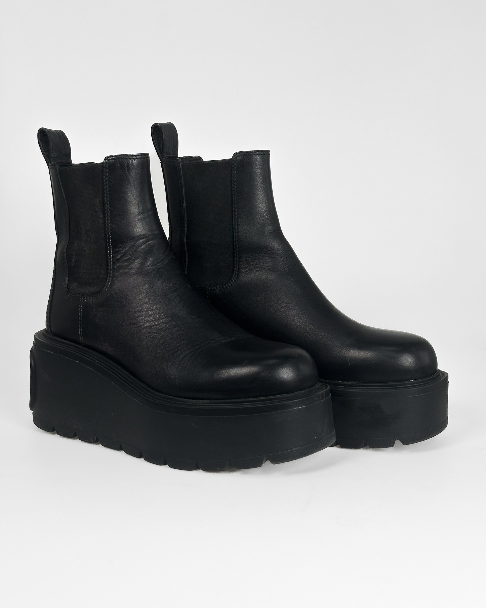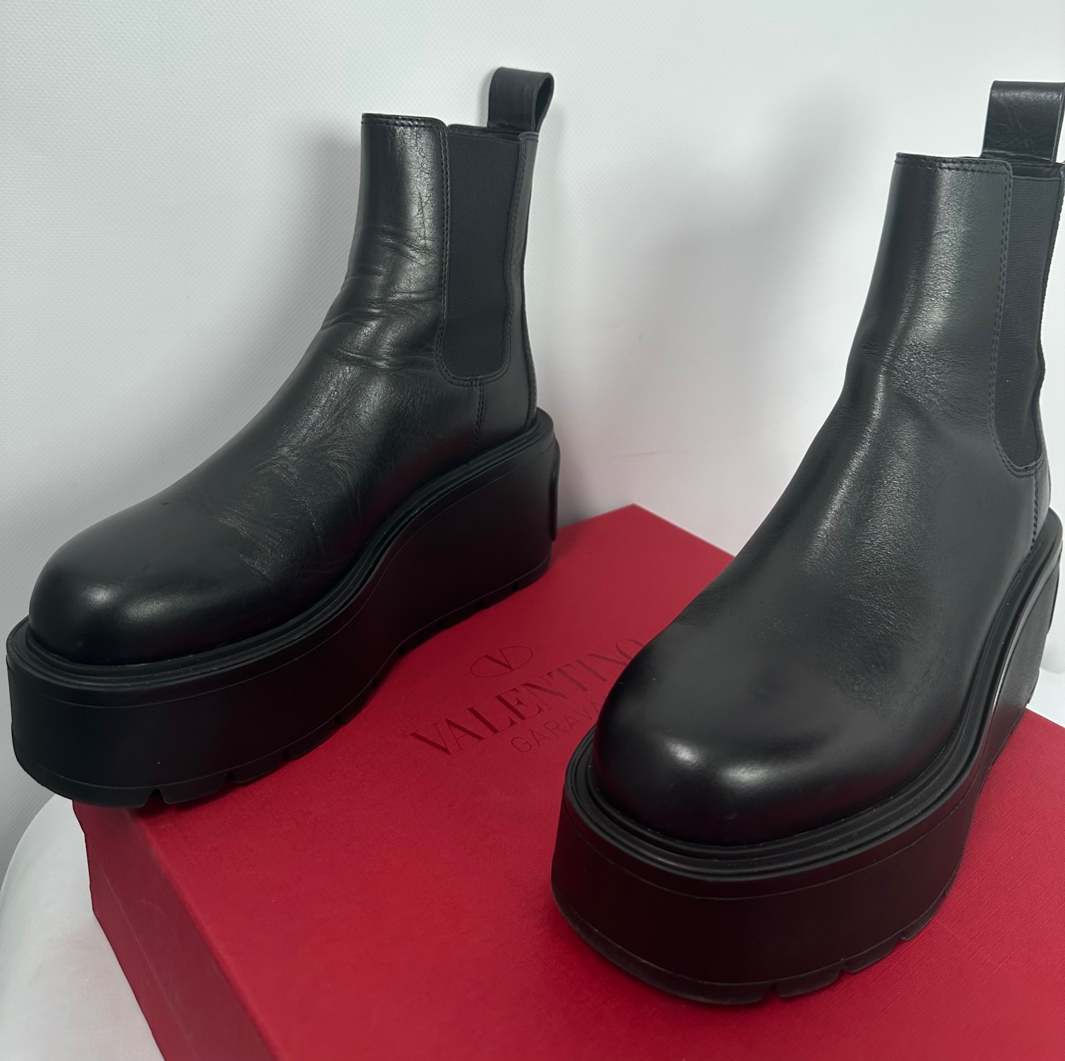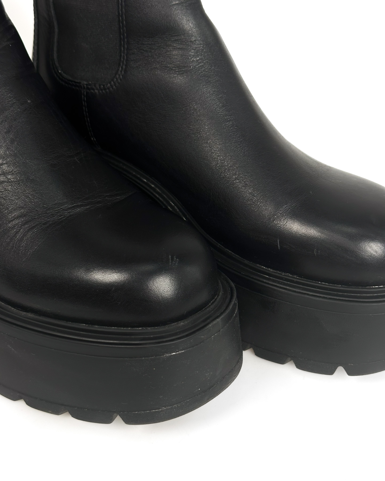 "Czarne botki na platformie. Logo z tyłu. Rozmiar 38,5. Pudełko w komplecie. Zewnątrz: skóry cielęcej 100%, poliester 74%, elastodyn 26%. Podszewka: skóra kozia 100%, skóra jagnięca 100% Podeszwa: Guma 100%."