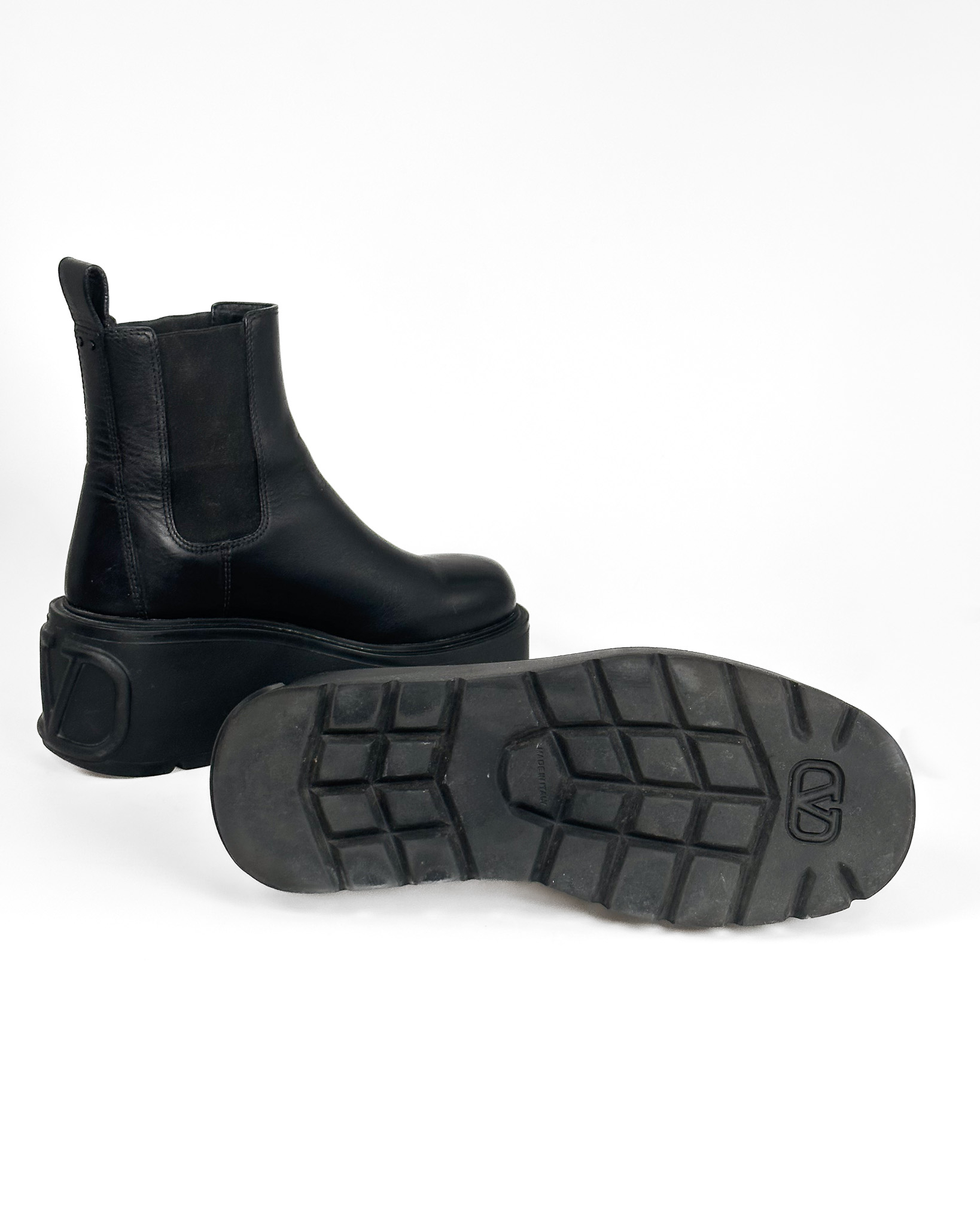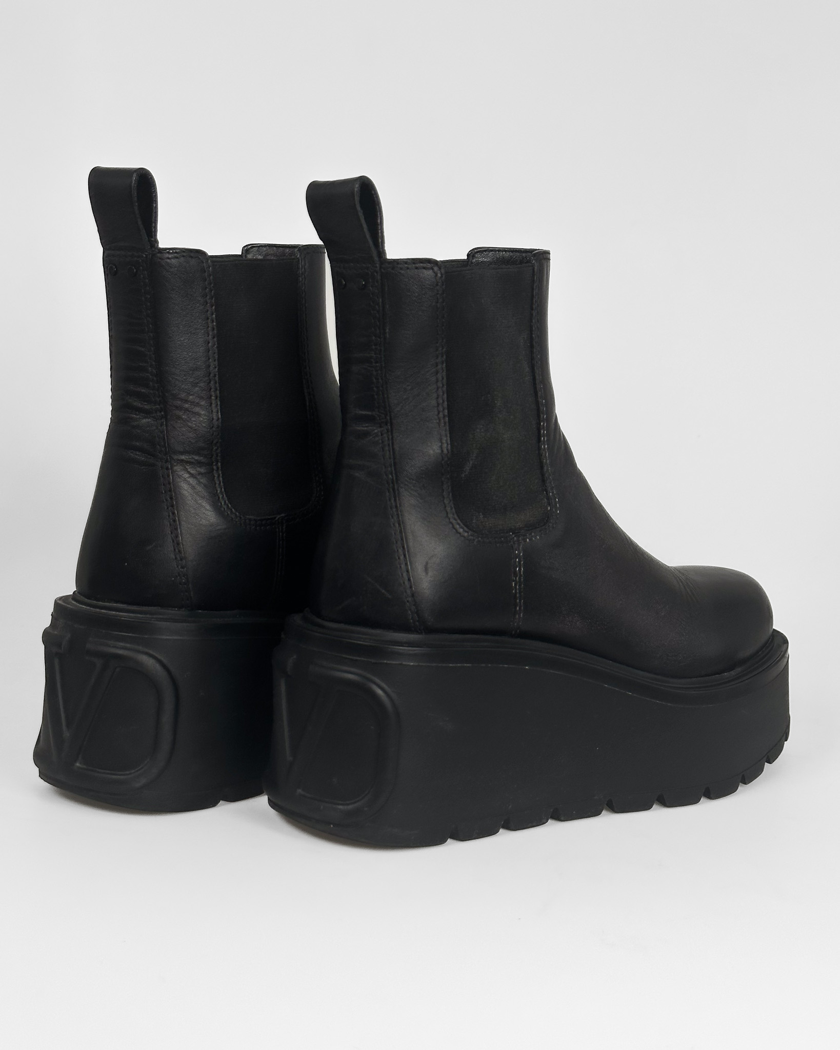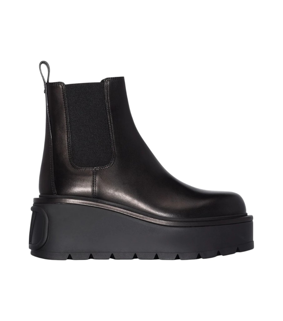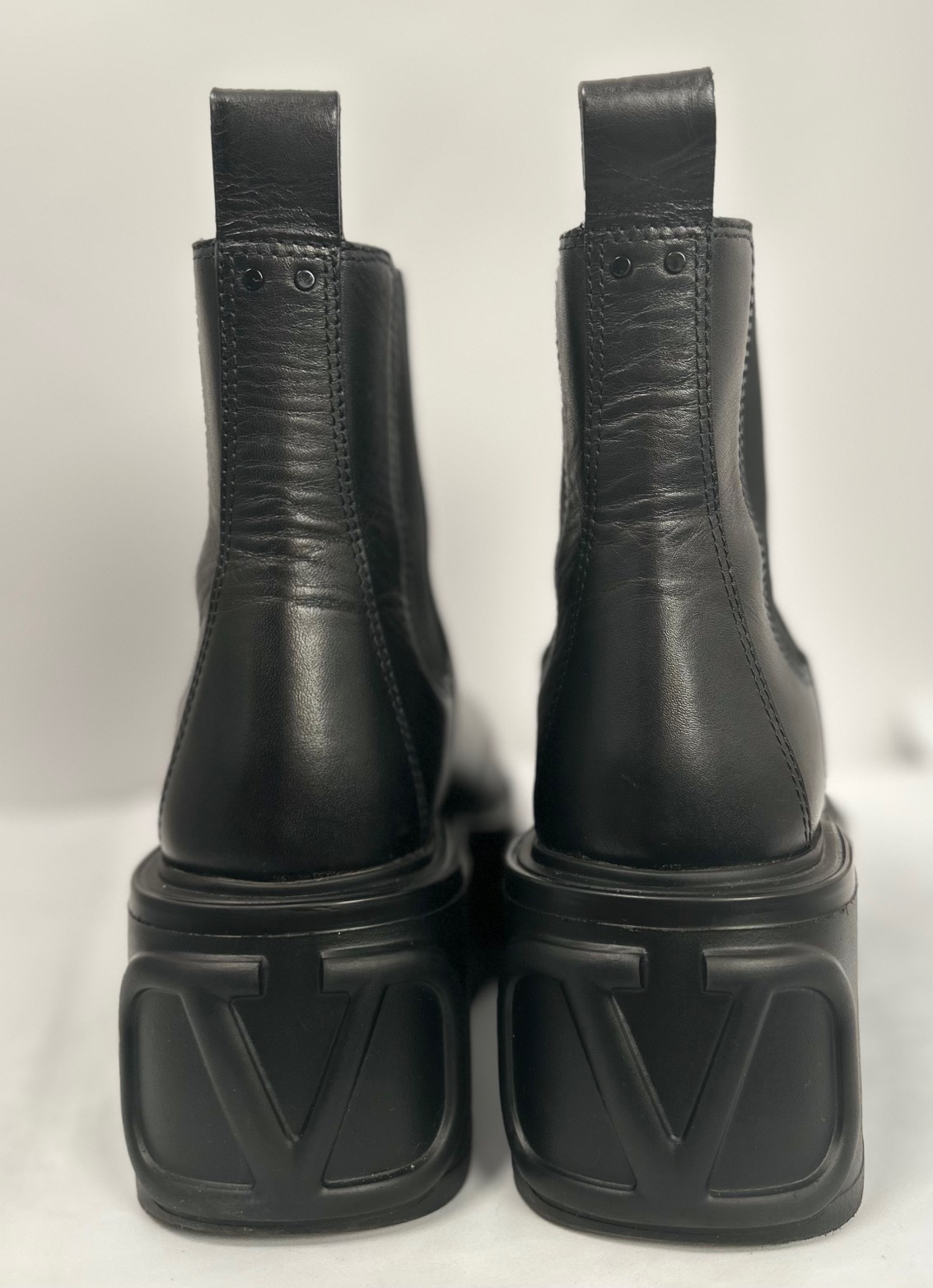 "Czarne botki na platformie. Logo z tyłu. Rozmiar 38,5. Pudełko w komplecie. Zewnątrz: skóry cielęcej 100%, poliester 74%, elastodyn 26%. Podszewka: skóra kozia 100%, skóra jagnięca 100% Podeszwa: Guma 100%."