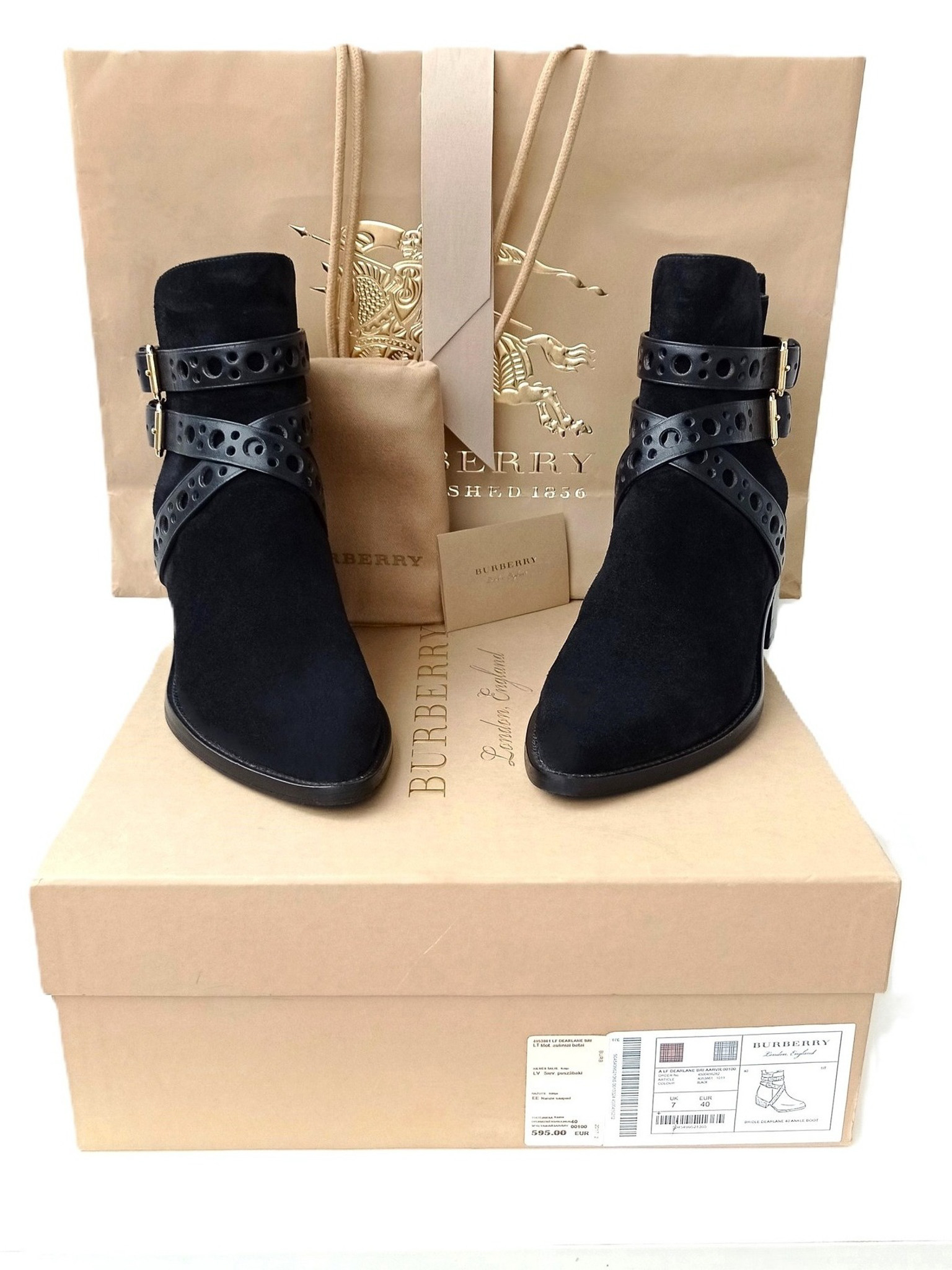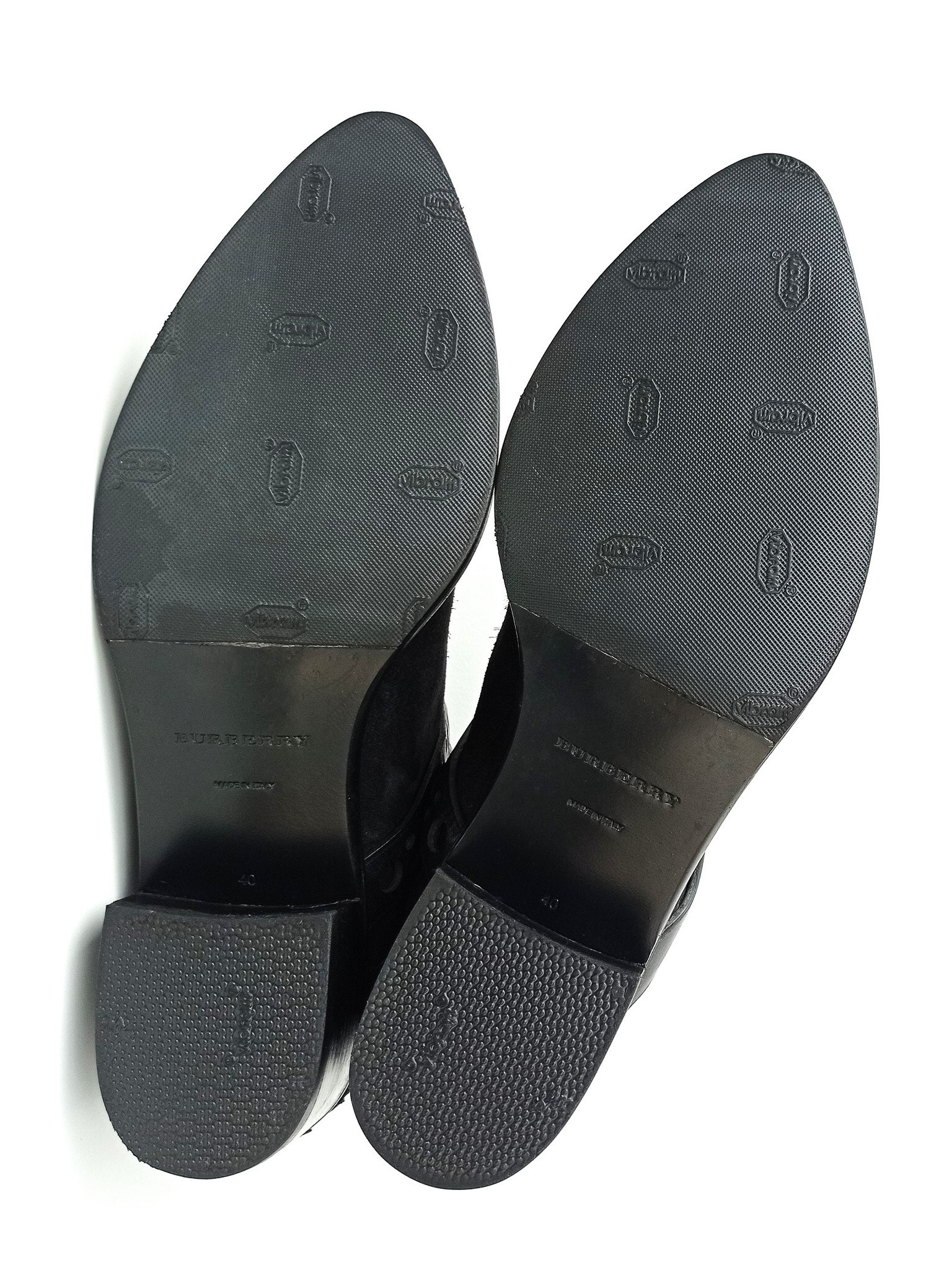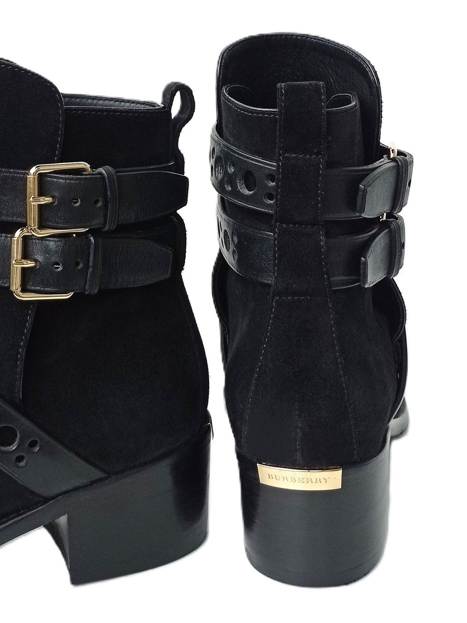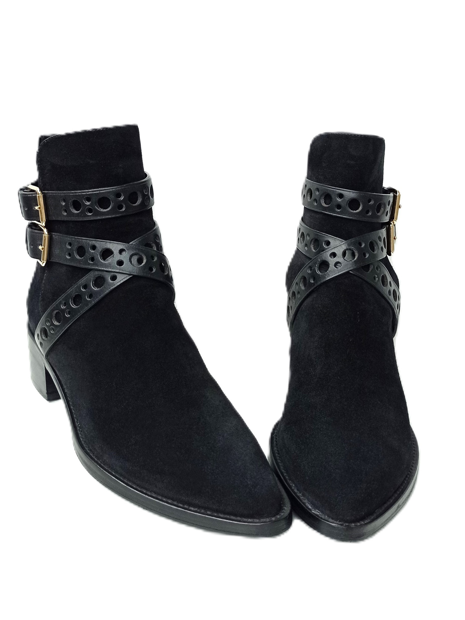 "Czarne botki wykonane z łączonych skór: zamszu oraz skóry licowej z dodatkiem metalowych elementów w kolorze złota,