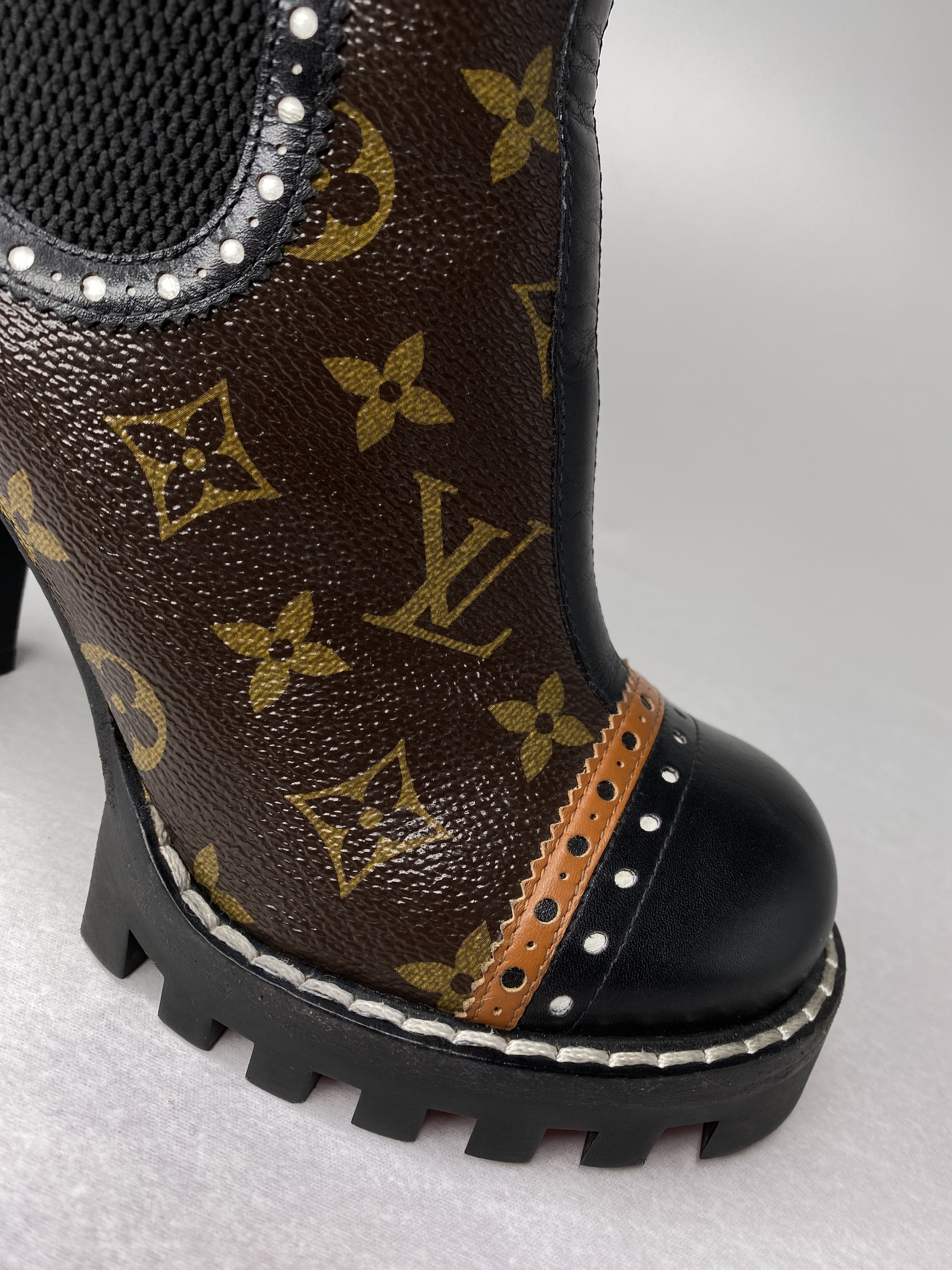 "brązowo-czarne botki, monogram, obcas słupkowy, traperowa podeszwa, materiałowe wstawki na kostce, używane, stan bardzo dobry, lekko starte fleki, rysy na obcasach, pudełko. Rozmiar 36. Wys. obcasa 9,5 cm."