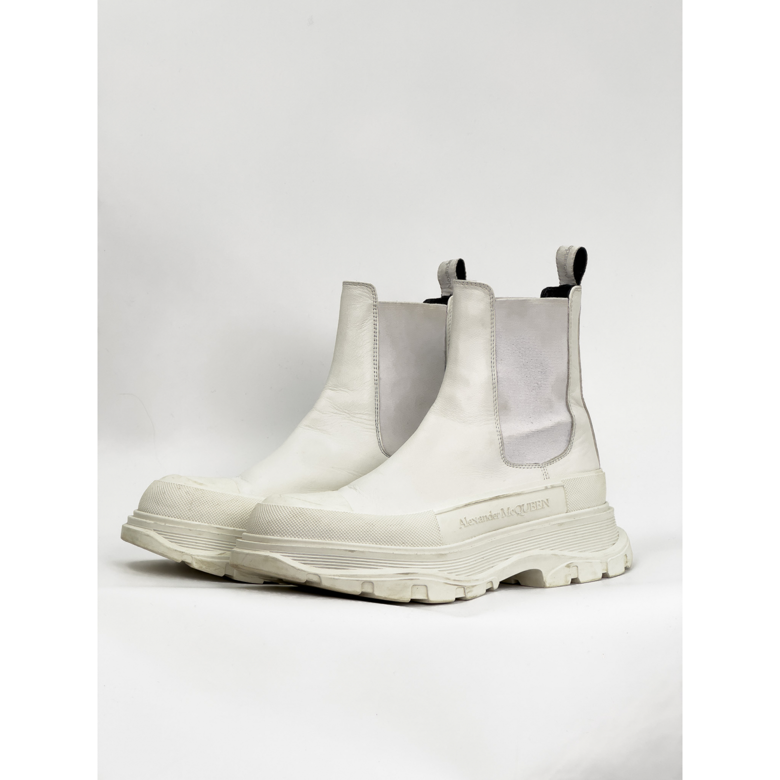 "Białe skórzane botki, logo marki od zewnętrznej strony, gumowa wyższa podeszwa, wsuwane, guma w bocznej części, zaokrąglone noski, pętelka, używane. Stan dobry, zarudzenia oraz marszczenia na skórze. Rozmiar 39."