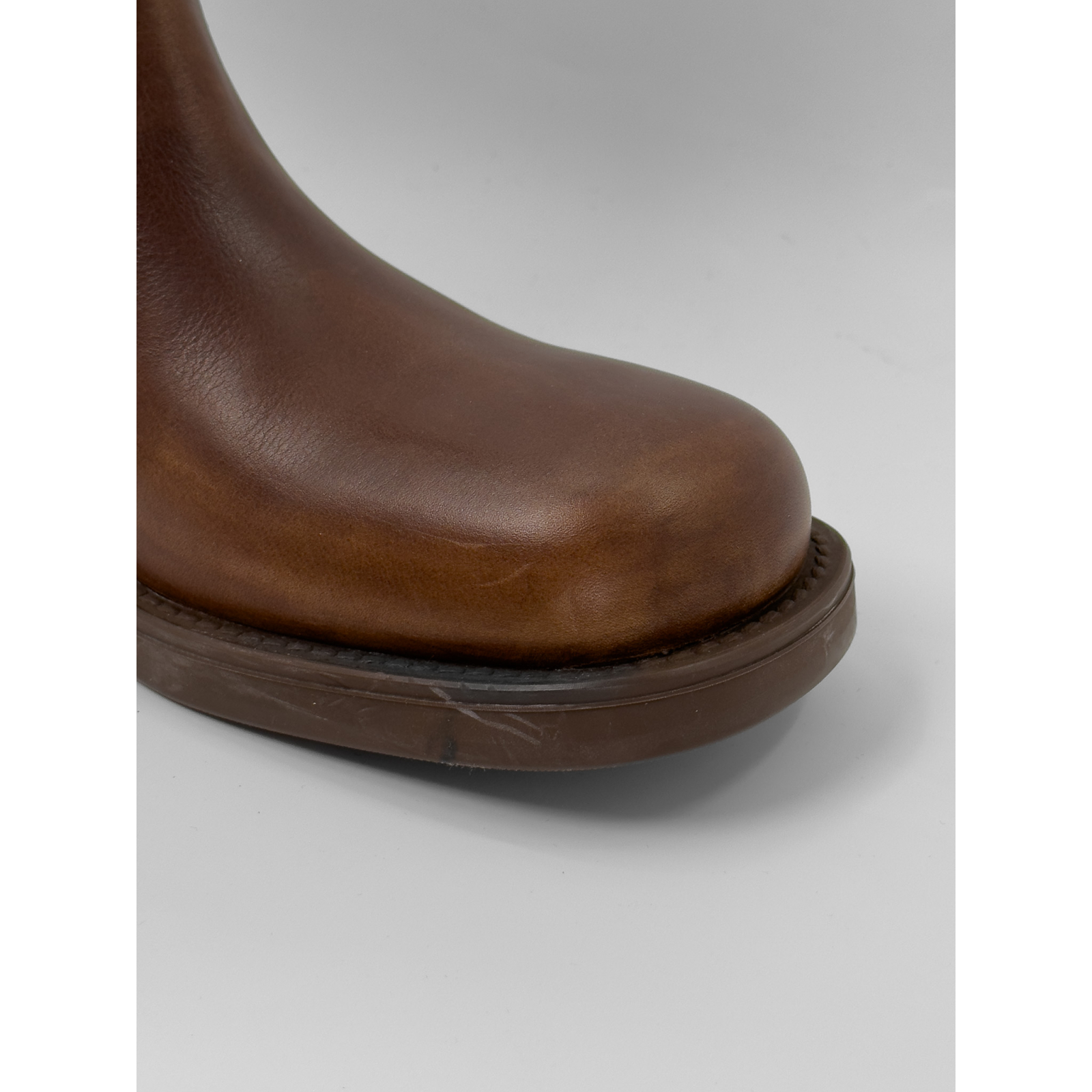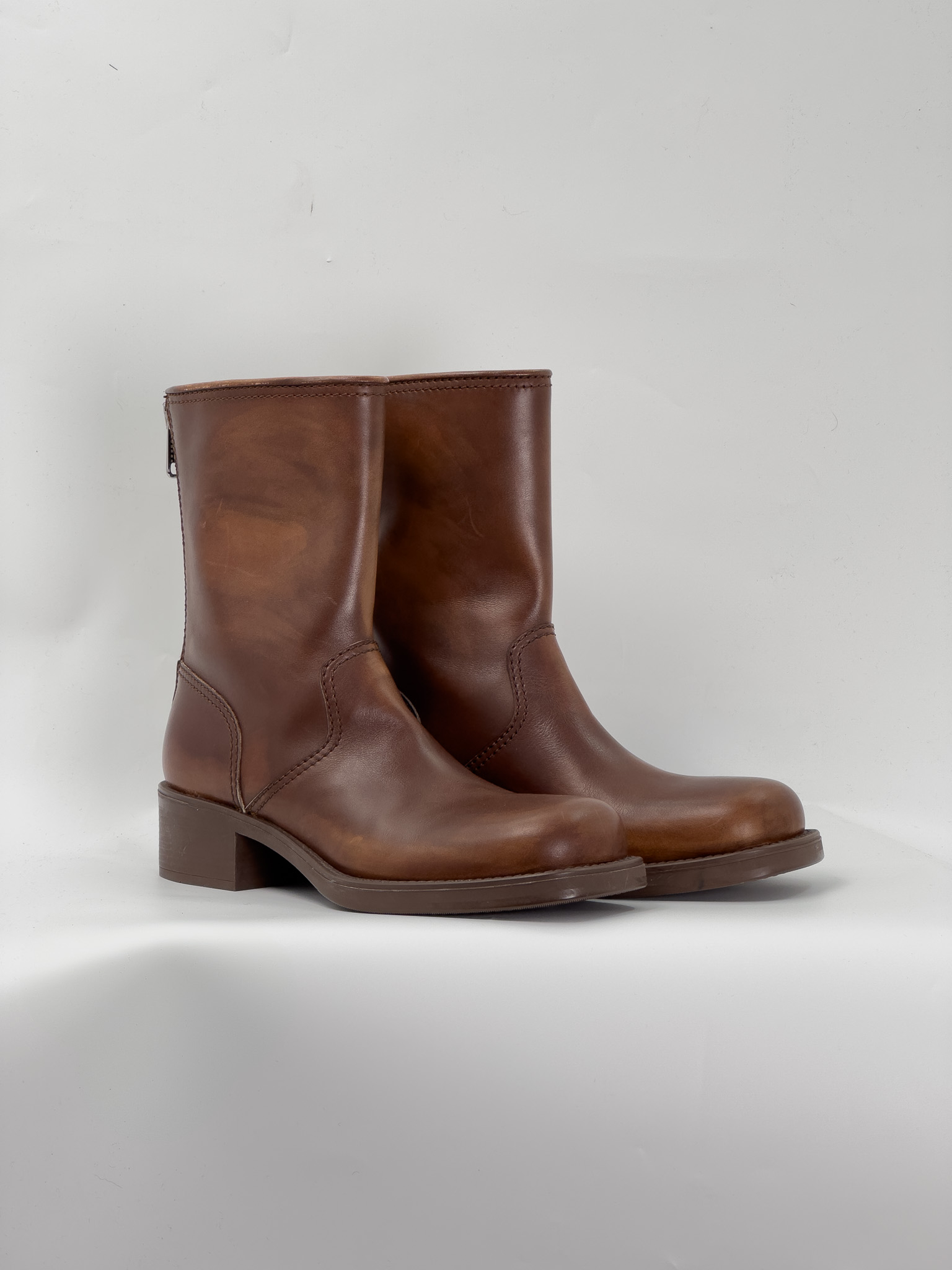 "Brązowe skórzane botki na obcasie, cieniowana skóra, ozdobione przeszyciami, srebrny logowany suwak w tylnej części, ścięte noski, gumowa podeszwa, w zestawie z pudełkiem, workami przeciwkurzowymi oraz dowodem zakupu. Stan idealny. Rozmiar 40."