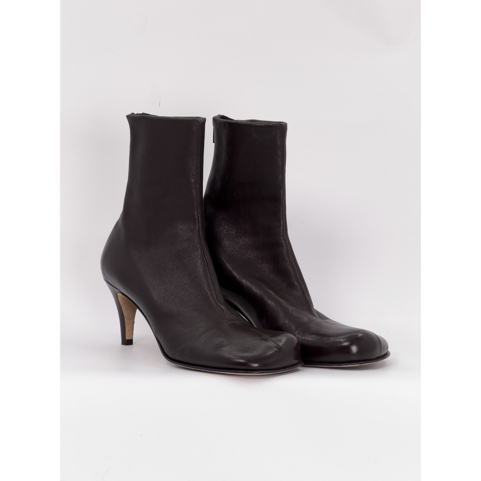 "Czekoladowe botki na obcasie, ścięte noski, zapinane w tylnej części na suwak, czekoladowo-cieliste wnętrze, używane. Stan dobry, przetarcia na podeszwie oraz delikatne zadrapania na obcasie. Rozmiar 38."