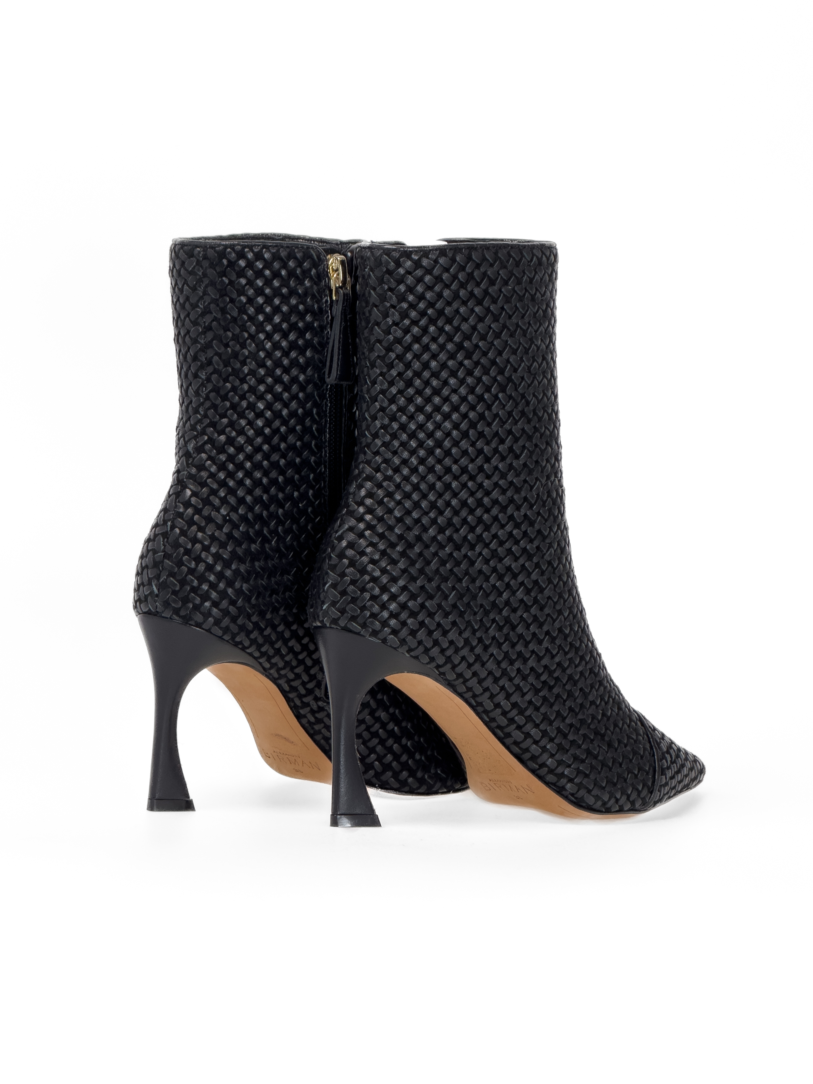 "Czarne botki na obcasie ozdobione skórzanym pleceniem, połączenie skóry oraz zamszu, zapinane od wewnętrznej strony na złoty suwak, zaokrąglony obcas, nosek w szpic. Stan nowe. Rozmiar 36. Wysokość obcasa 8 cm."