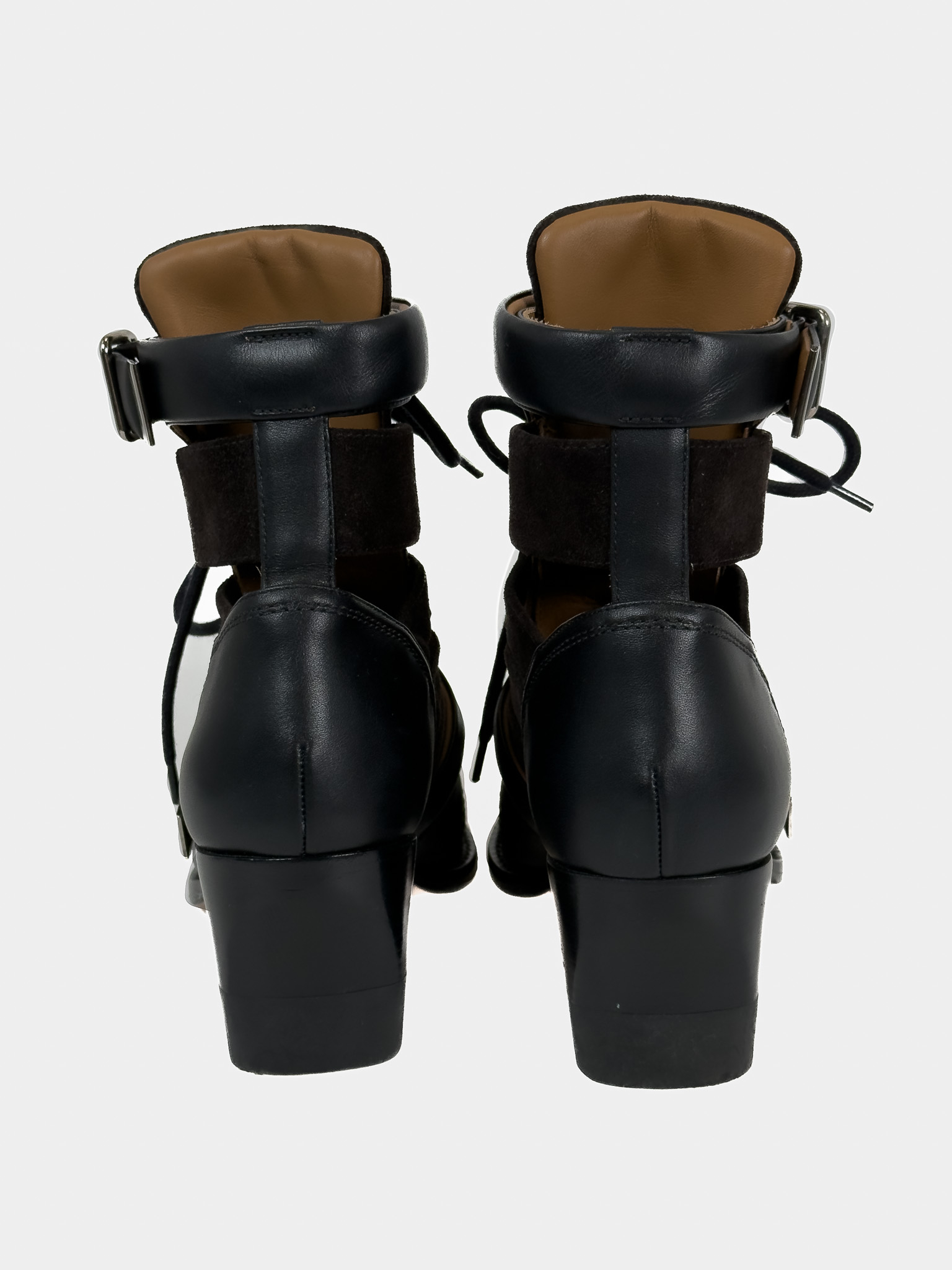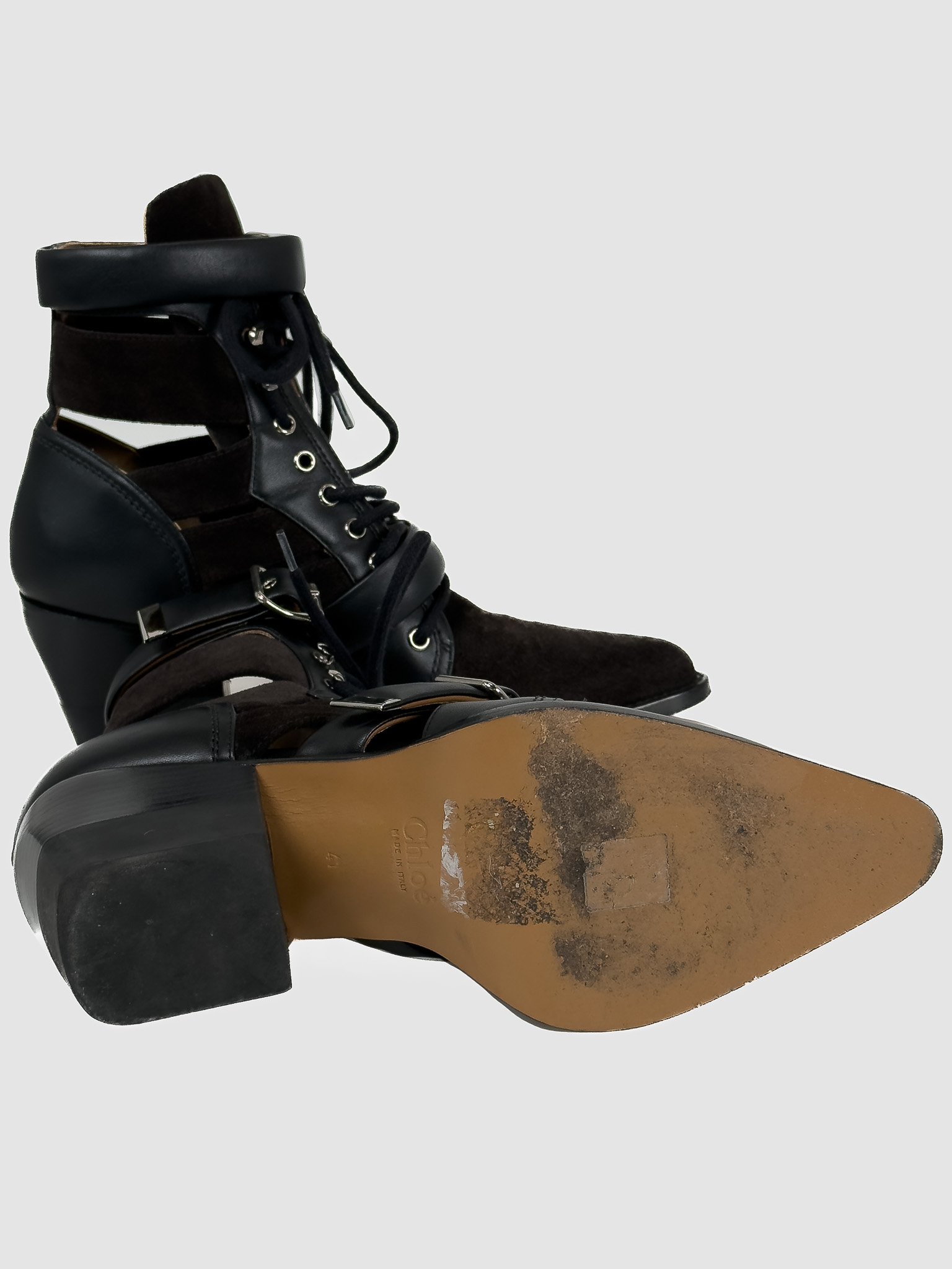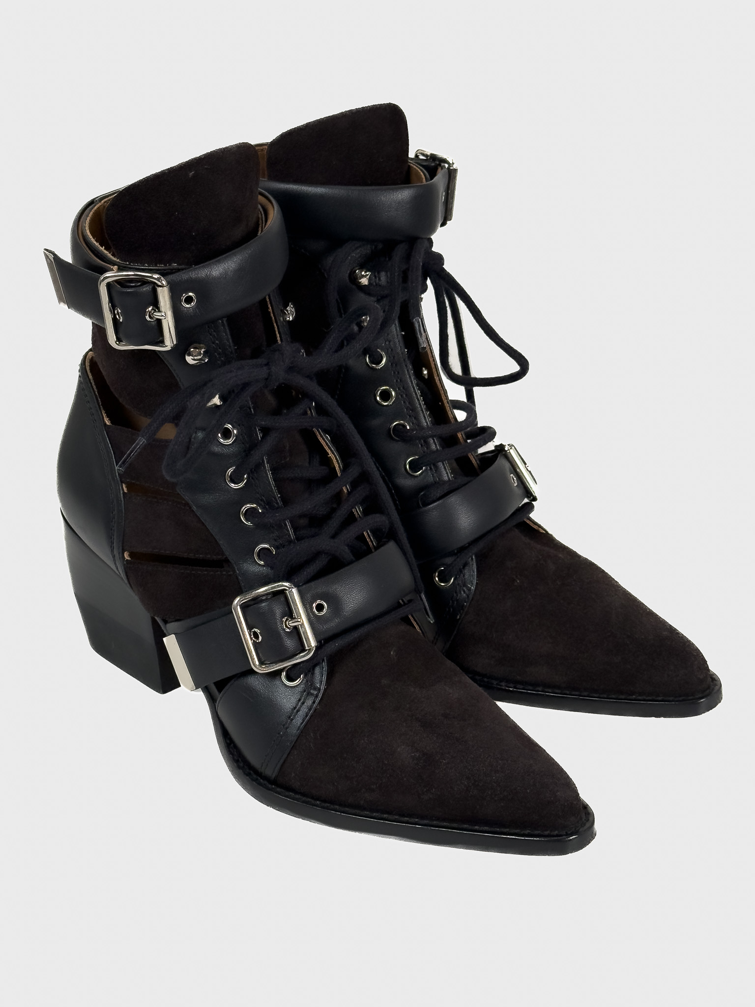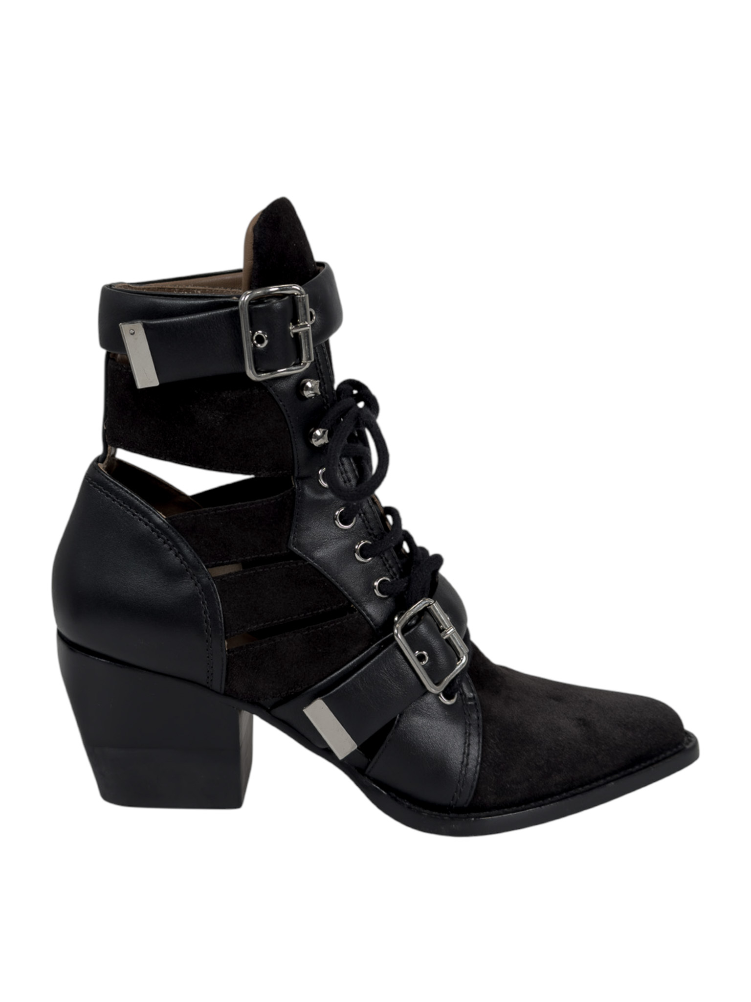 "Czarne botki, połączenie skóry i zamszu, srebrne ukucia, wiązane oraz zapinane paskiem na kostce. Skórzana camelowa skóra wewnątrz. Rozmiar 41. Stan bardzo dobry, użyte dwa razy. Obcas 7,7 cm. Czarne pudełko Vitkac w komplecie."