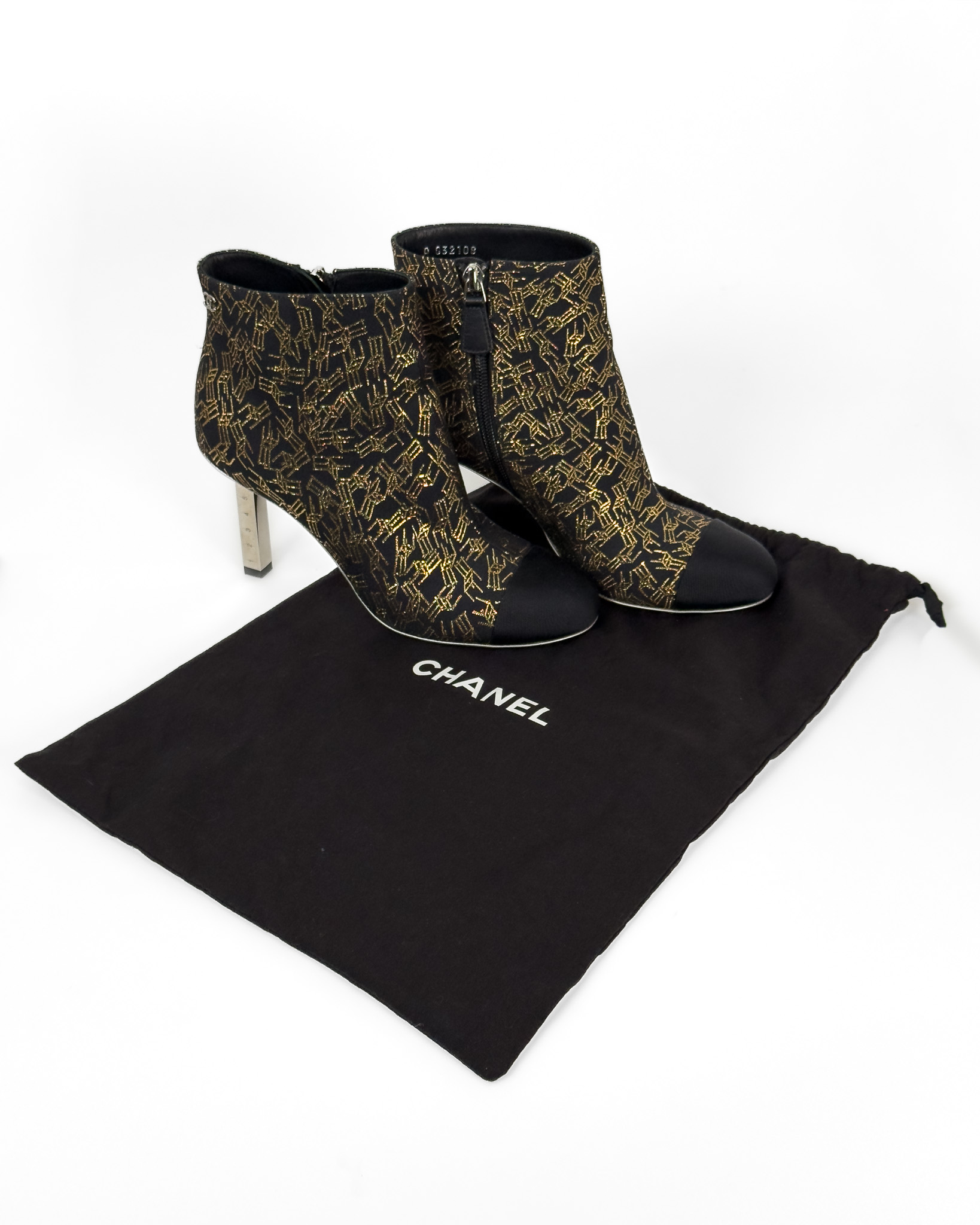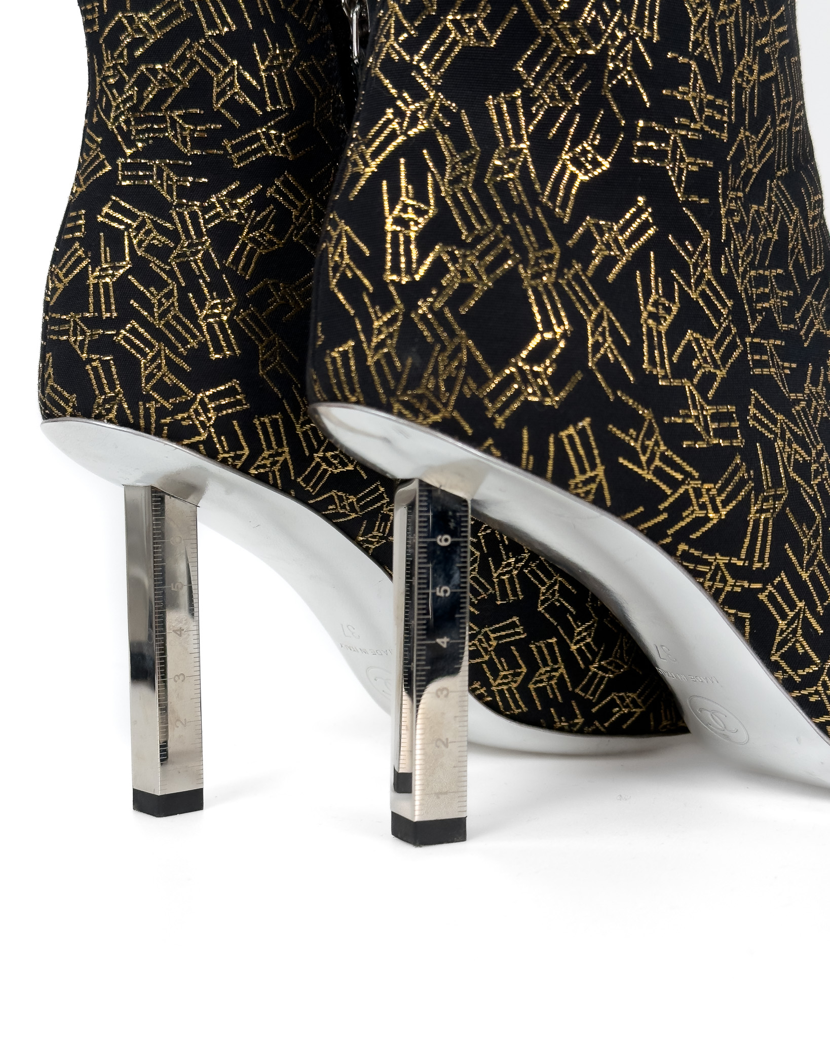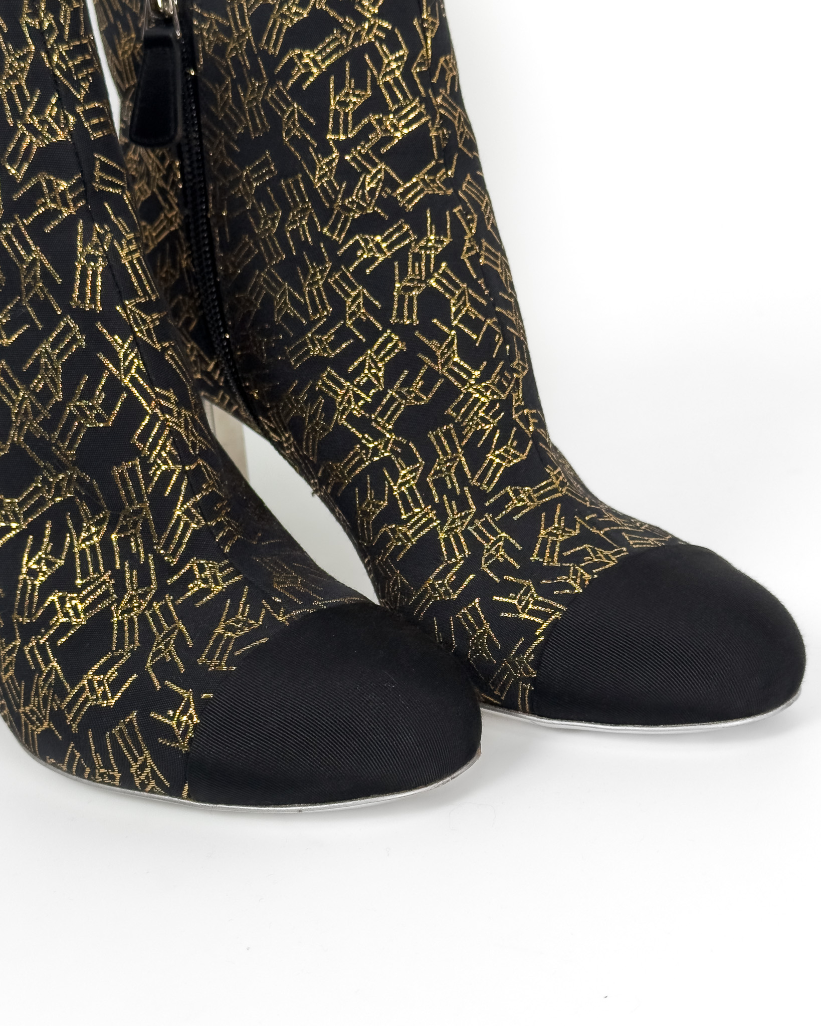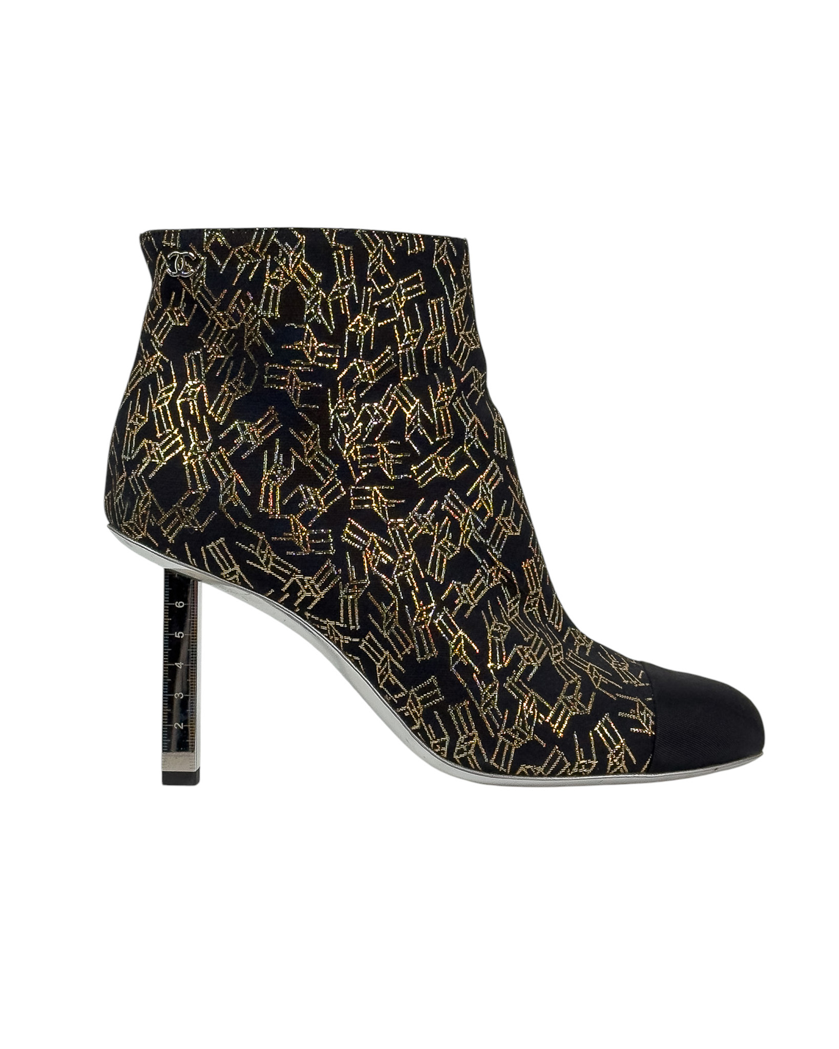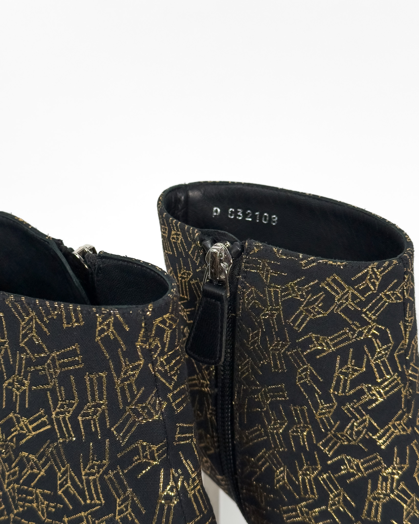 "Czarne materiałowe botki we wzór złotych krzeseł, srebrny obcas z imitacją centymetra, zaokrąglone noski, delikatne srebrne logo marki na wykończeniu cholewki, zapinane na suwak od wewnętrznej strony, worek przeciwkurzowy w komplecie. Stan bardzo dobry, delikatne przetarcia na podeszwie. Rozmiar 37, wysokość obcasa 7cm."