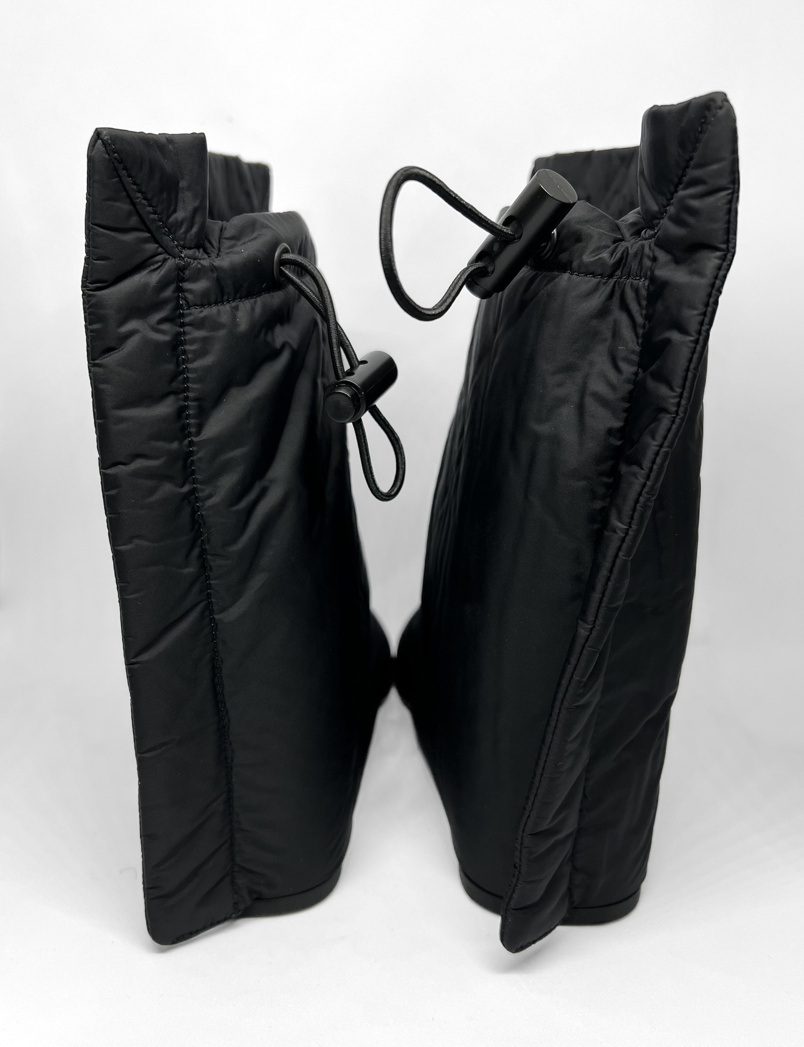 "Czarne skórzane botki na obcasie, całe pokryte puchowym materiałem, regulowany ściągacz na górze. Rozmiar 39, nowe."