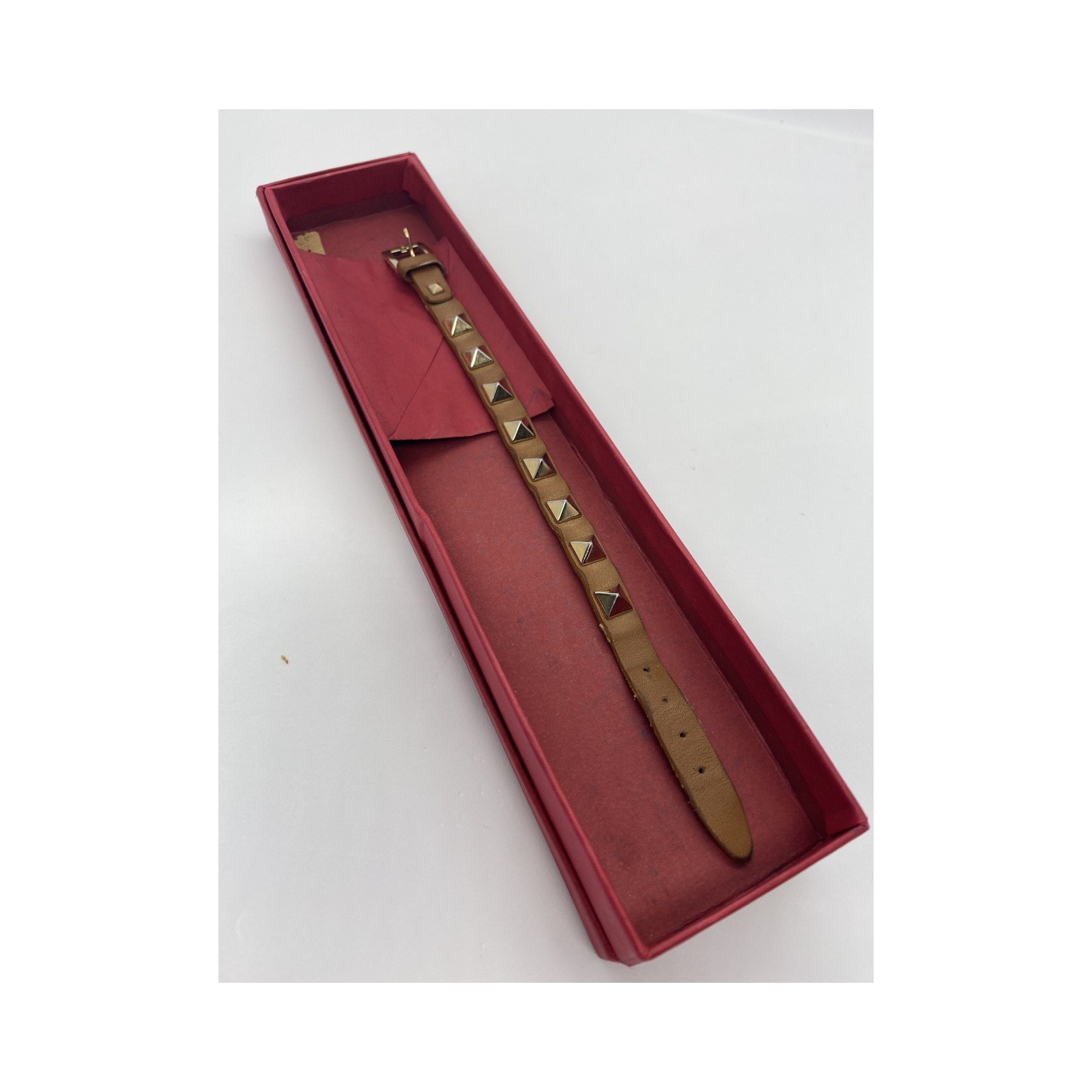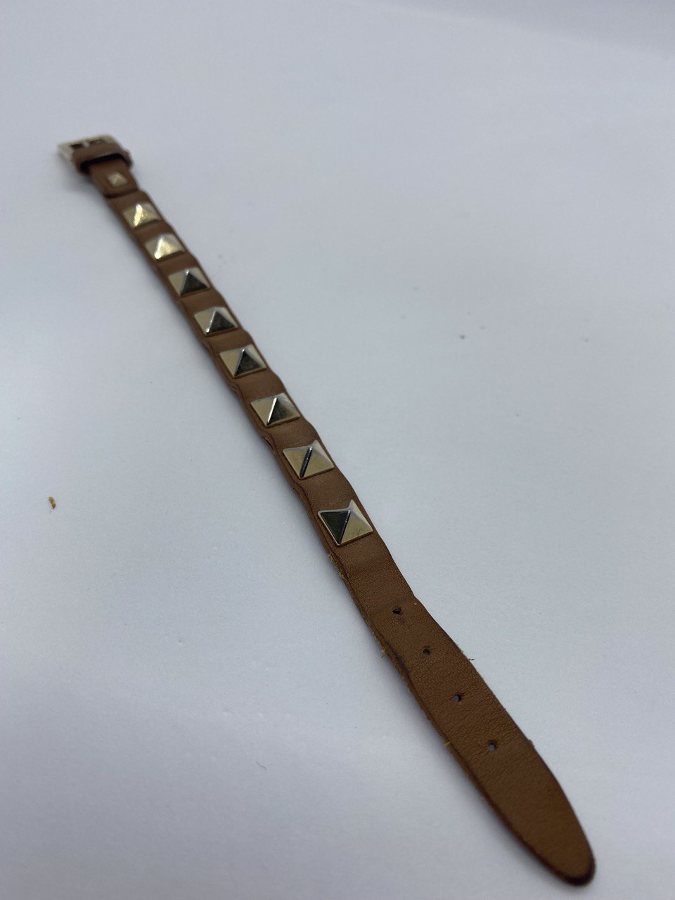 "karmelowa cienka, skórzana bransoletka nabijana ćwiekami, mocno używana"