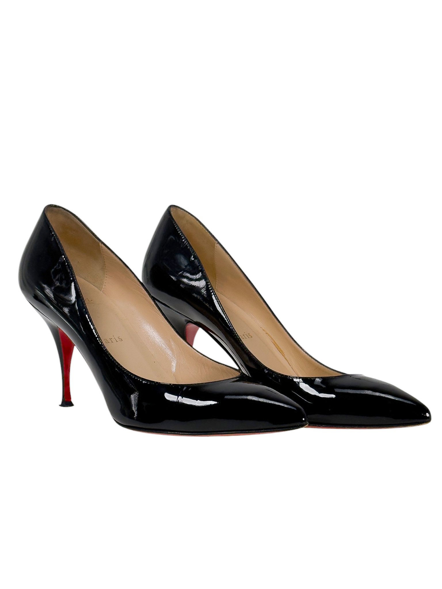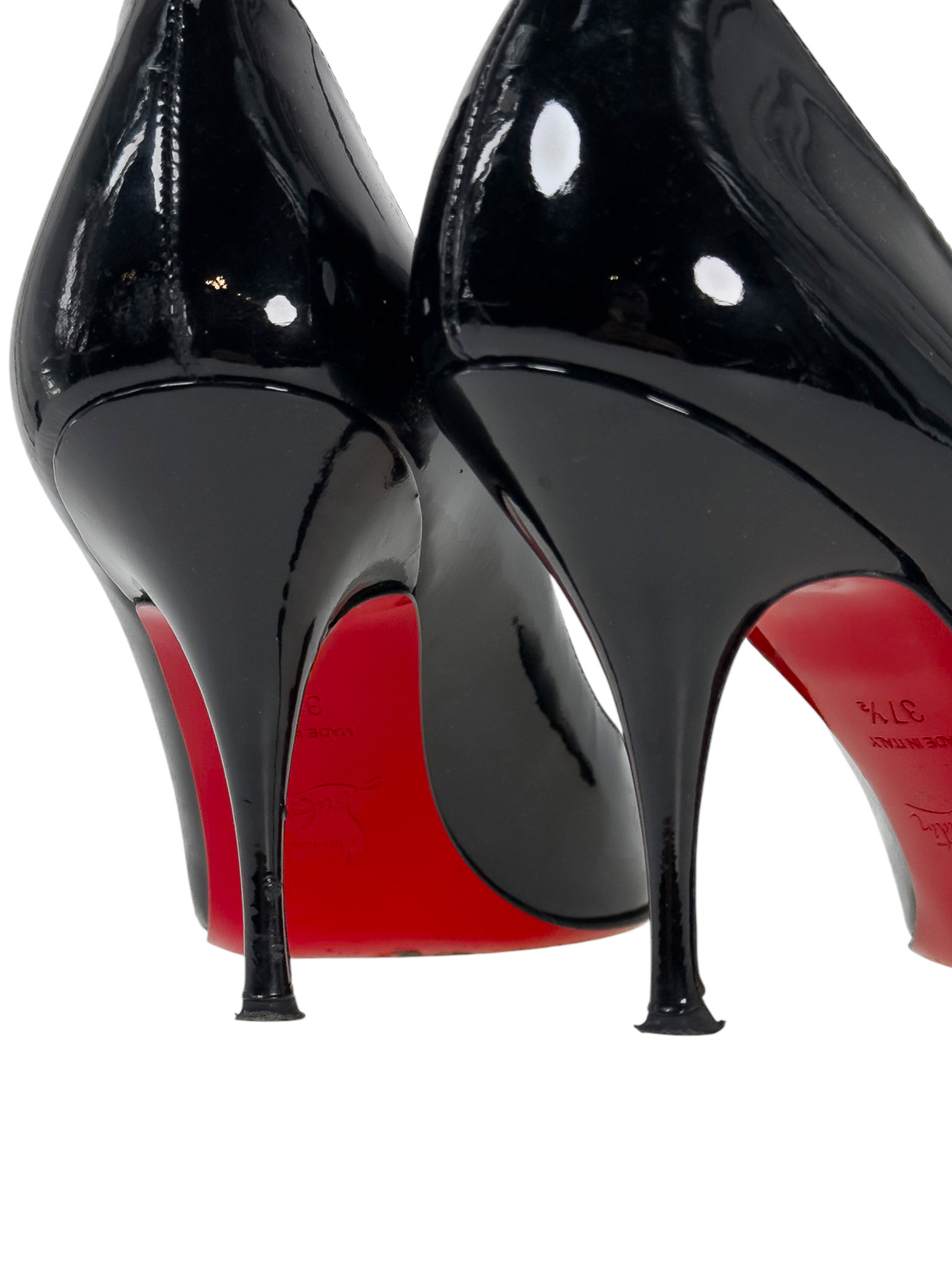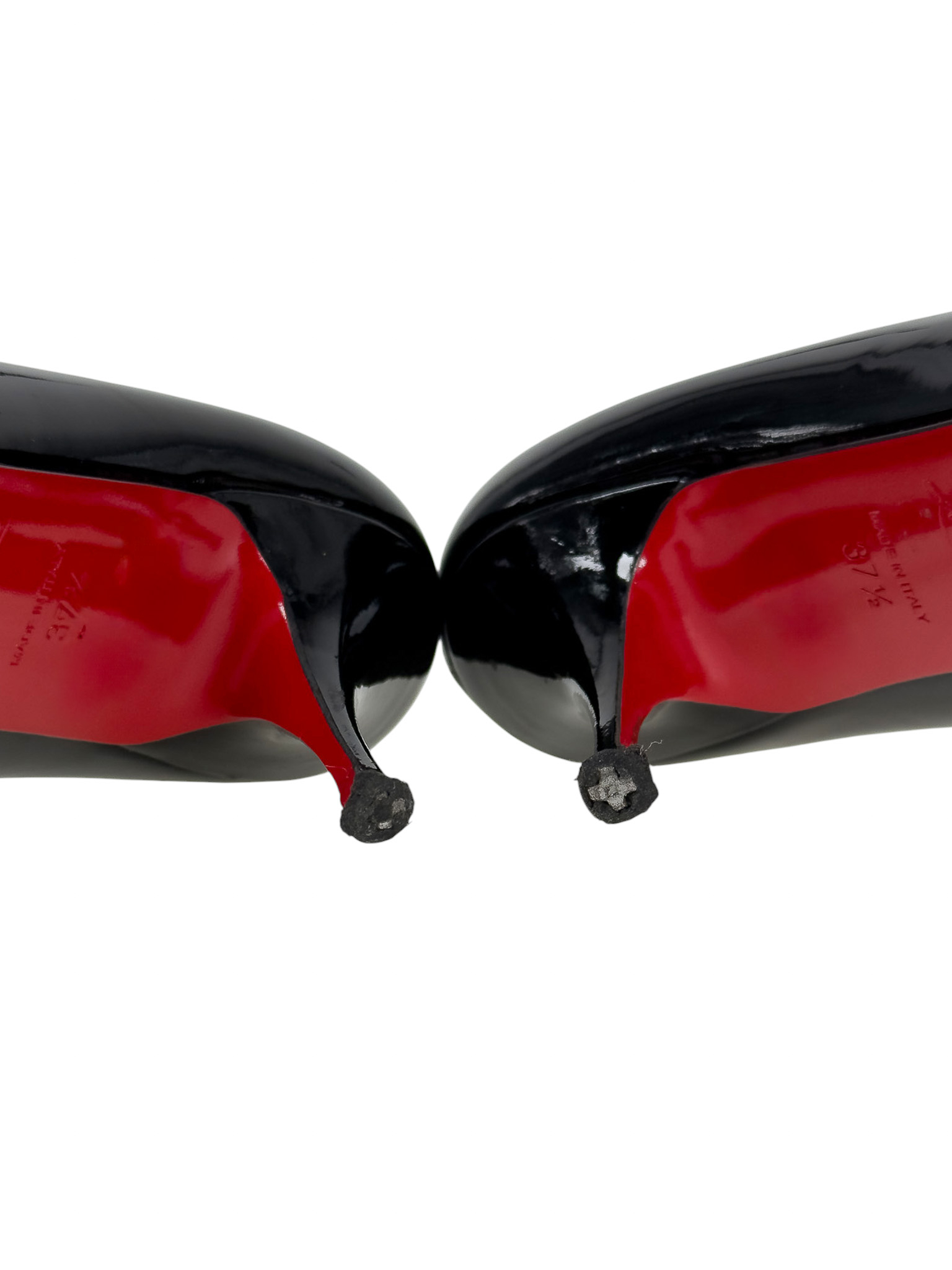 "Klasyczne czarne szpilki wykonane z lakierowanej skóry, nosek w szpic, czerwona podeszwa, charakterystyczna dla marki. Stan dobry, posiadają delikatne ślady użytkowania, drobne przetarcia i zarysowania szczególnie na szpilce. Małe przetarcie na noskach. Rozmiar 37,5, wysokość szpilki 6 cm."