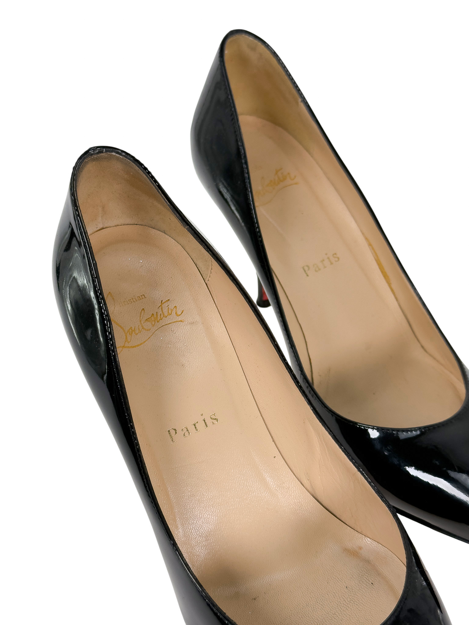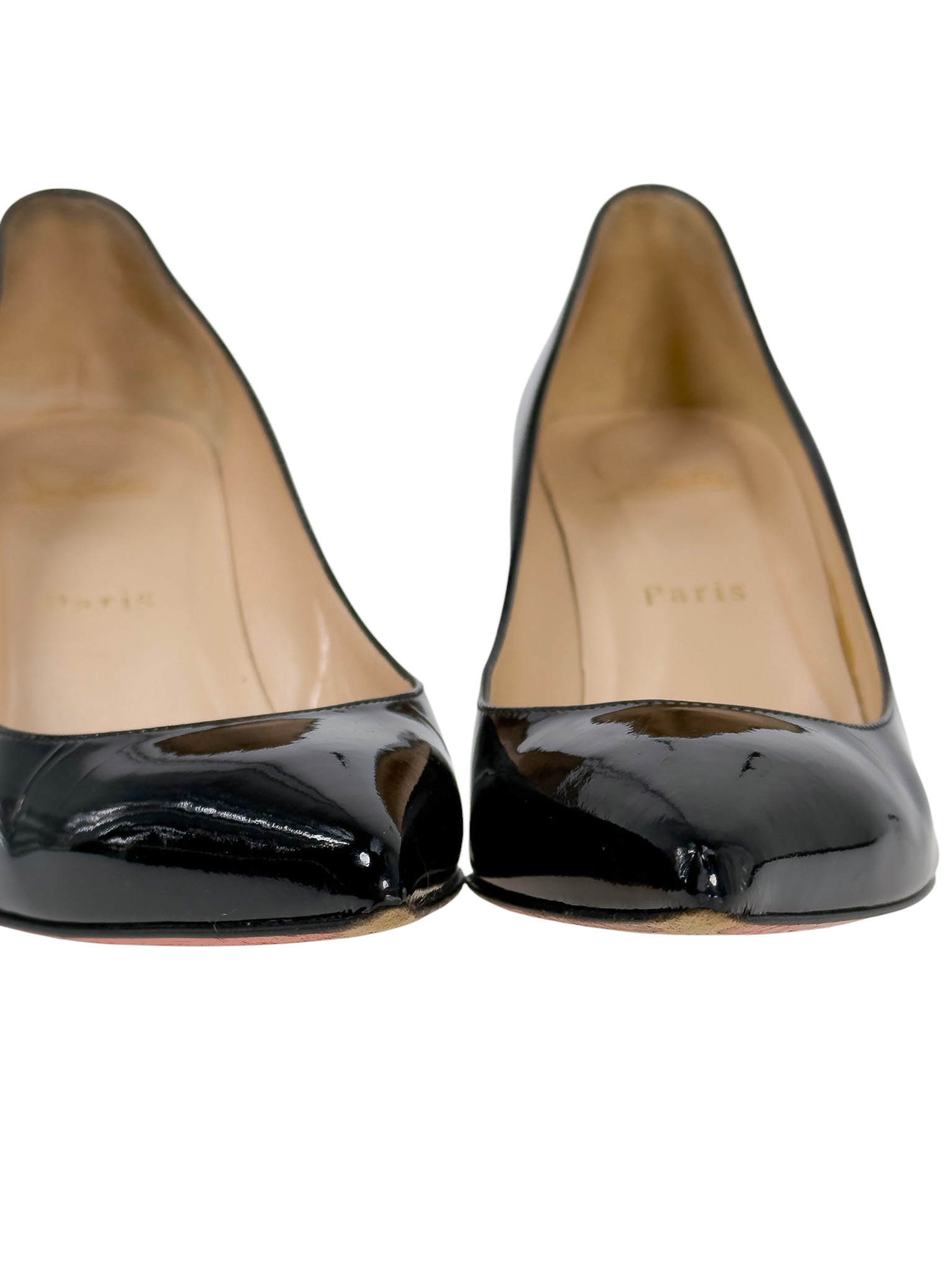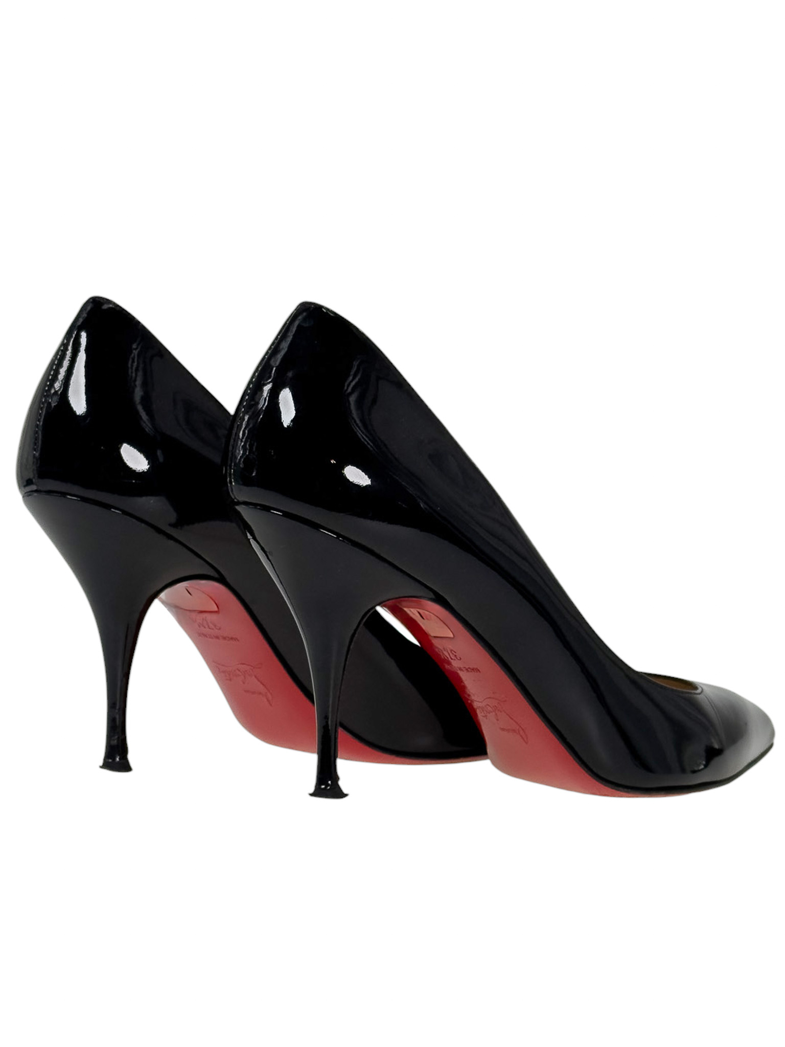 "Klasyczne czarne szpilki wykonane z lakierowanej skóry, nosek w szpic, czerwona podeszwa, charakterystyczna dla marki. Stan dobry, posiadają delikatne ślady użytkowania, drobne przetarcia i zarysowania szczególnie na szpilce. Małe przetarcie na noskach. Rozmiar 37,5, wysokość szpilki 6 cm."